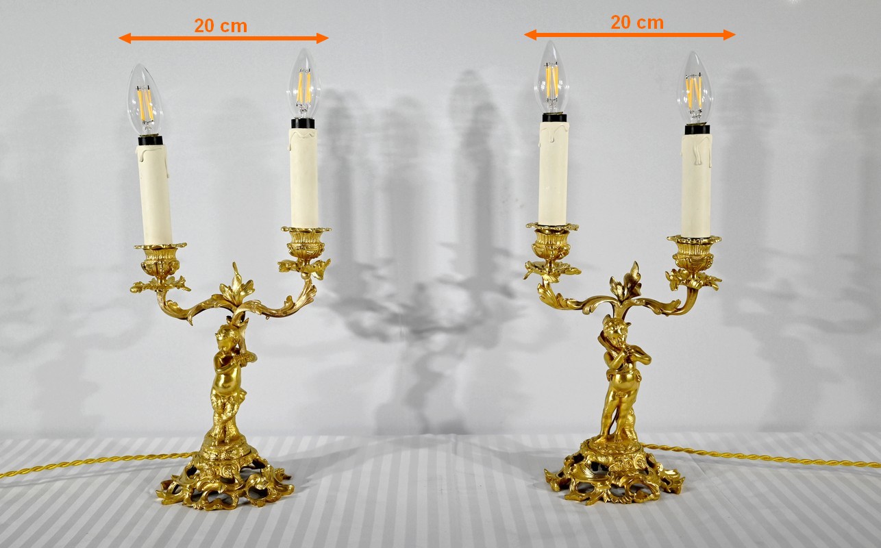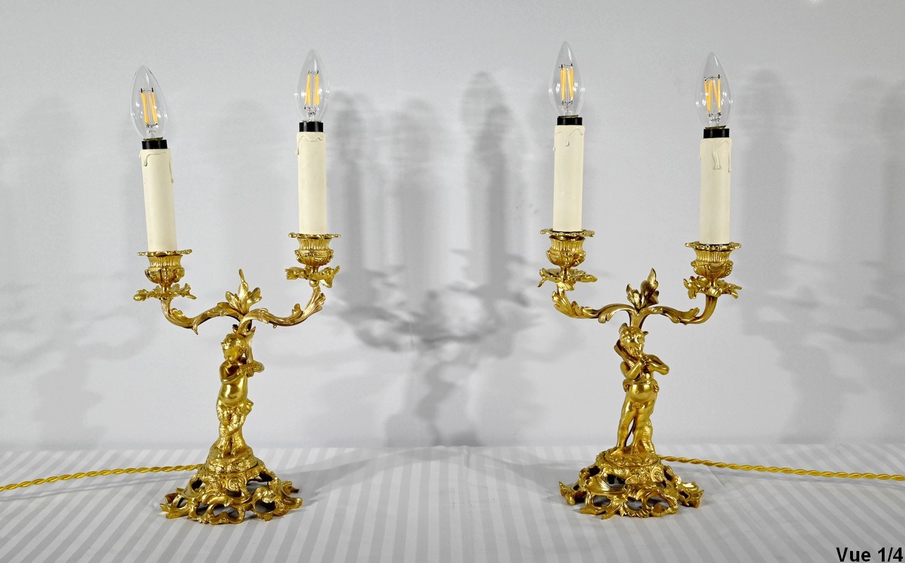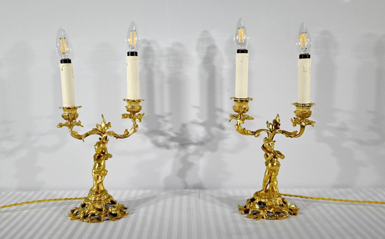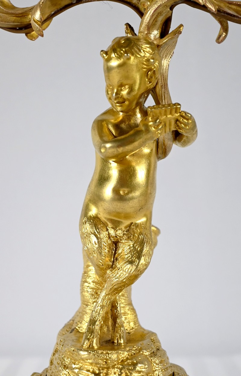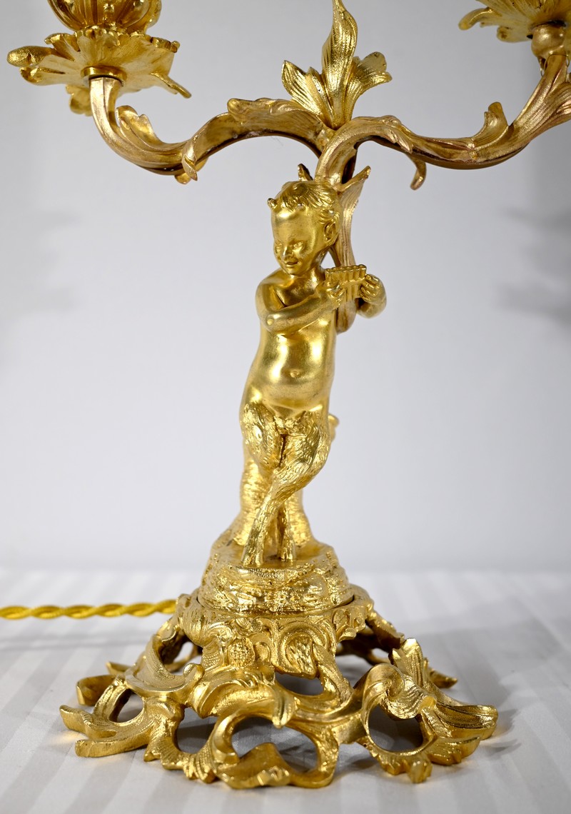 Superbe paire de flambeaux électrifiés, en bronze doré, figurant un satyre à la flute de pan et un jeune enfant au serpent.