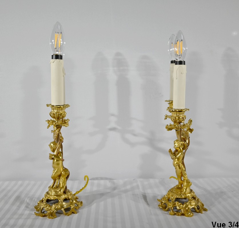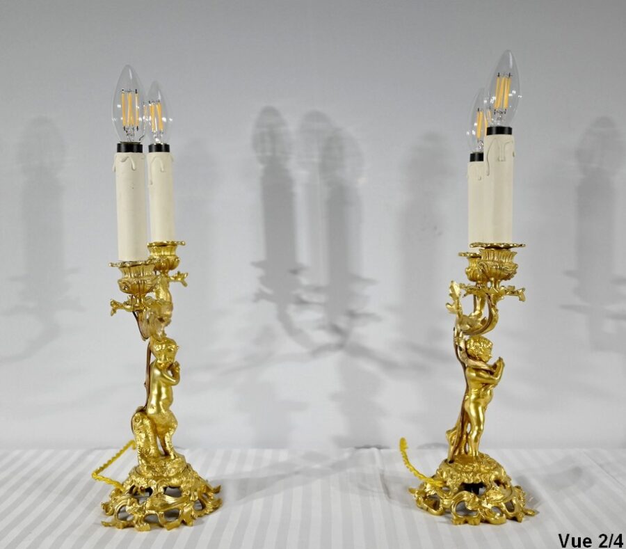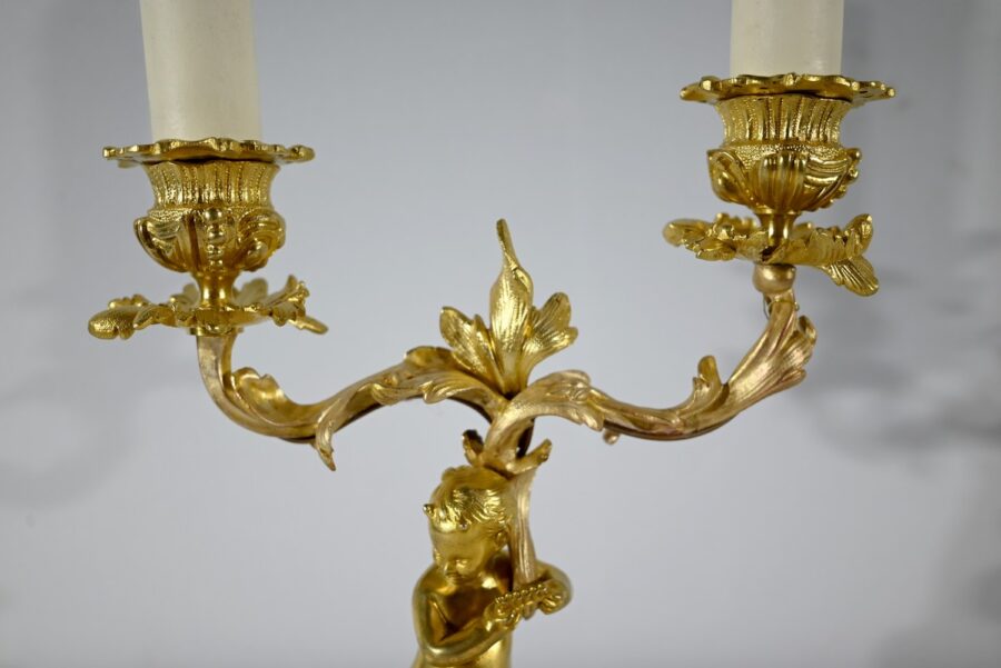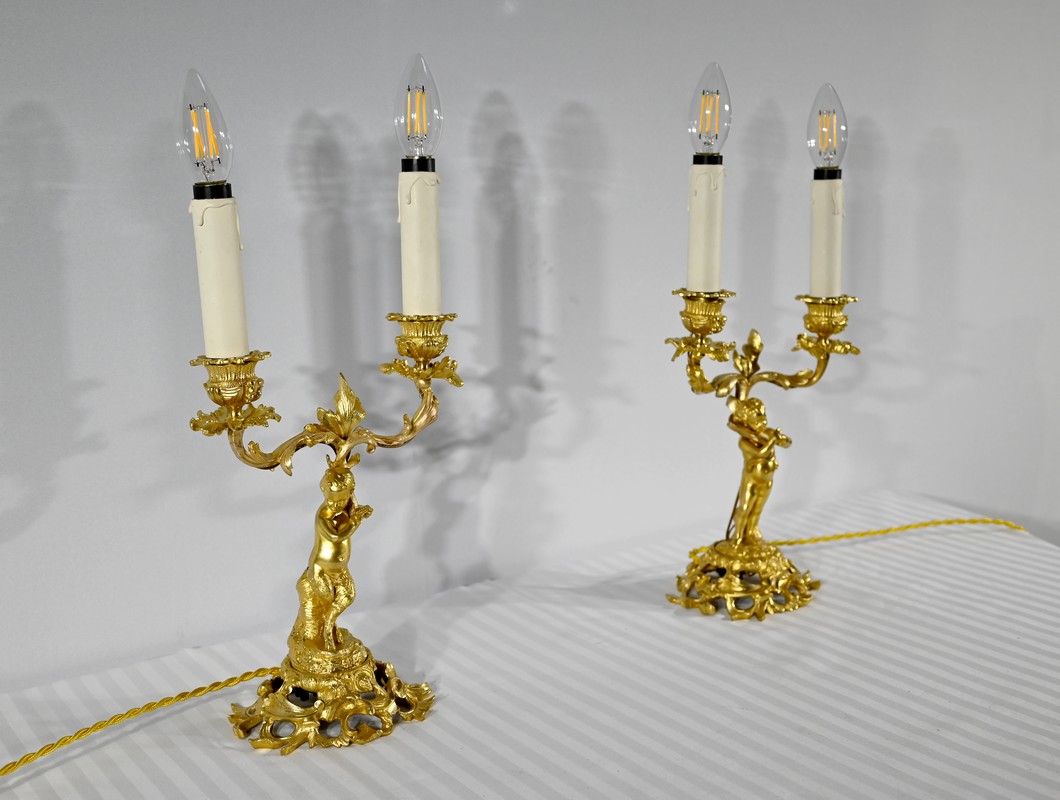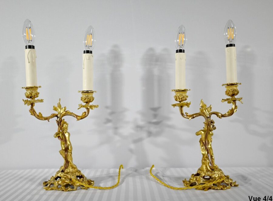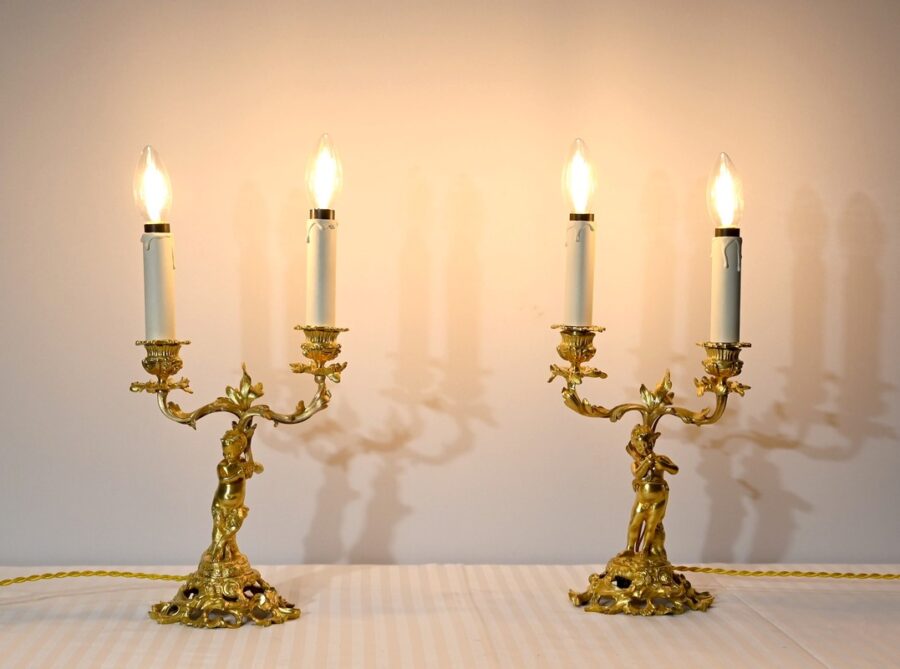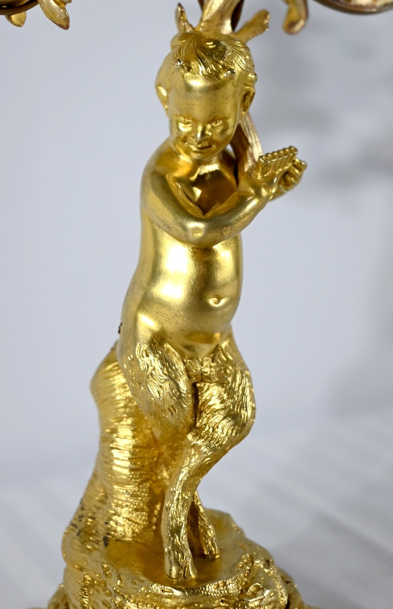 Superbe paire de flambeaux électrifiés, en bronze doré, figurant un satyre à la flute de pan et un jeune enfant au serpent.