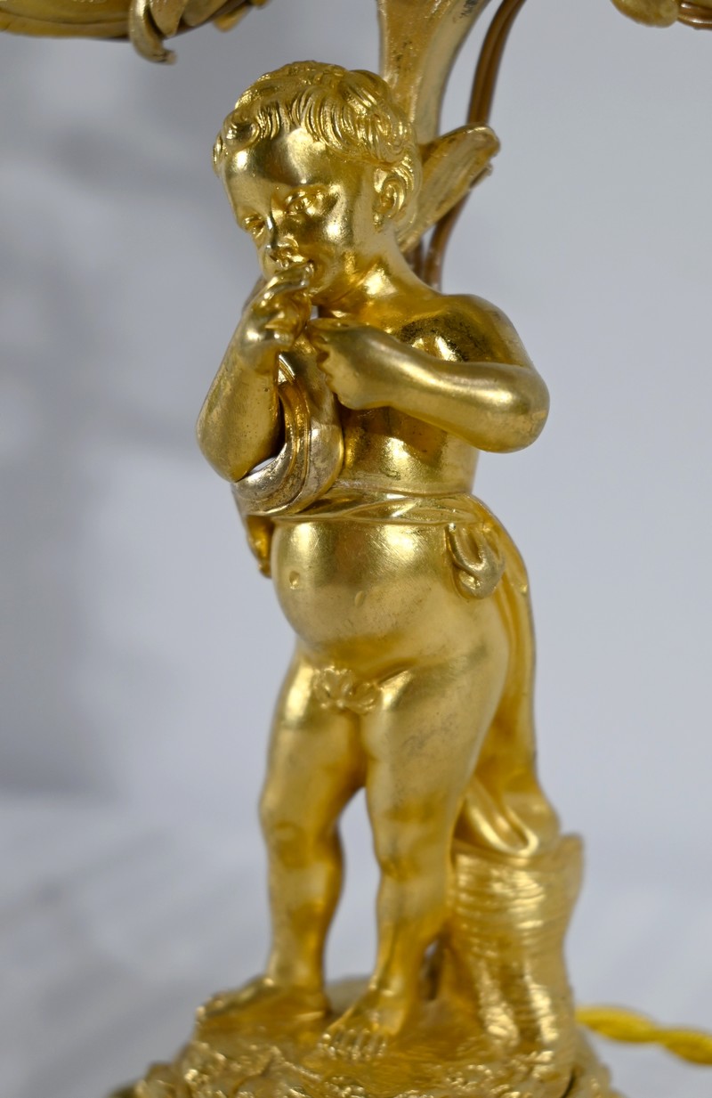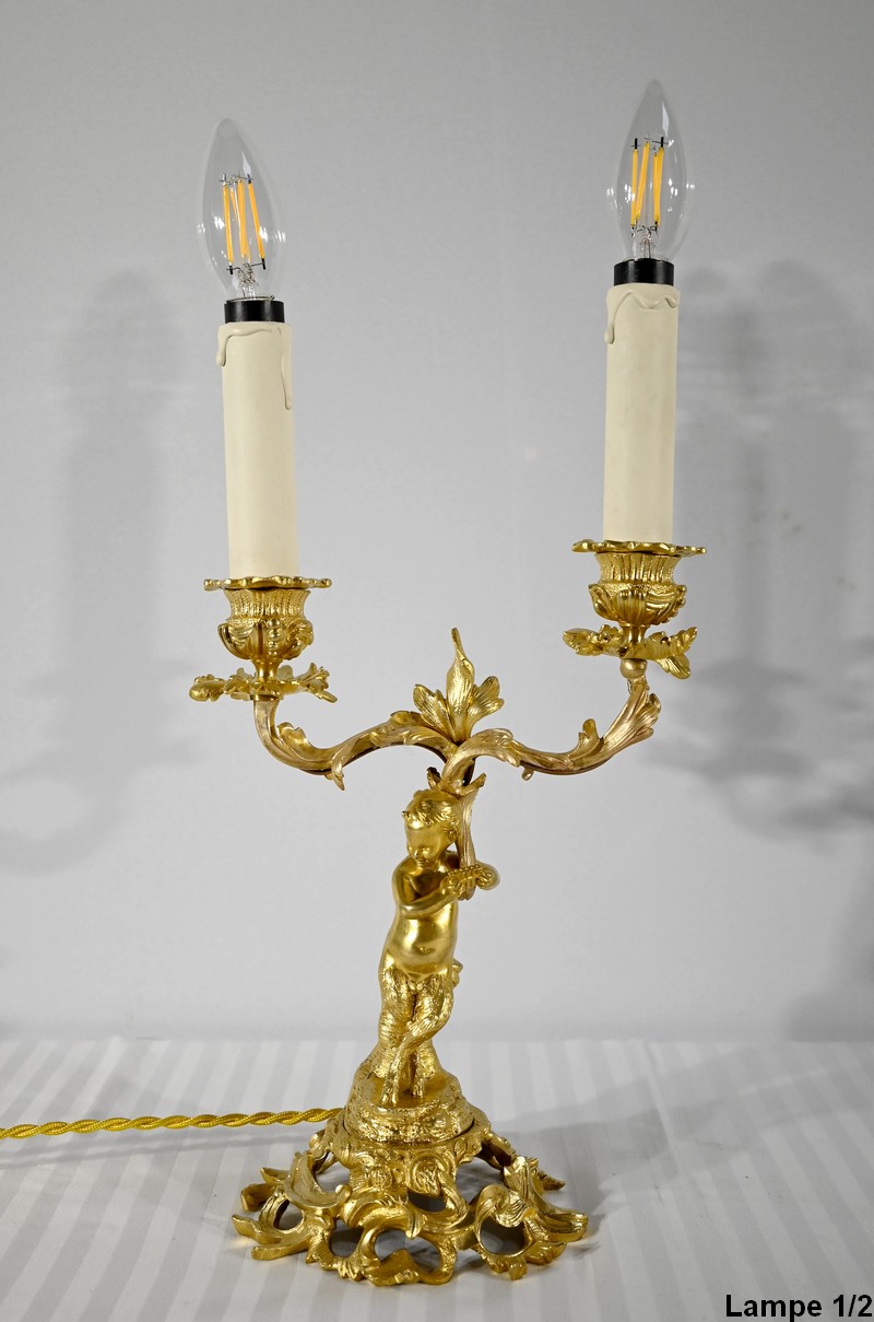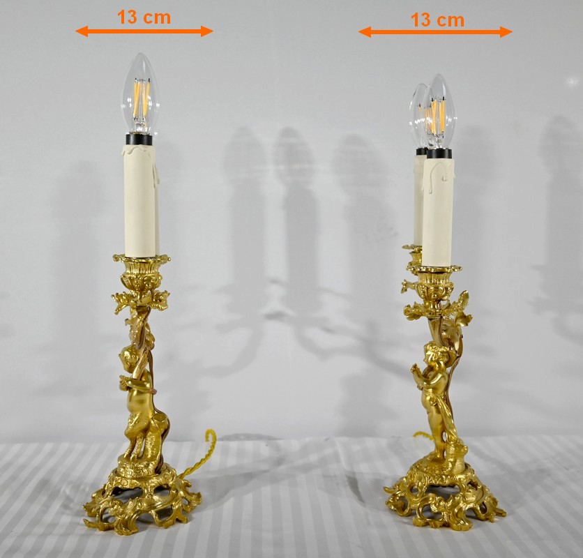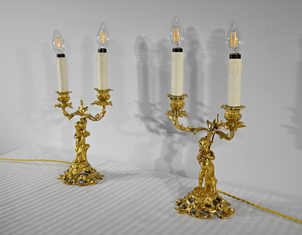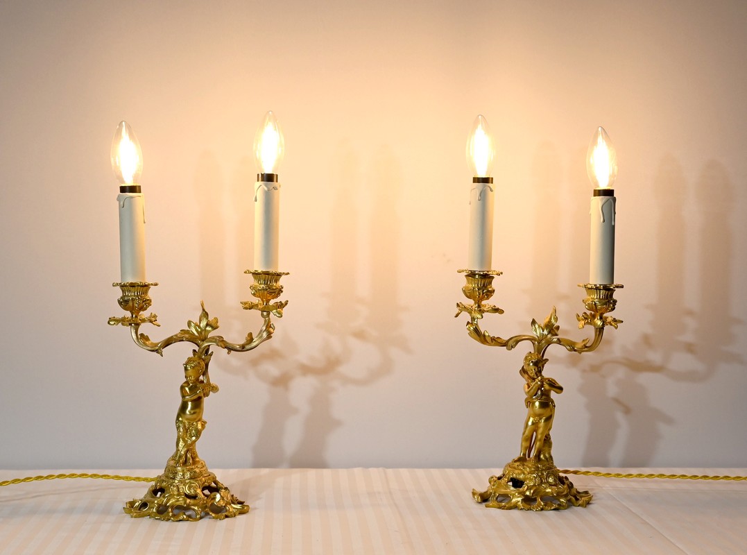 Superbe paire de flambeaux électrifiés, en bronze doré, figurant un satyre à la flute de pan et un jeune enfant au serpent.