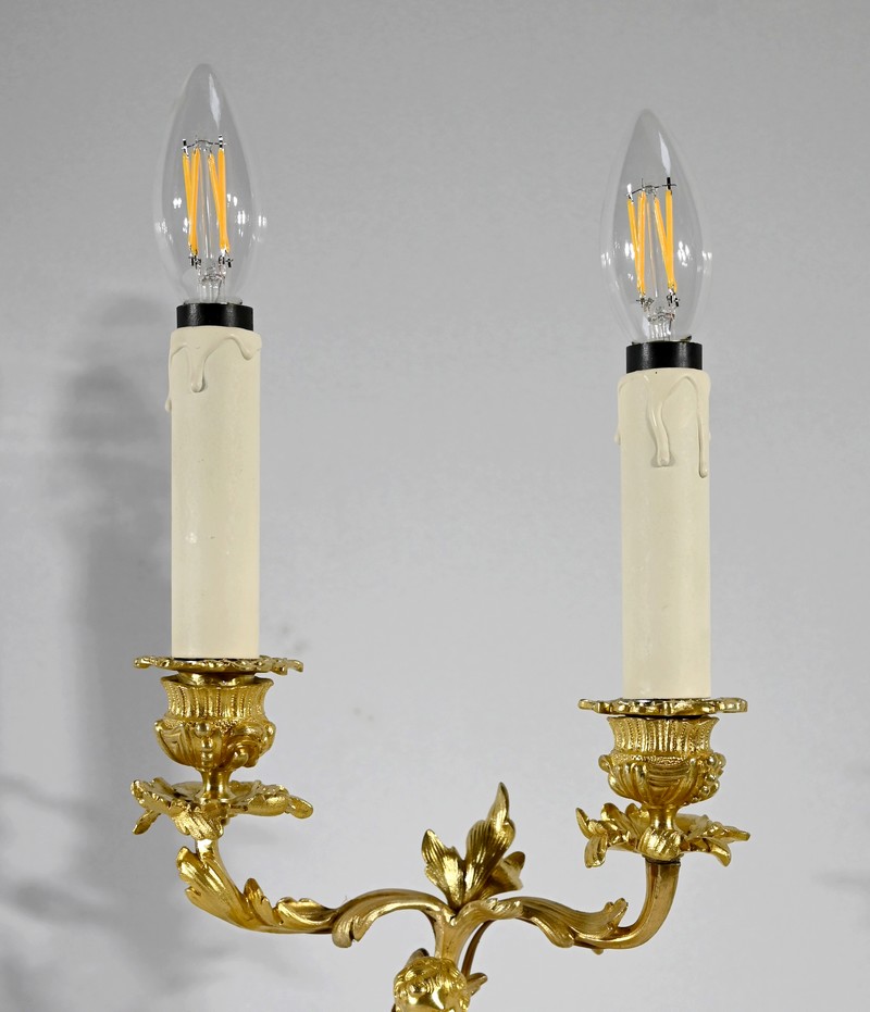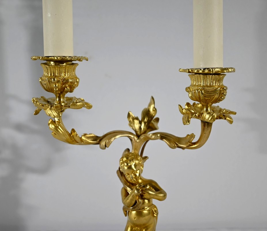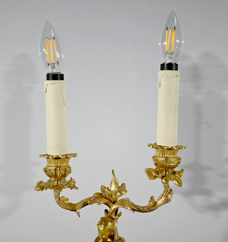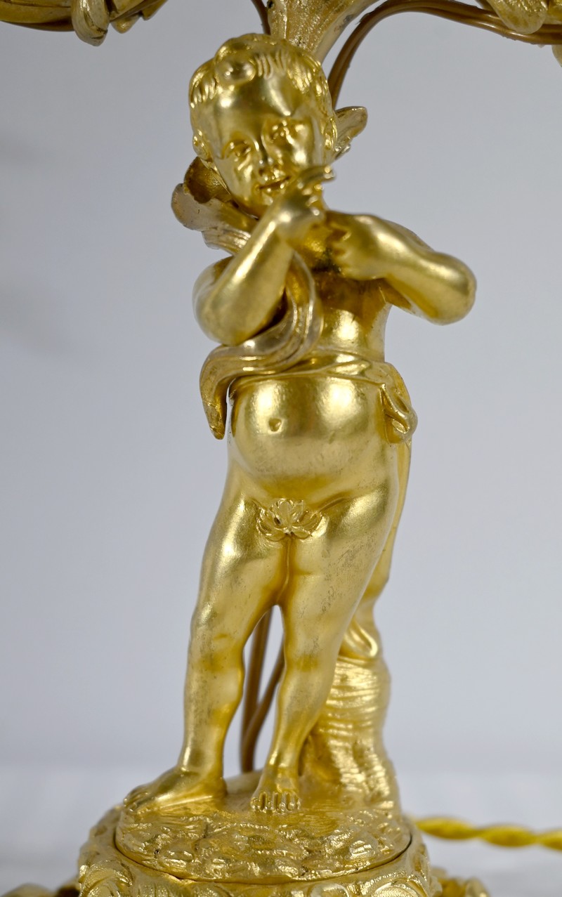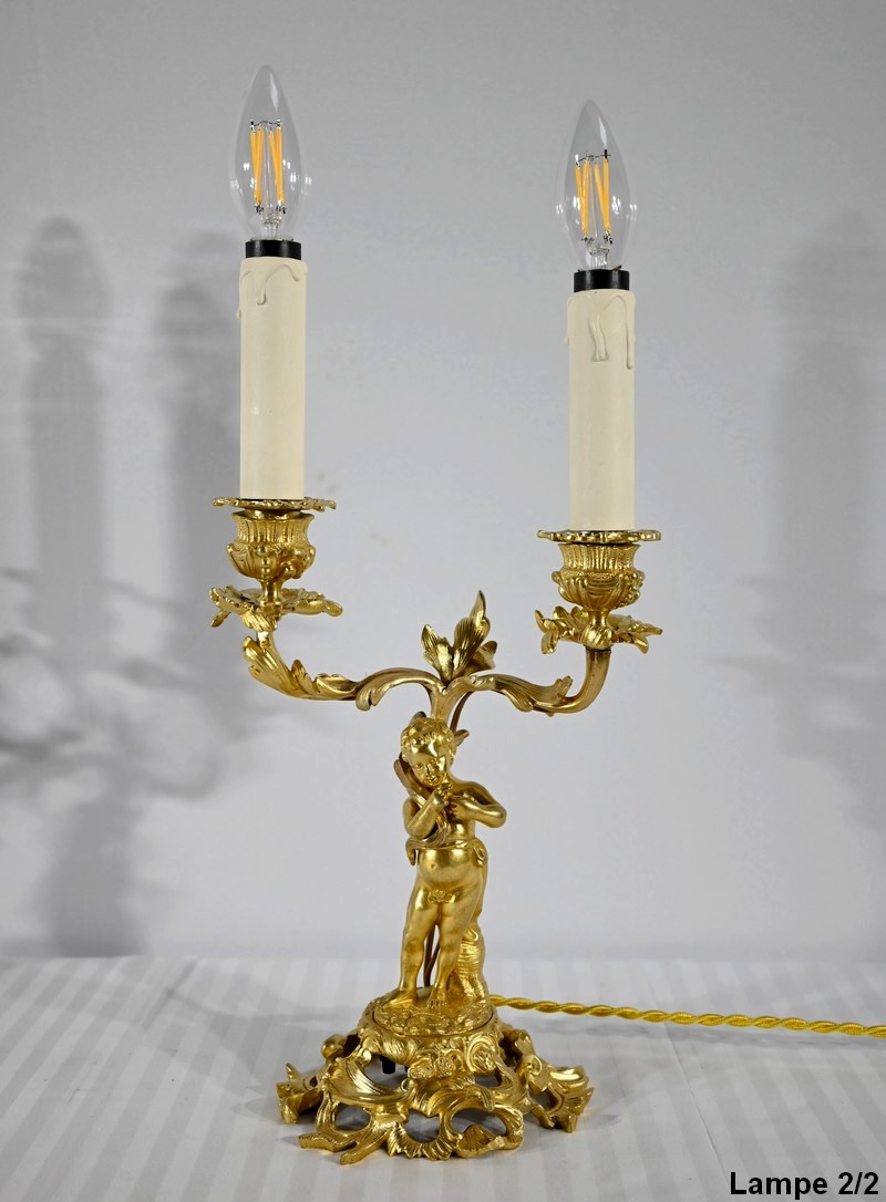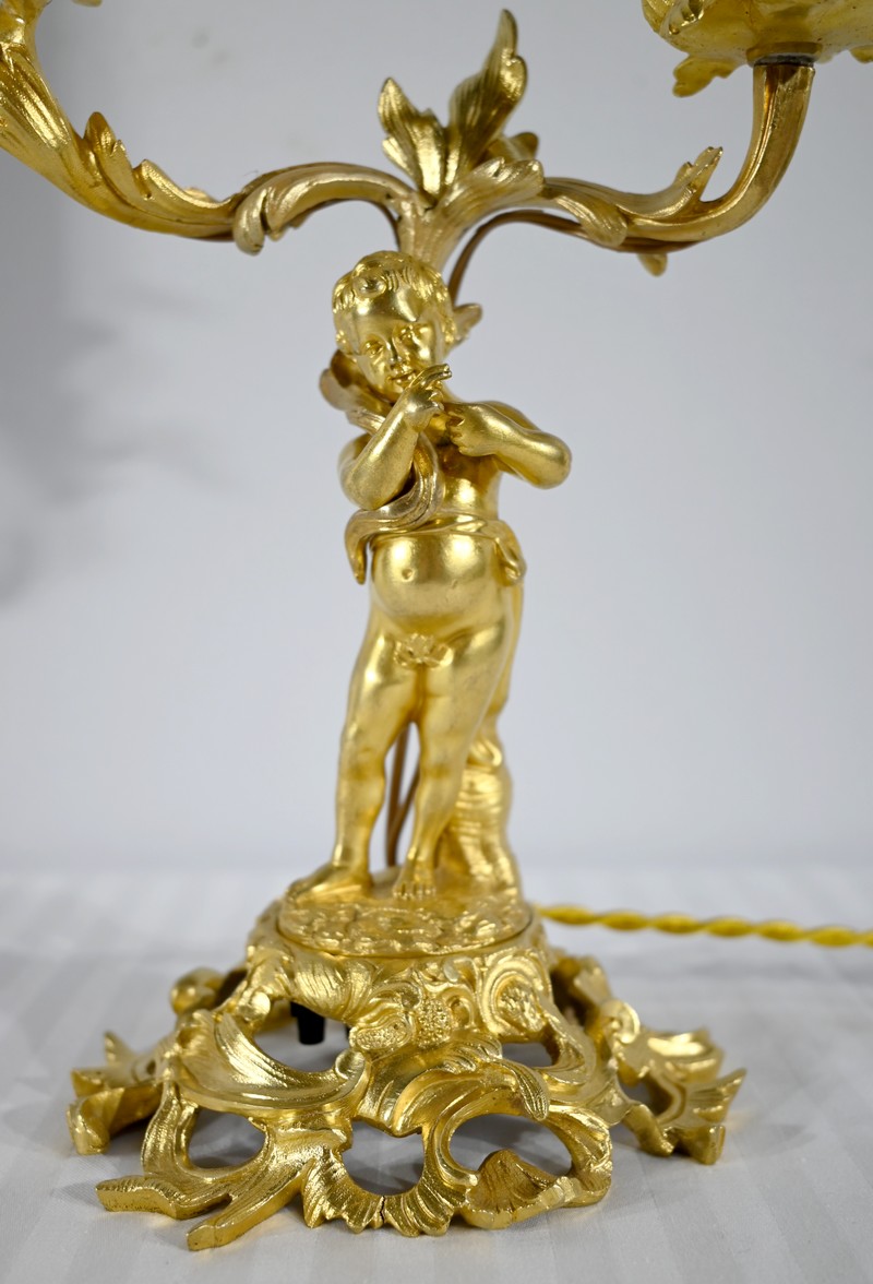 Superbe paire de flambeaux électrifiés, en bronze doré, figurant un satyre à la flute de pan et un jeune enfant au serpent.