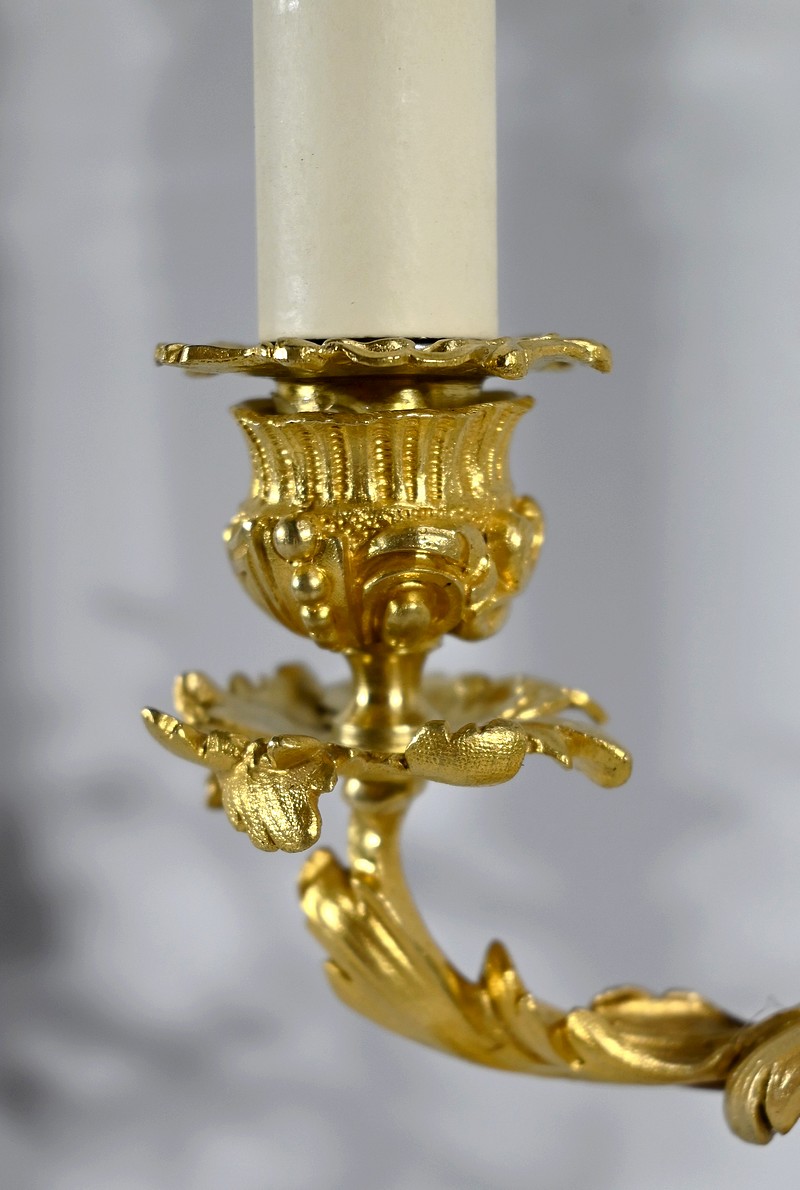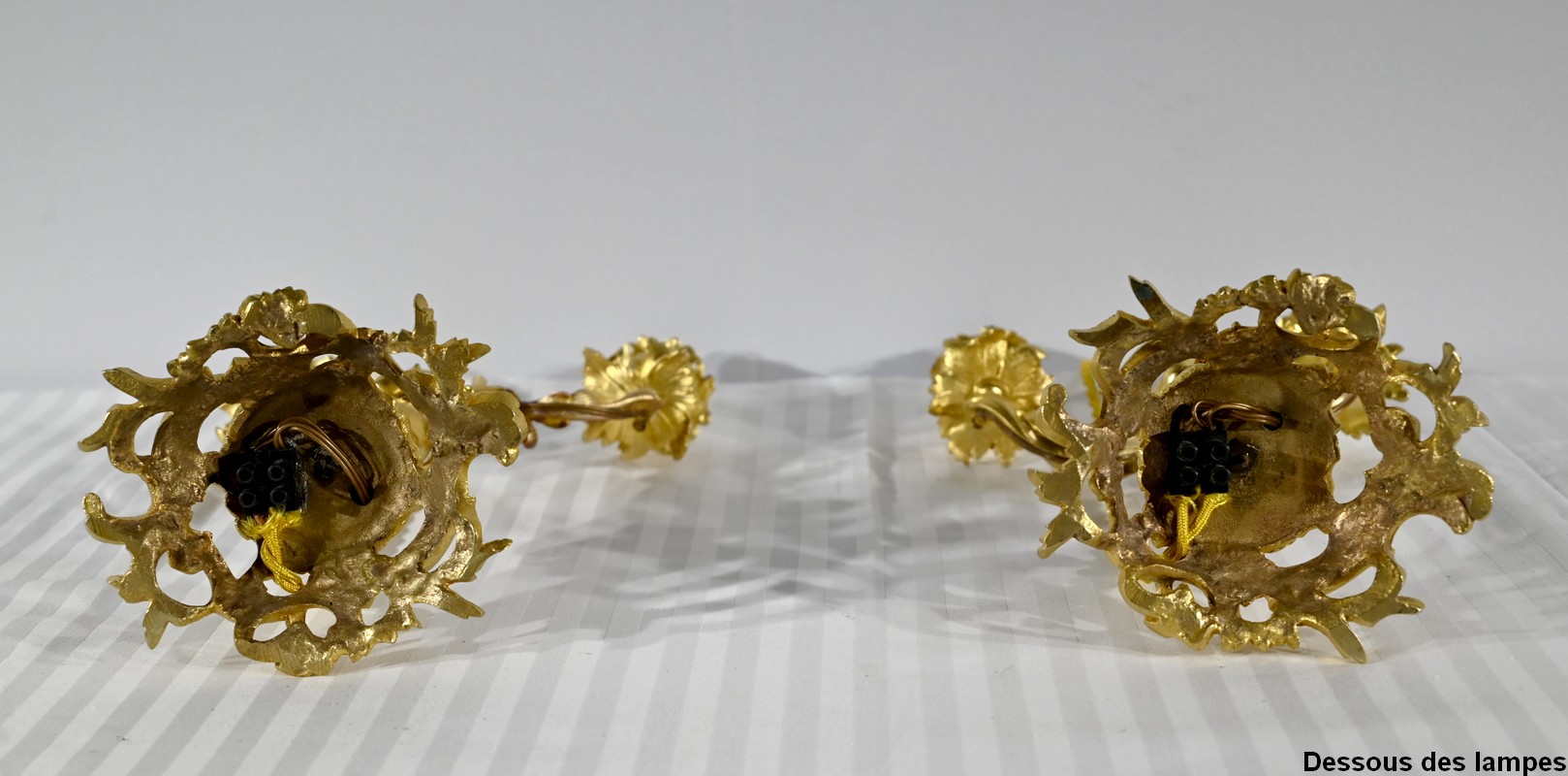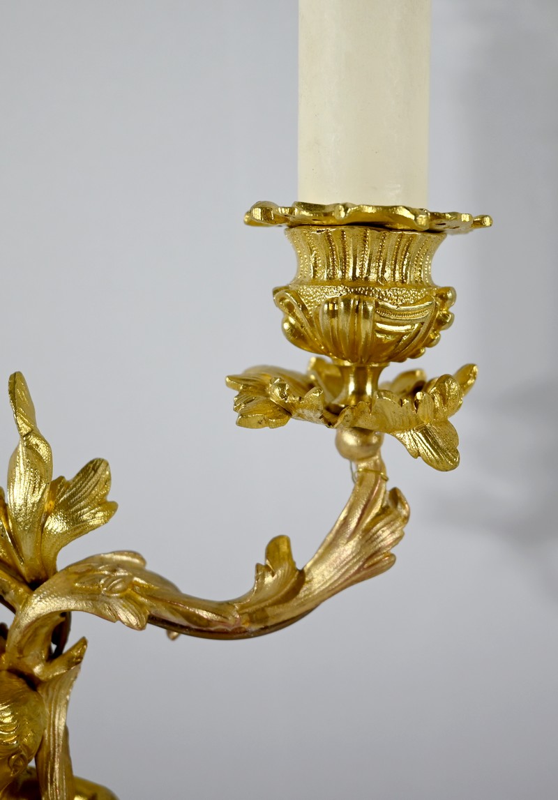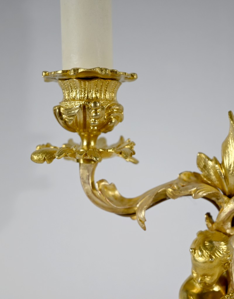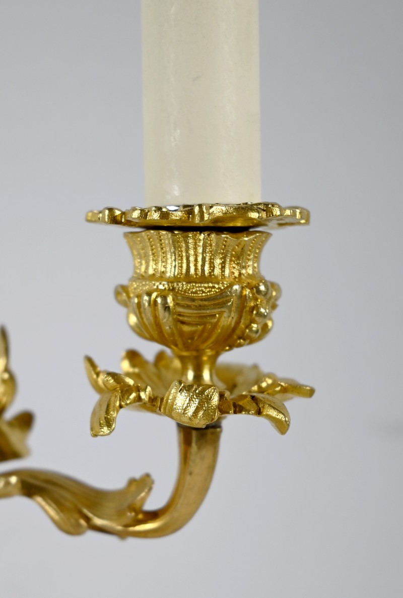 Chacun de ces chandeliers présente deux bras de lumières feuillagés qui viennent supporter des bougeoirs aux calices et bobèches ouvragés.