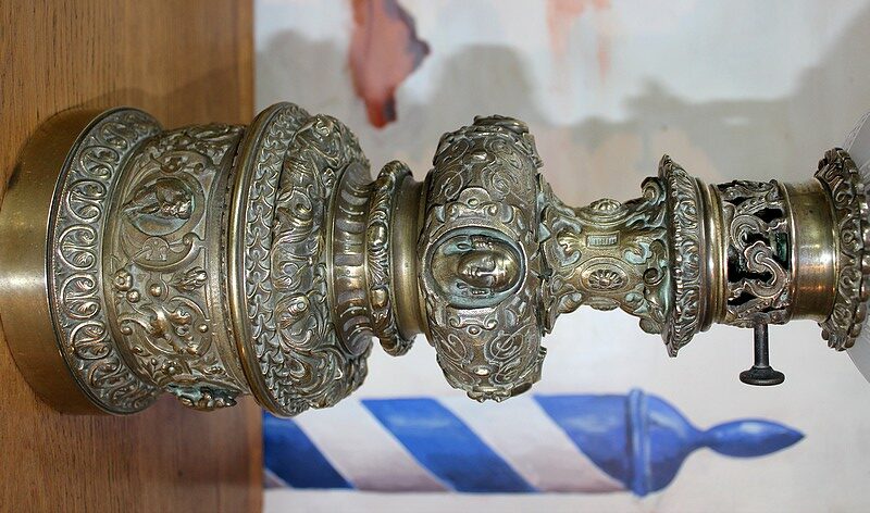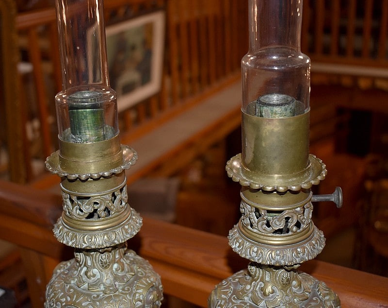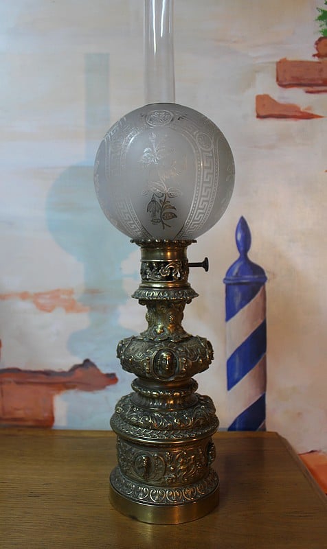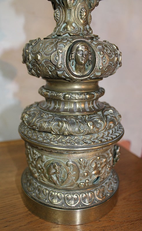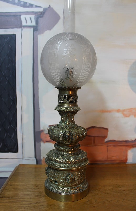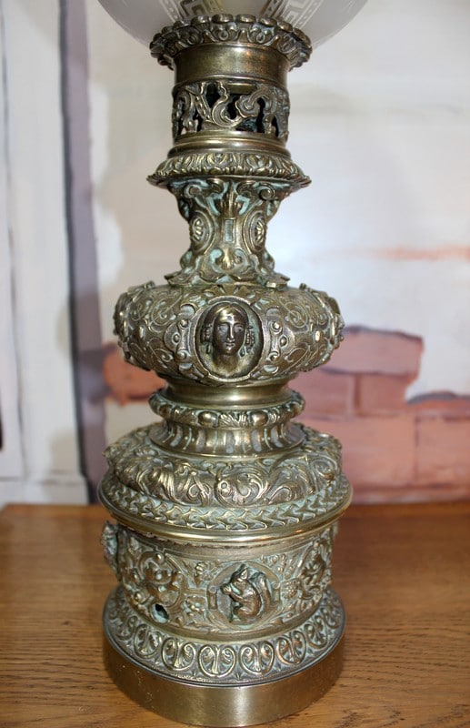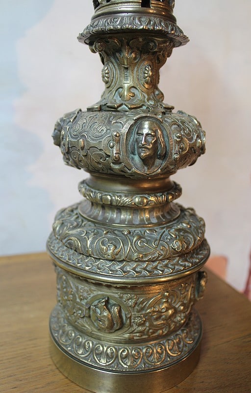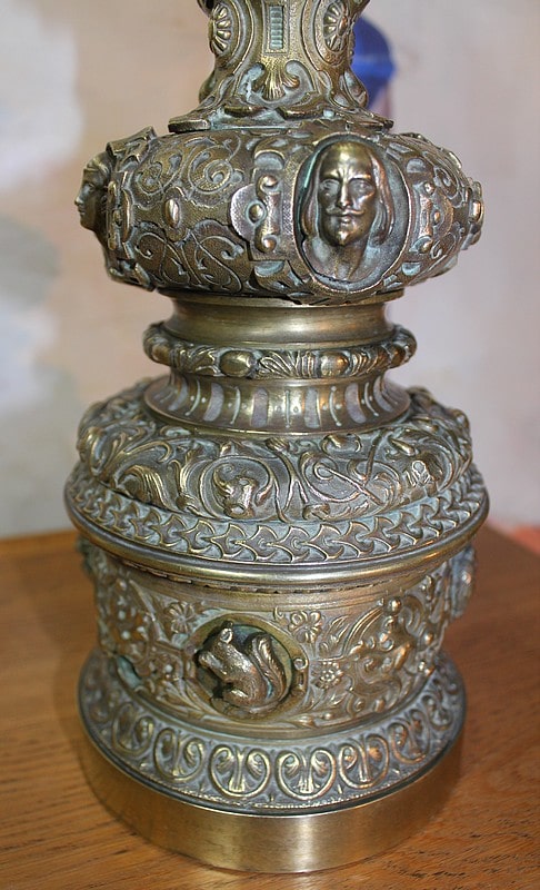 Paire de lampes à pétrole en bronze sculpté dans le goût Louis XIV, à décors de visages d’homme et de femme et d’animaux (écureuil et singe)
