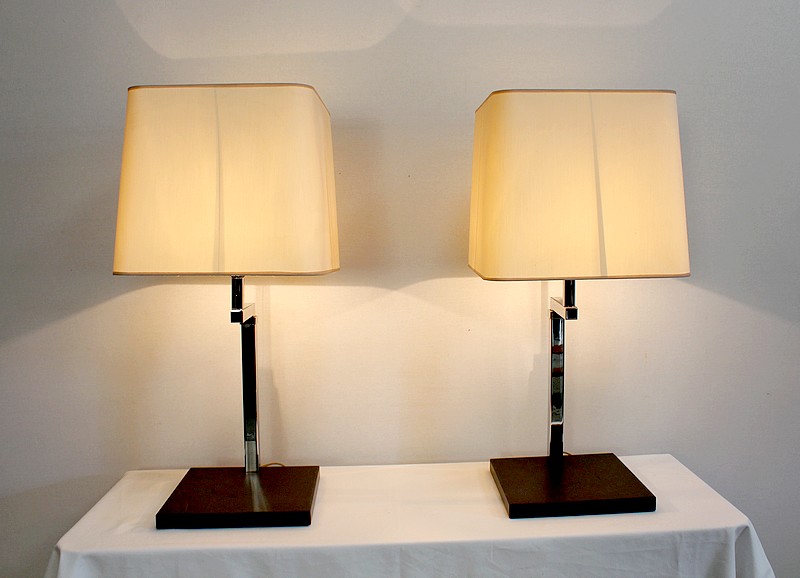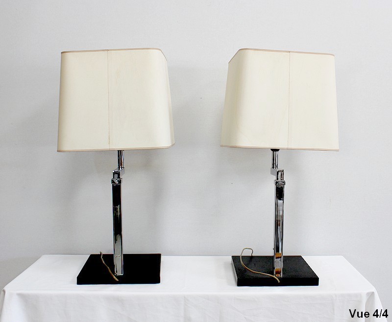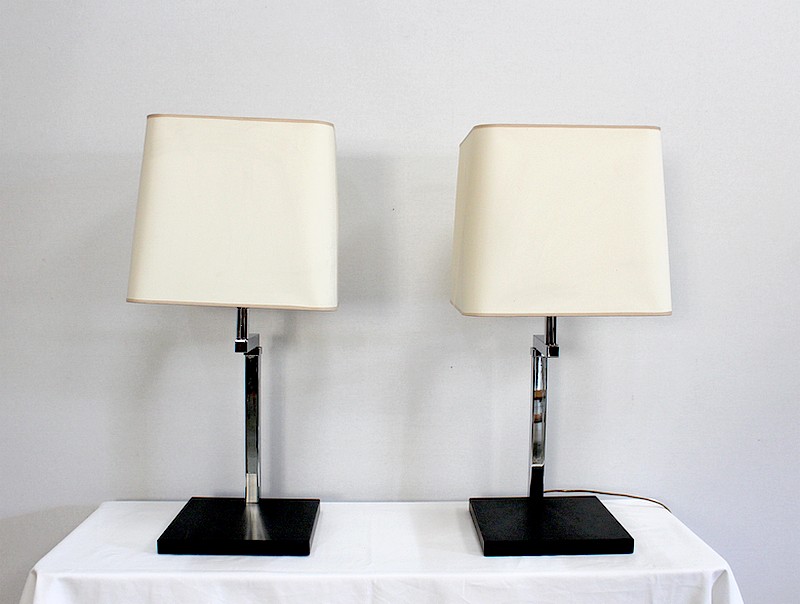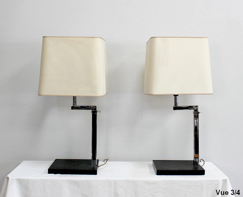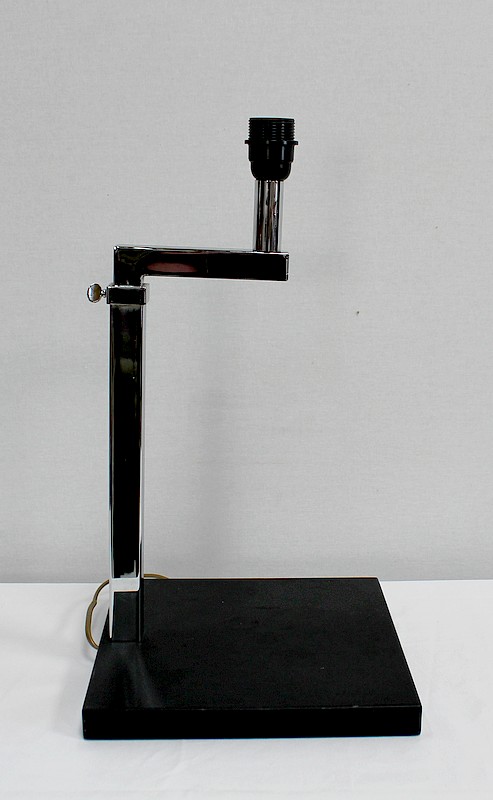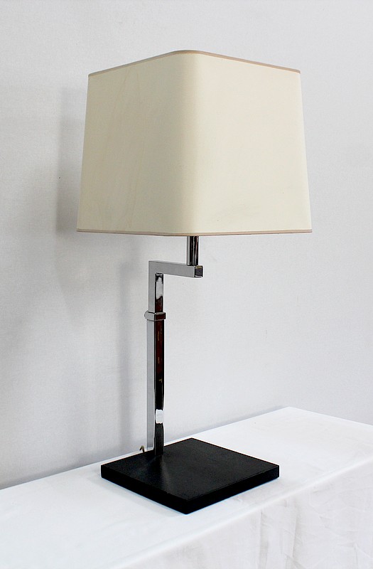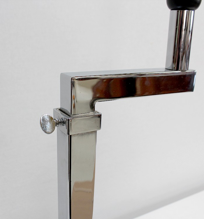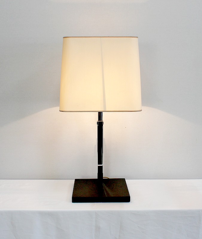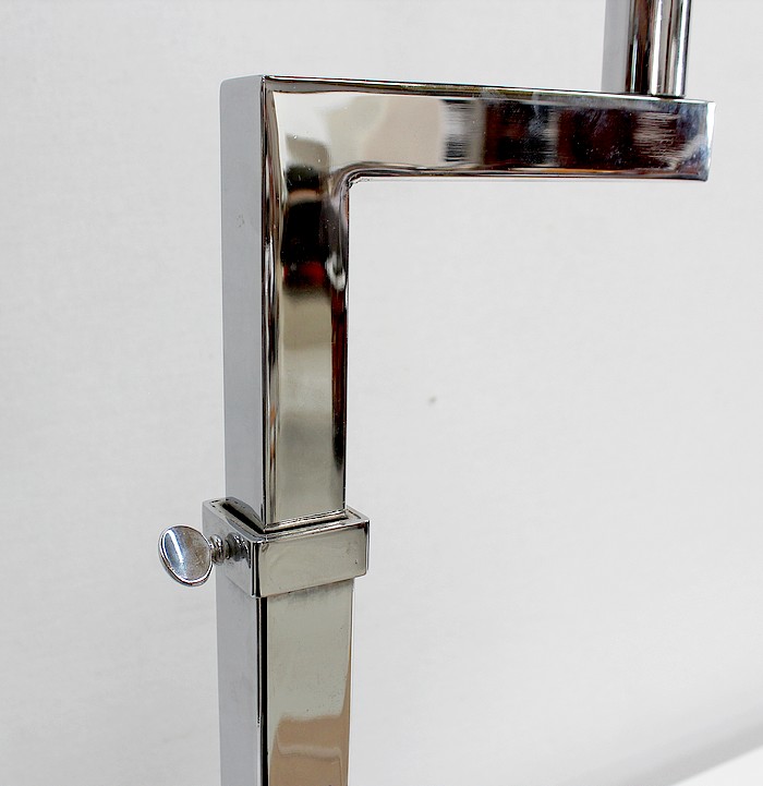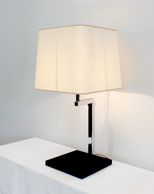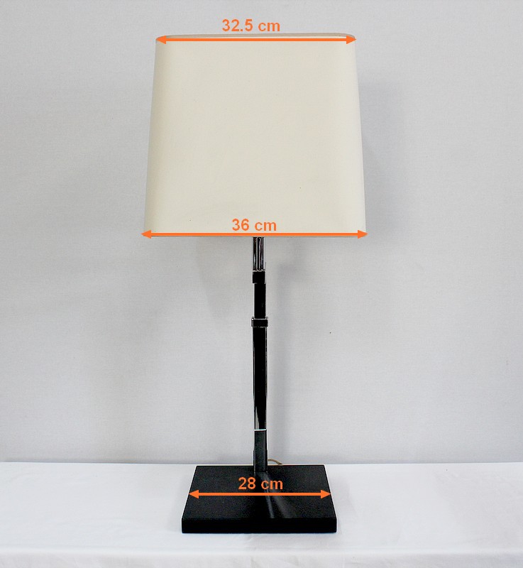 Ces Luminaires présentent un Socle Carré en Métal noir surmonté d’un Fût carré chromé Réglable en hauteur grâce à des vis à tête papillon.