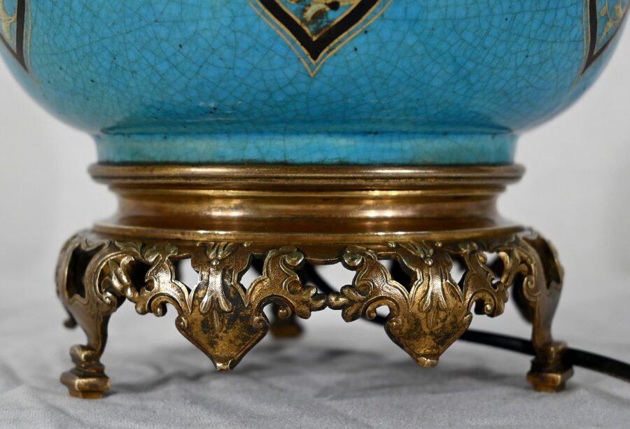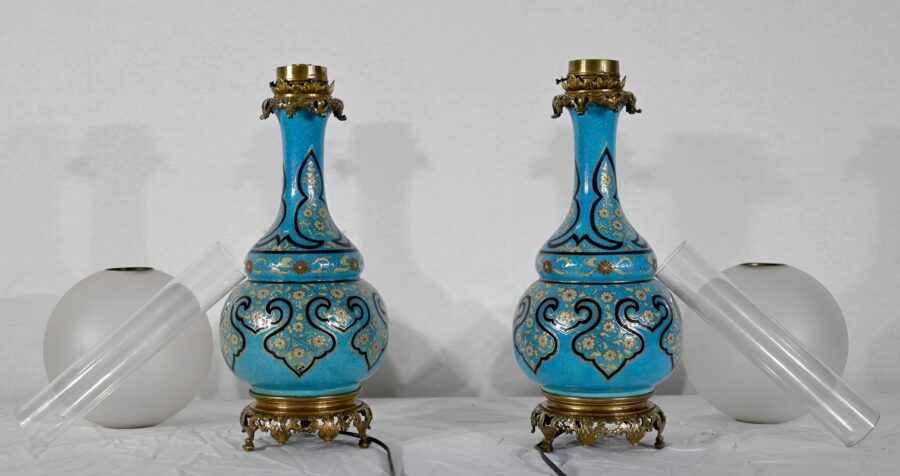 Les panses à double bulbe sont ornées de décors en relief de fleurs et de feuilles en émaux, sur fond couleur bleu céleste, soulignés par des motifs fantaisistes noirs et dorés. Les cols évasés sont sommés de larges collerettes, en bronze, ouvragées de feuilles d’acanthe à enroulement et de rinceaux. Ces luminaires reposent sur des socles tripodes, à gorge, ouvragés de petits bourgeons et d’éléments végétaux.