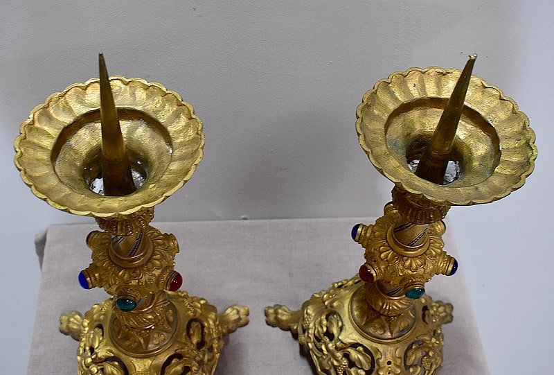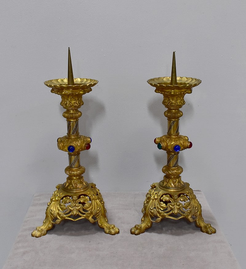Paire de pique-cierges d’église en bronze et laiton mouluré et ciselé.