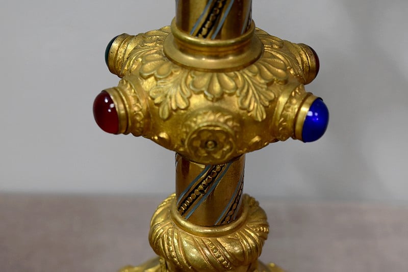 Le pied principal est orné en son centre d’une décoration arborant des demi-perles de verre colorées de bleu, vert et rouge. Sur un des pique-cierges, il manque un bouton en verre de couleur verte.