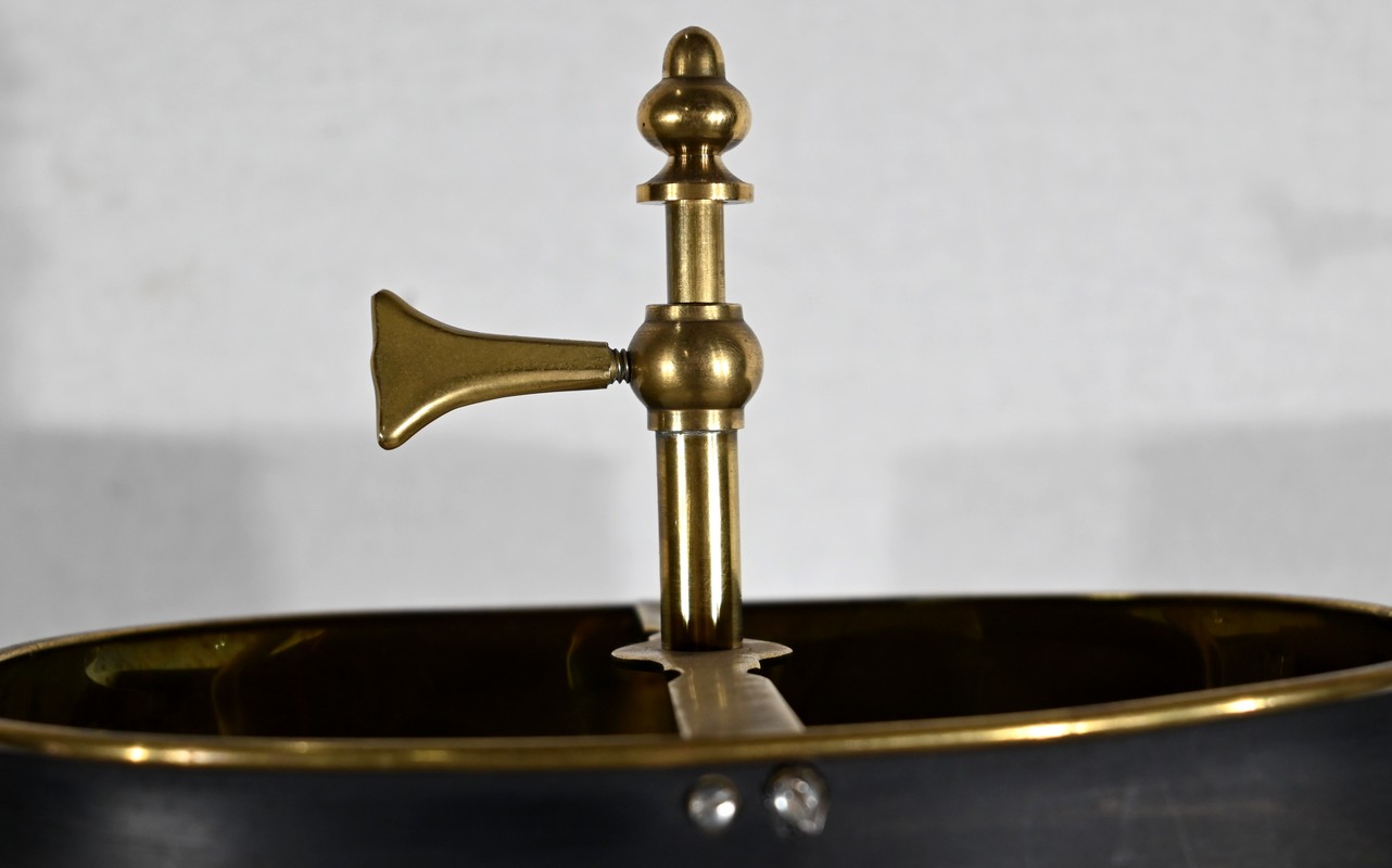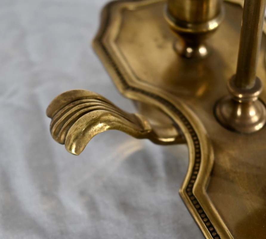 La base en cuvette supporte deux portes bougies cylindriques, et est pourvue d’une poignée de portage en bronze à motif de feuille.
