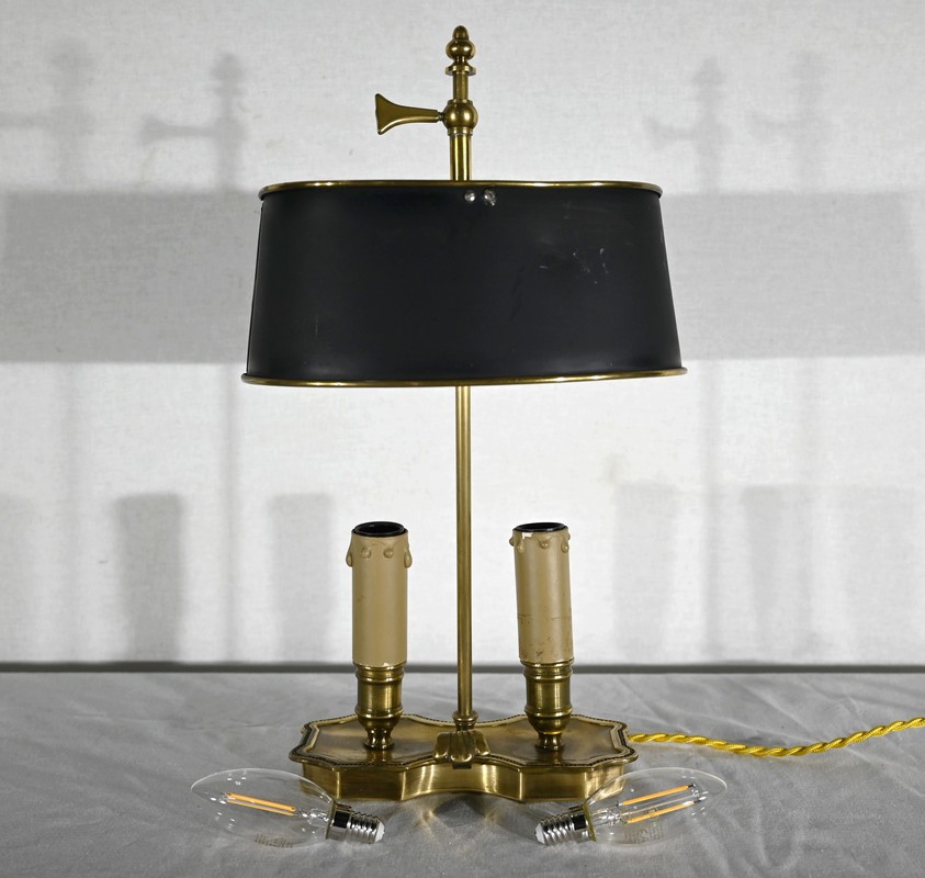 Petite lampe bouillotte en laiton chapeautée d’un abat-jour en tôle de couleur verte et cerclé de laiton.