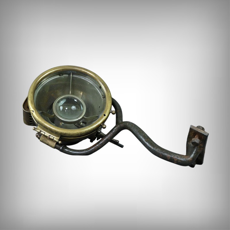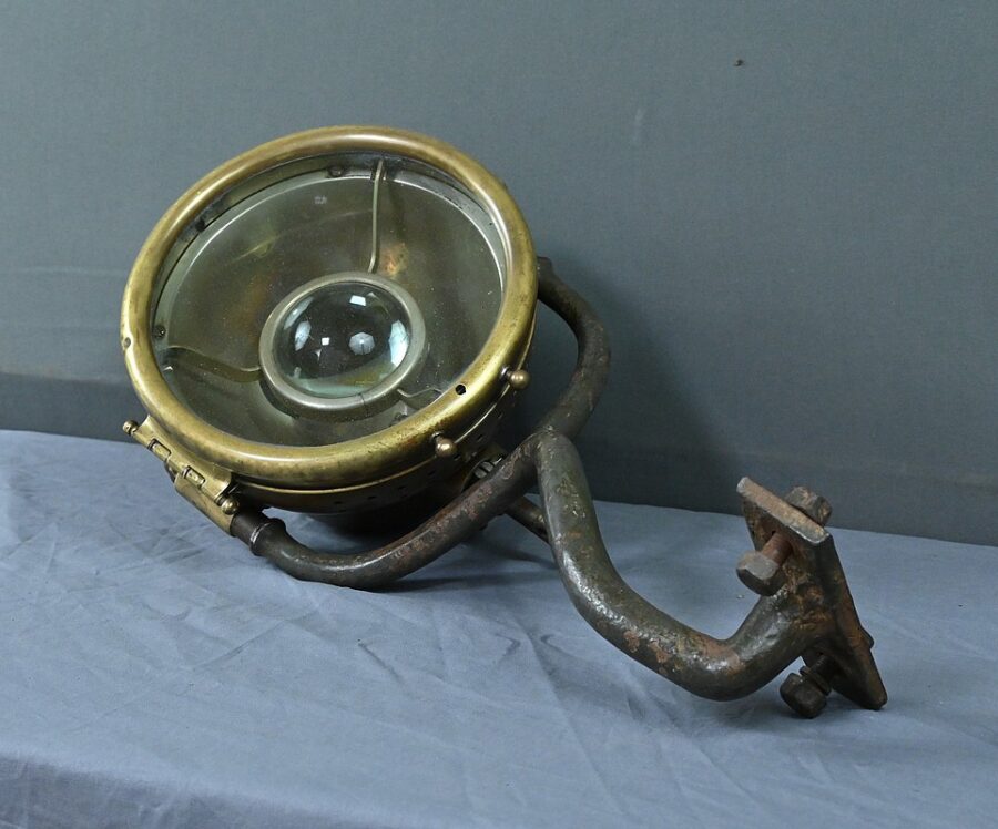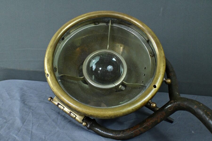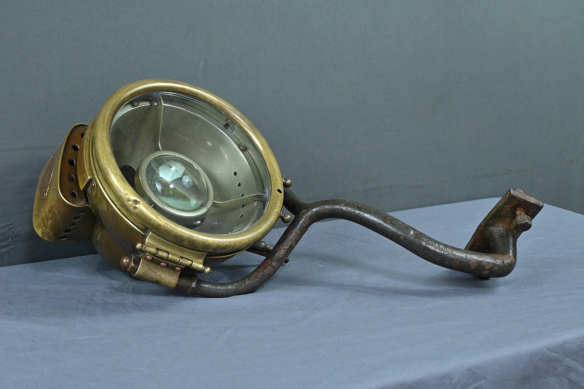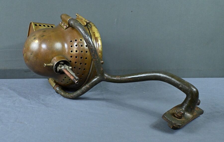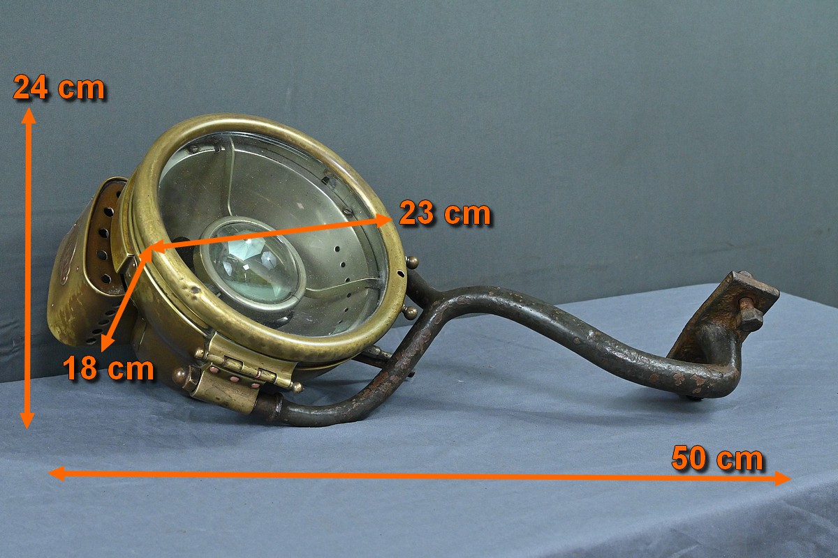 Le projecteur Blériot cylindrique à l’acétylène monté sur une fourche coudée est une merveille de l’ingénierie optique du passé. Ce dispositif d’éclairage en cuivre, autrefois utilisé pour l’éclairage intensif, fonctionne grâce à l’acétylène, un gaz dont la combustion produit une lumière intense et blanche, très prisée avant l’ère de l’électricité. Sa monture sur une fourche permet une l’orientation verticale du faisceau lumineux, rendant son usage particulièrement efficace. Ce projecteur représente une époque où l’innovation reposait sur des mécanismes ingénieux et des matériaux robustes, mettant en lumière l’ingéniosité des pionniers de l’optique et des systèmes d’éclairage. Son esthétique industrielle et ses matériaux vieillissants témoignent de son histoire et de son utilisation intensive dans le passé. Aujourd’hui, il incarne un objet patrimonial fascinant, à la croisée de la science et de l’art mécanique.