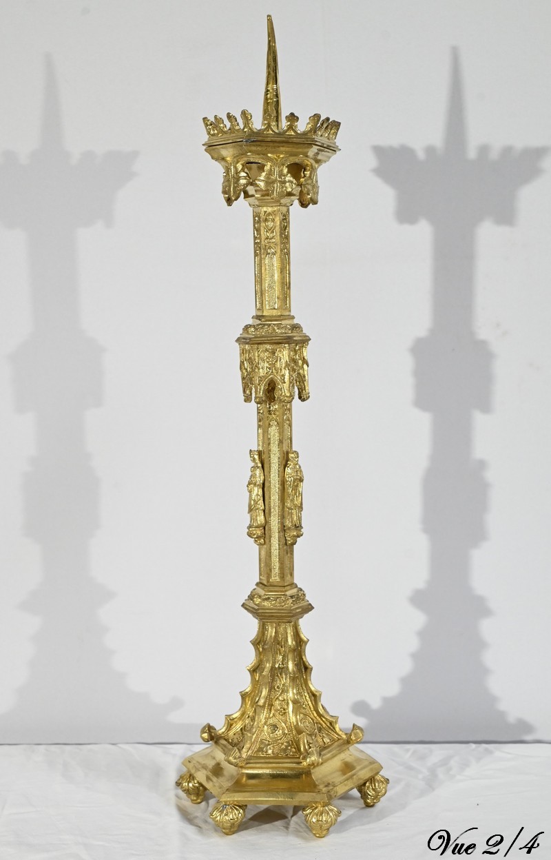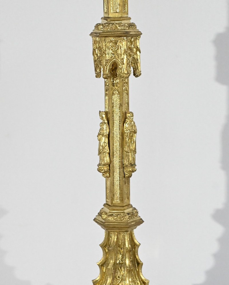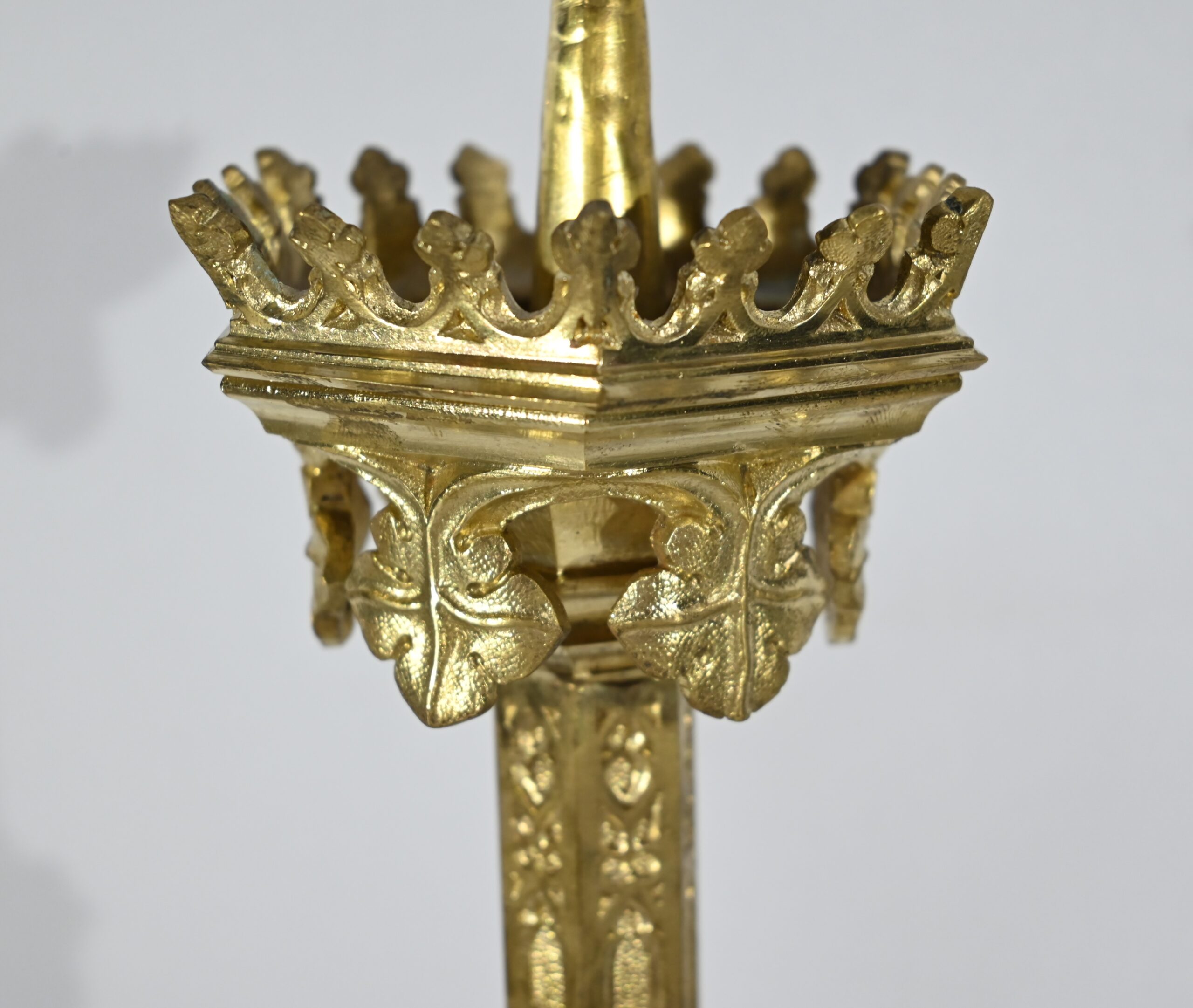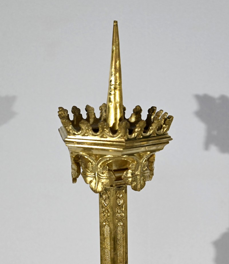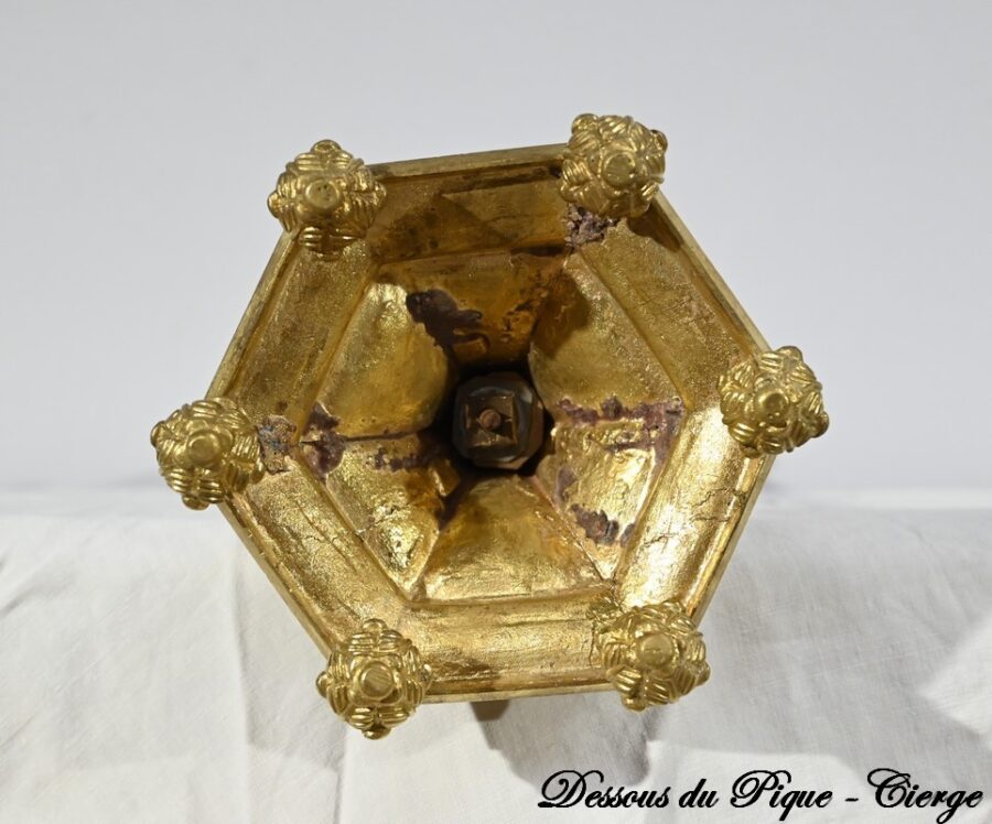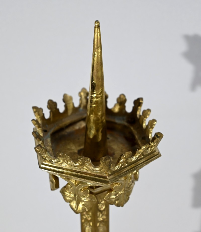 Ce pique-cierge en bronze doré intégralement ciselé présente un calice à décor de couronne et de feuilles.