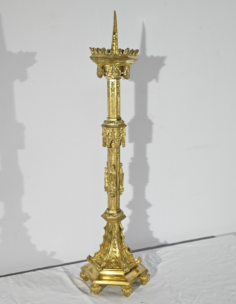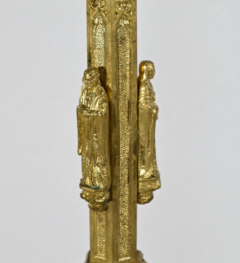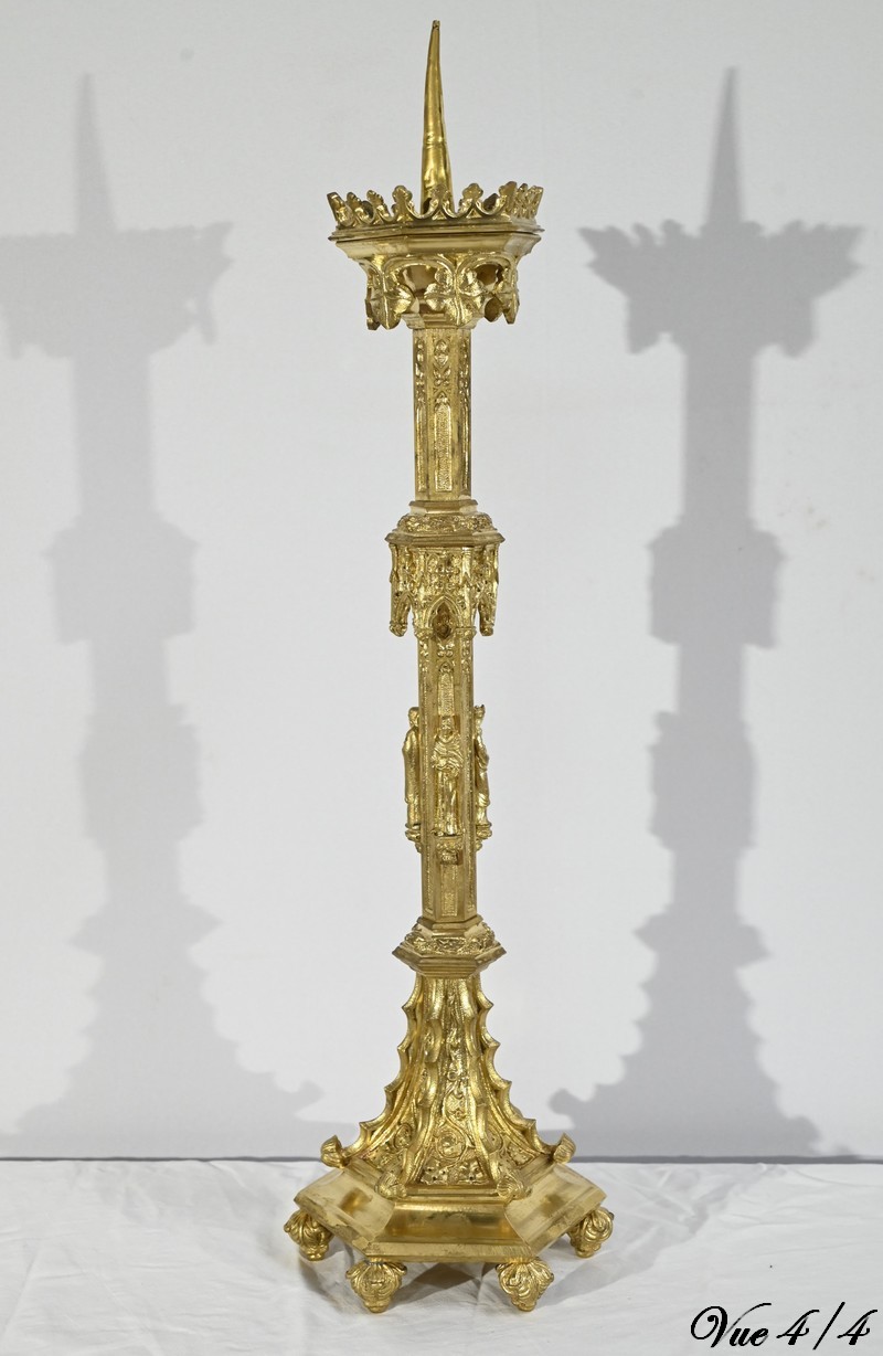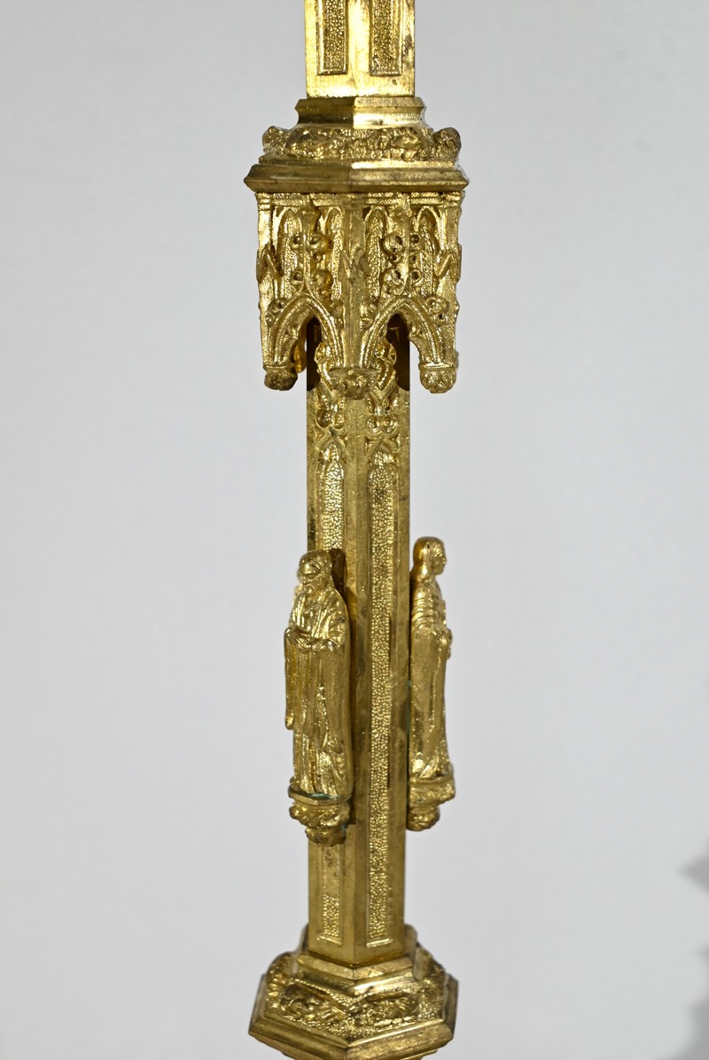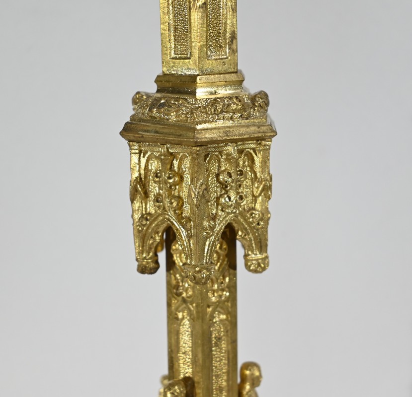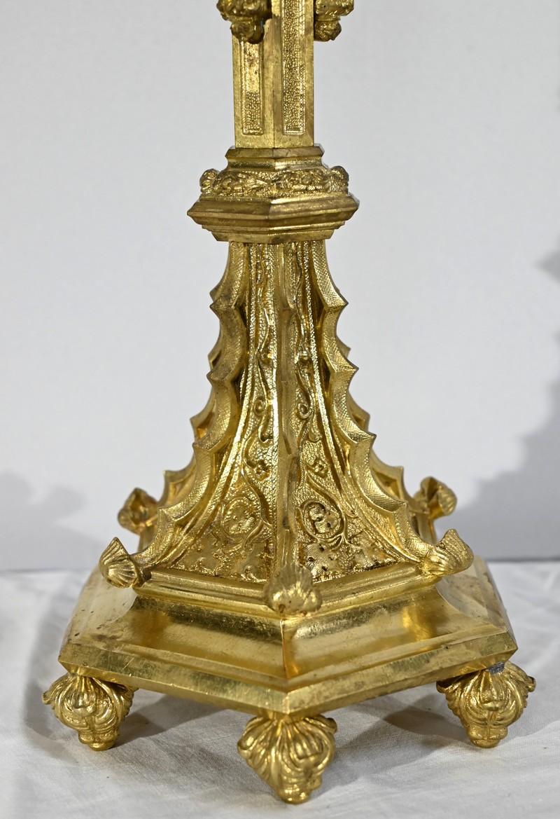 Ce pique-cierge en bronze doré intégralement ciselé présente un calice à décor de couronne et de feuilles.