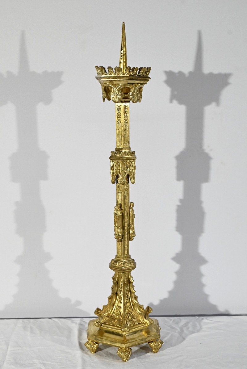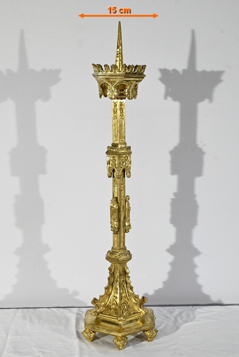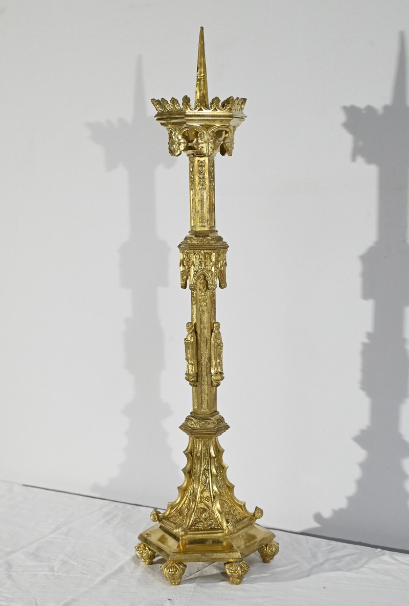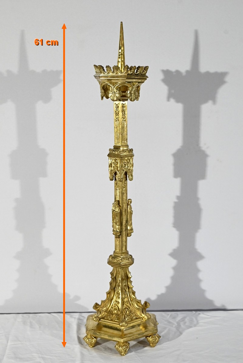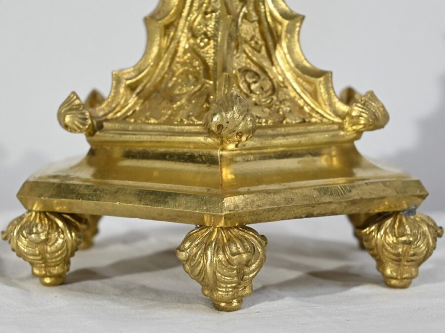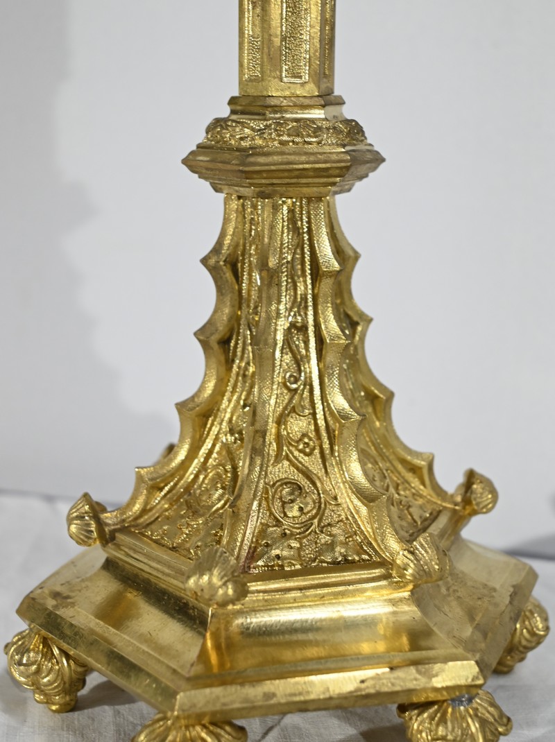 Ce pique-cierge en bronze doré intégralement ciselé présente un calice à décor de couronne et de feuilles.