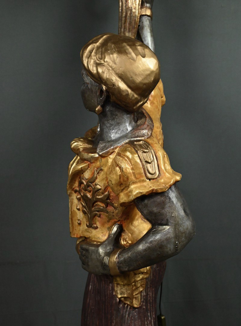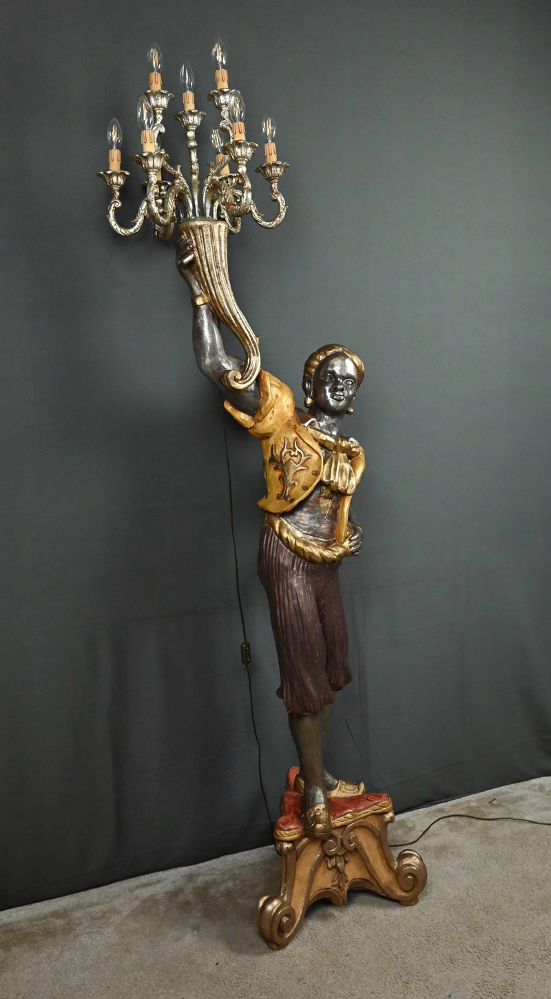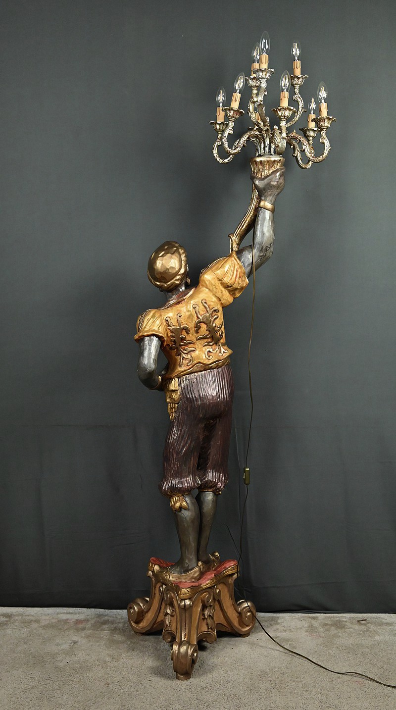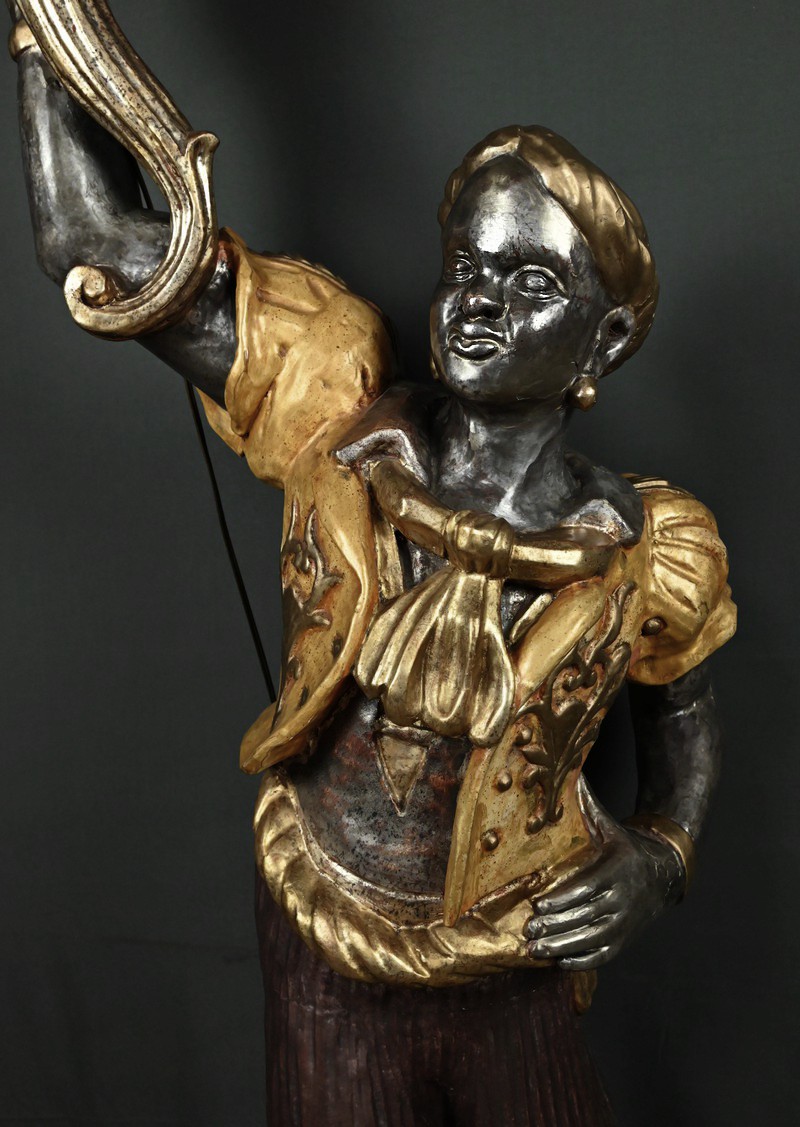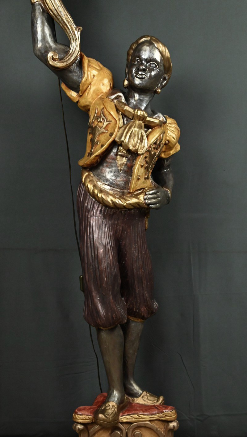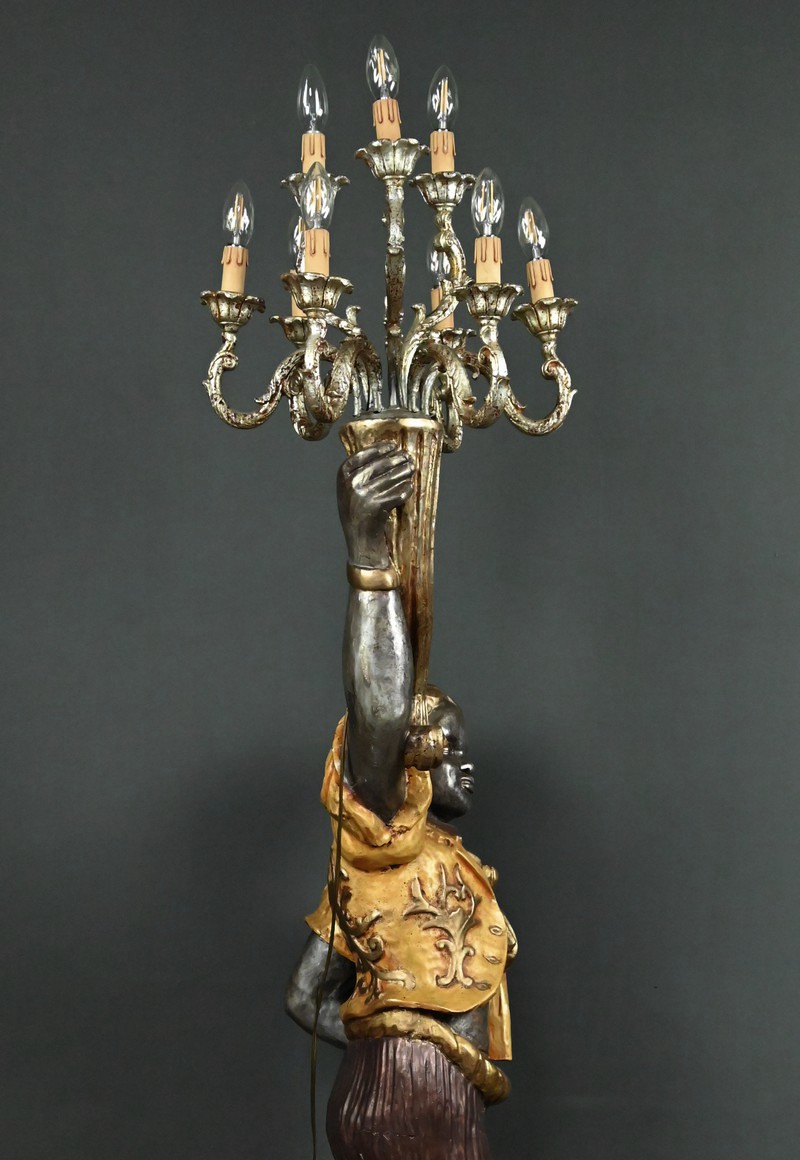Majestueux et théâtral, ce porte-torchères représente un Nubien debout sur un socle voluté, tenant au-dessus de sa tête un bouquet à neuf bras de lumière dans le style des candélabres vénitiens du XVIIIe siècle. Entièrement sculpté, il est rehaussé d’une polychromie raffinée mêlant teintes argentées, dorures et accents ocres, évoquant le faste baroque des palais lagunaires.