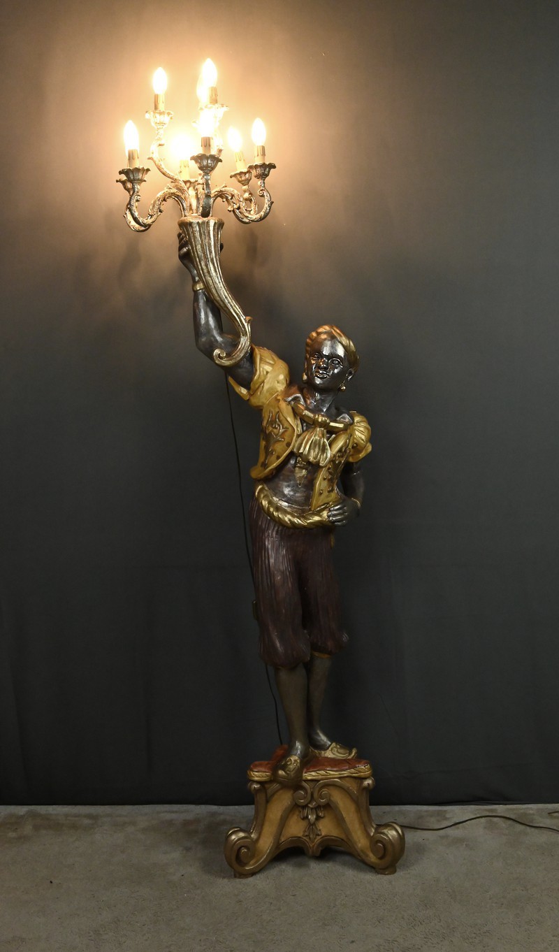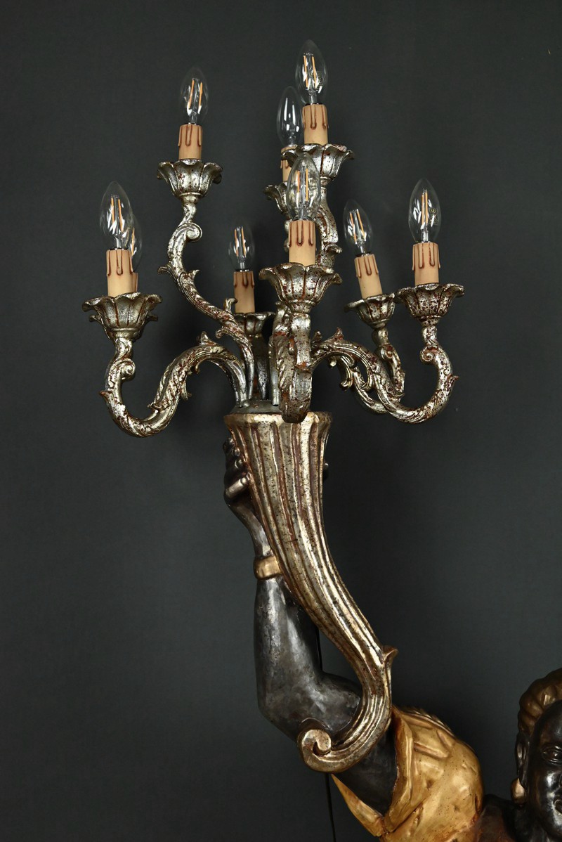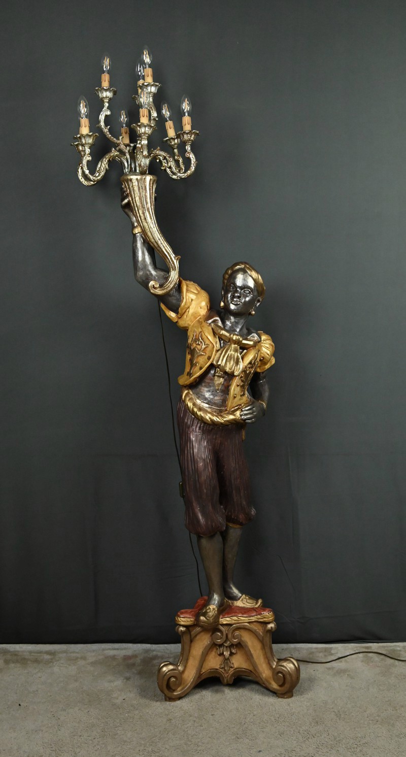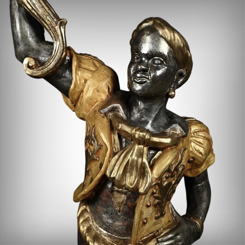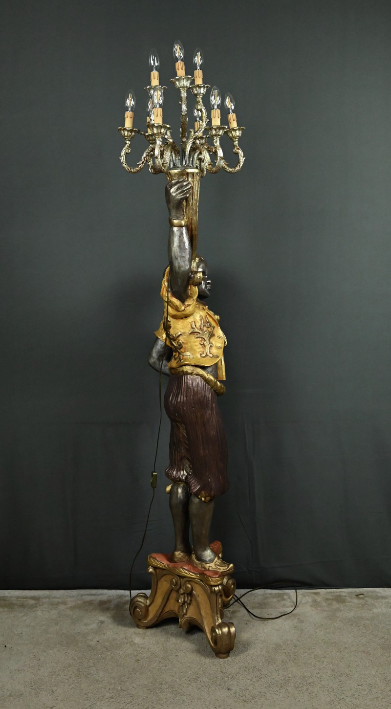 Majestueux et théâtral, ce porte-torchères représente un Nubien debout sur un socle voluté, tenant au-dessus de sa tête un bouquet à neuf bras de lumière dans le style des candélabres vénitiens du XVIIIe siècle. Entièrement sculpté, il est rehaussé d’une polychromie raffinée mêlant teintes argentées, dorures et accents ocres, évoquant le faste baroque des palais lagunaires.