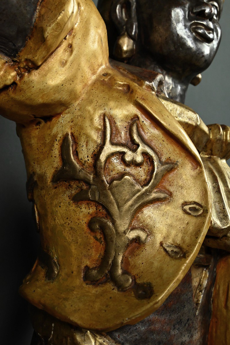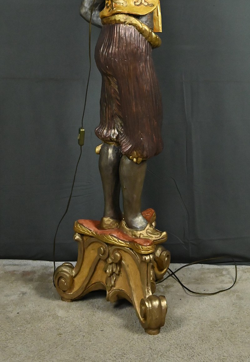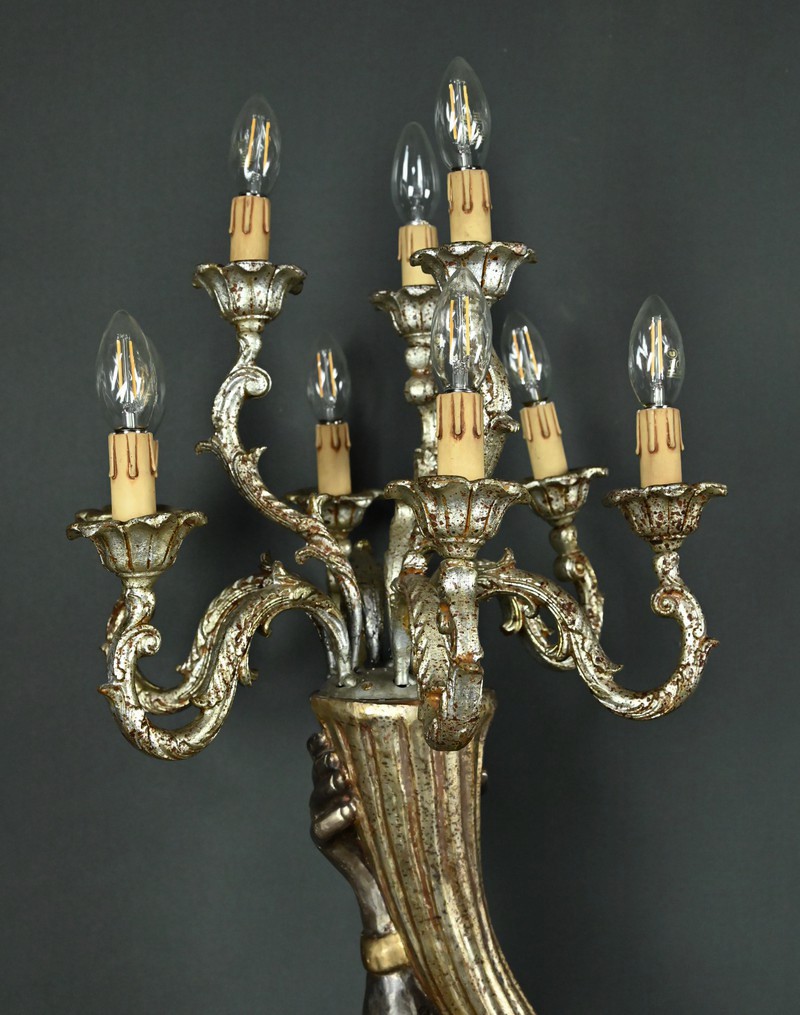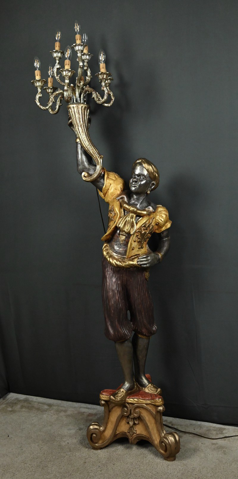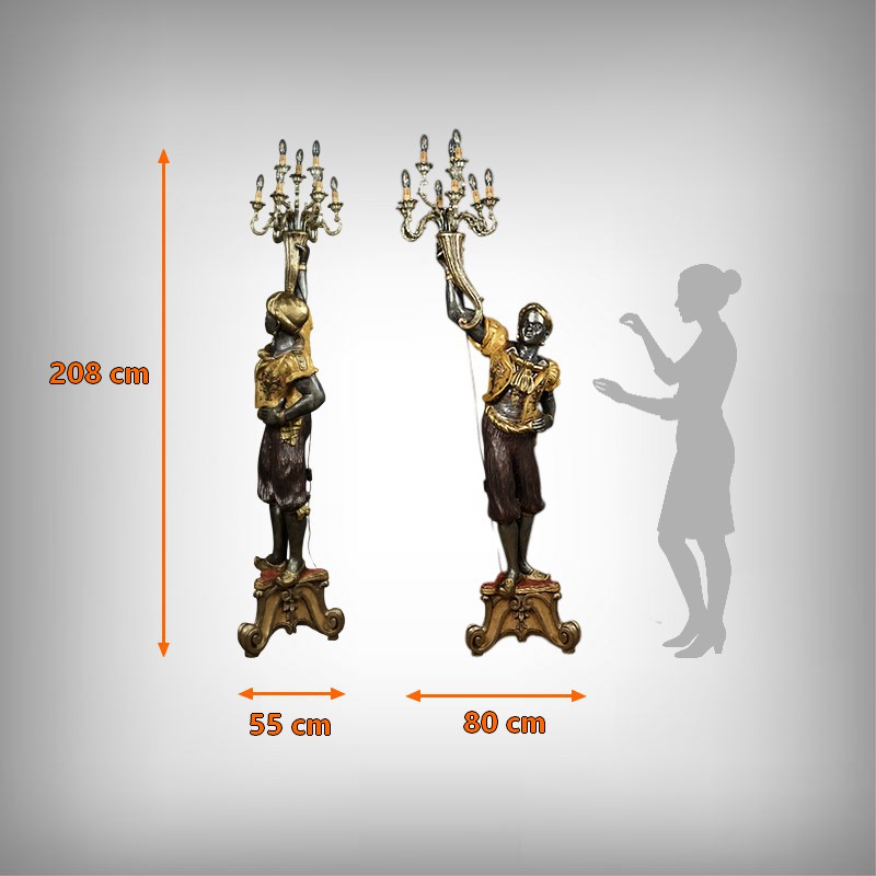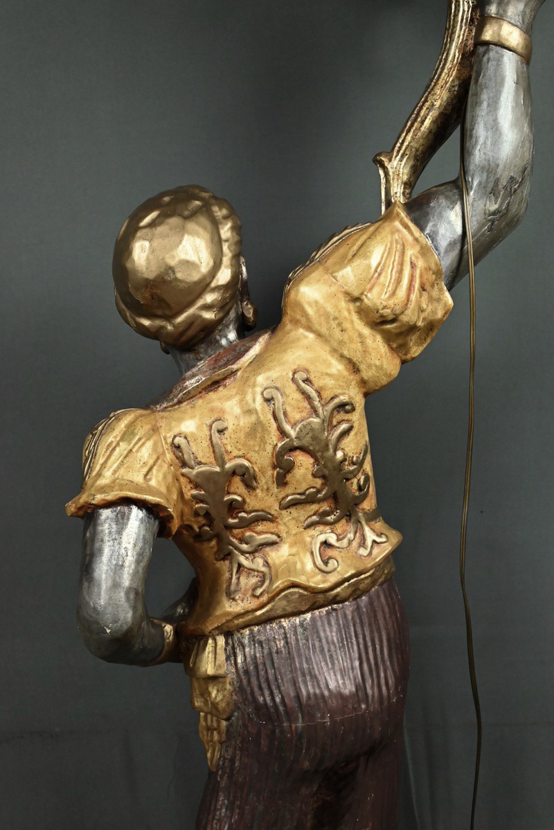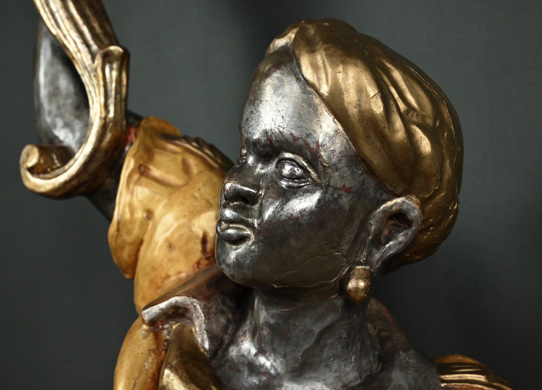 Majestueux et théâtral, ce porte-torchères représente un Nubien debout sur un socle voluté, tenant au-dessus de sa tête un bouquet à neuf bras de lumière dans le style des candélabres vénitiens du XVIIIe siècle. Entièrement sculpté, il est rehaussé d’une polychromie raffinée mêlant teintes argentées, dorures et accents ocres, évoquant le faste baroque des palais lagunaires.