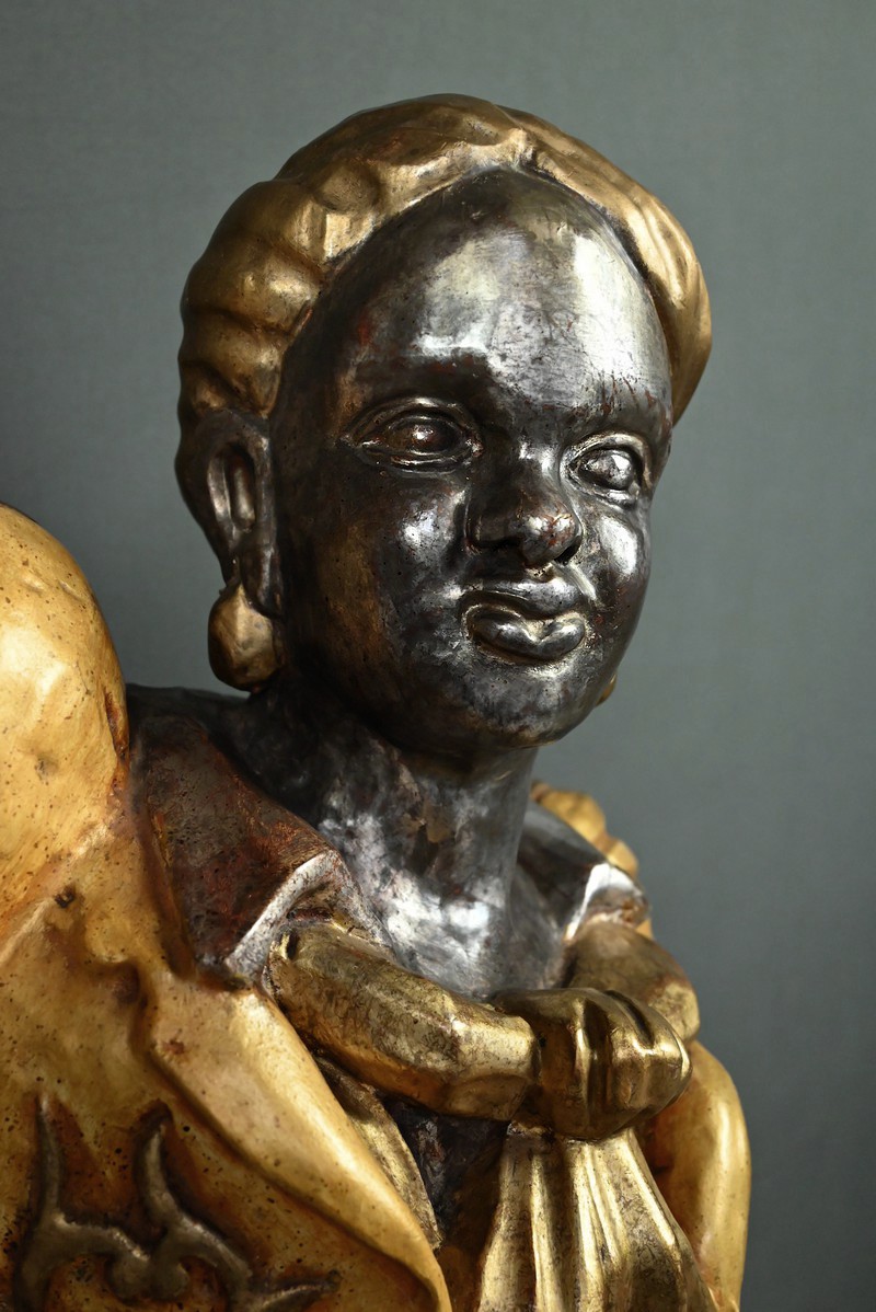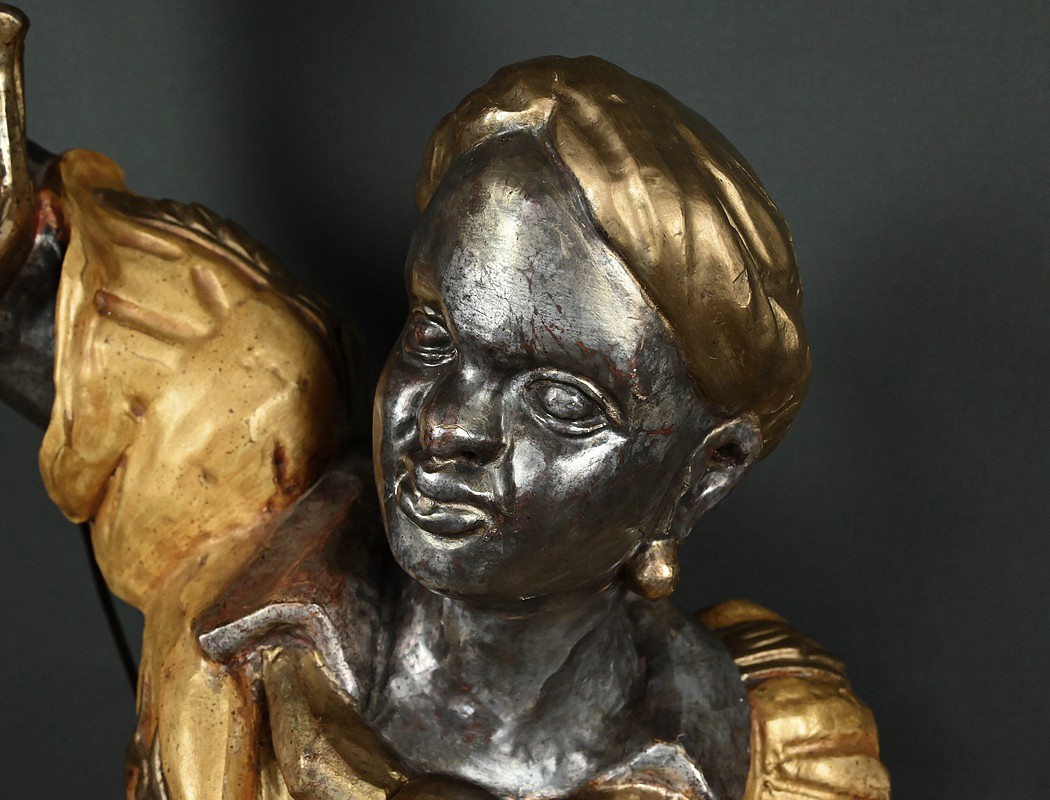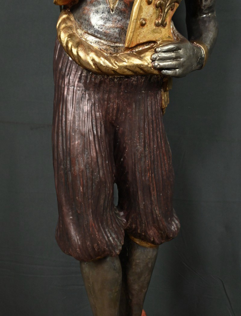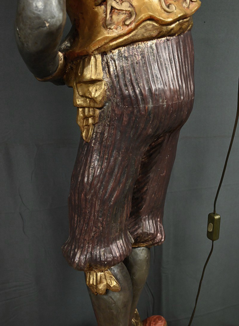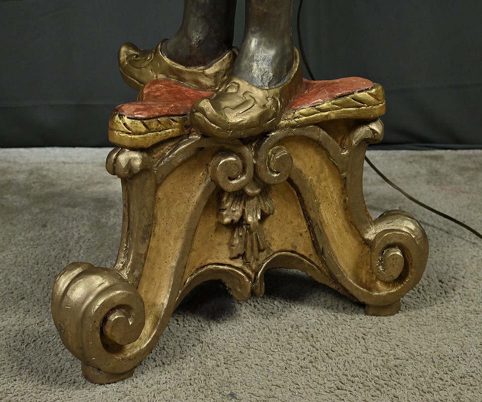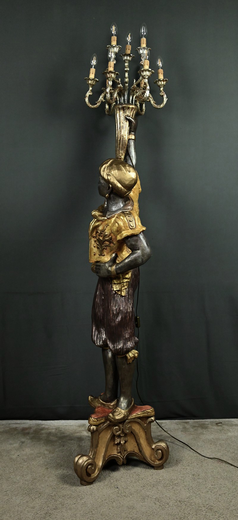 Majestueux et théâtral, ce porte-torchères représente un Nubien debout sur un socle voluté, tenant au-dessus de sa tête un bouquet à neuf bras de lumière dans le style des candélabres vénitiens du XVIIIe siècle. Entièrement sculpté, il est rehaussé d’une polychromie raffinée mêlant teintes argentées, dorures et accents ocres, évoquant le faste baroque des palais lagunaires.