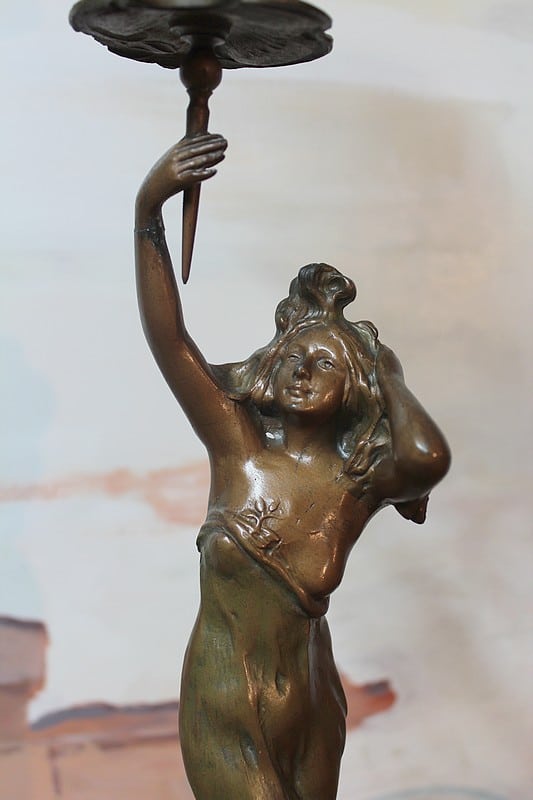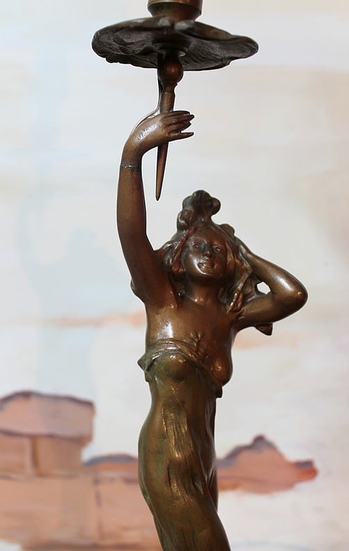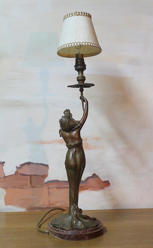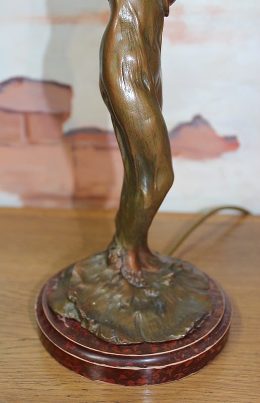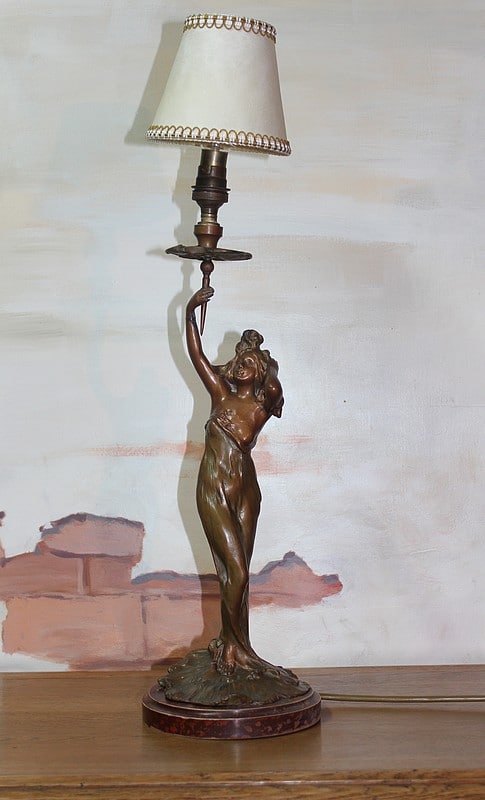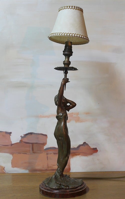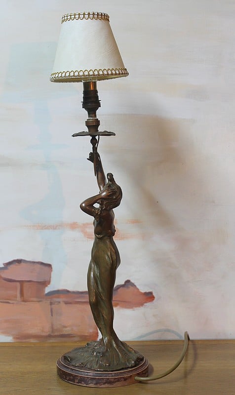 Statue en régule patiné vert et doré, sur socle en bois, représentant une femme soutenant une lampe. Elle est signée ‘C. ROSA’. Elle a été électrifiée aux normes.