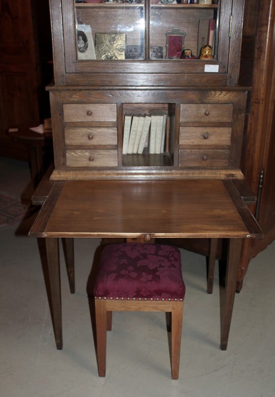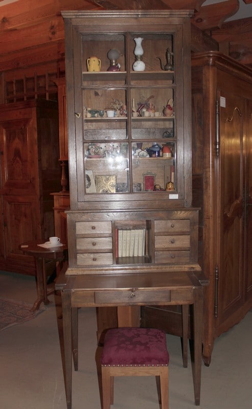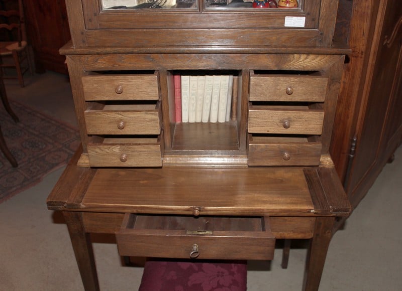 Petit bureau-vitrine de commerce en chêne composé de 3 éléments : un élément table avec tiroir et tirette reposant sur 4 pieds gainés, un élément intermédiaire composé de 6 petits tiroirs et 1 casier et enfin un élément haut vitré garni de 3 étagères. Époque 1900.