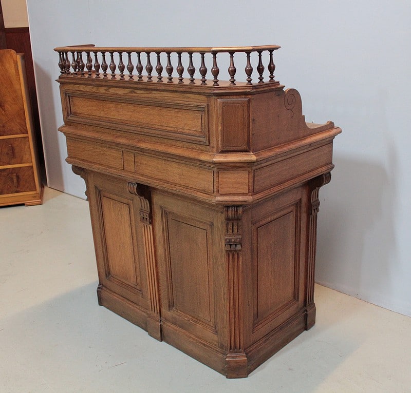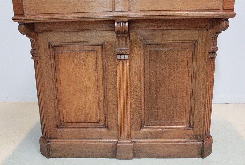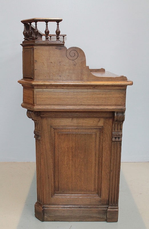 Caisse-comptoir de commerce en chêne , sa façade est moulurée et décorée de consoles à cannelures.