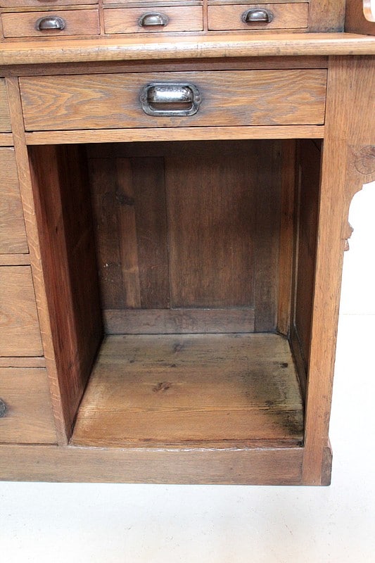 La partie haute, en gradin, ouvre par 12 petits tiroirs , elle est surmontée d’une galerie à décor de fuseaux.
