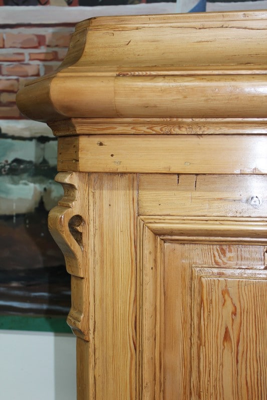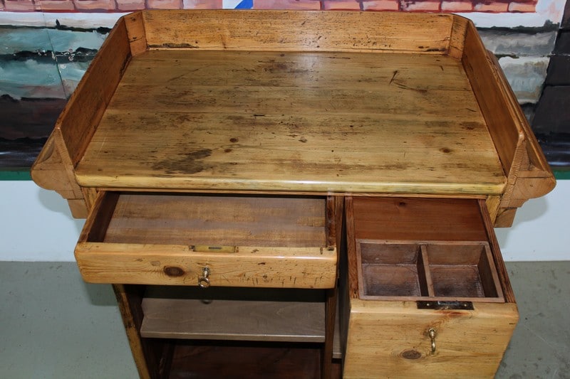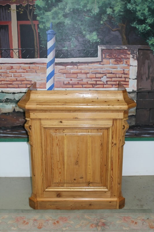 Caisse de magasin en pitchpin blond. Elle ouvre à l’arrière par 4 niches et 2 tiroirs fermant à clé. Époque 1920. Finition cirée.