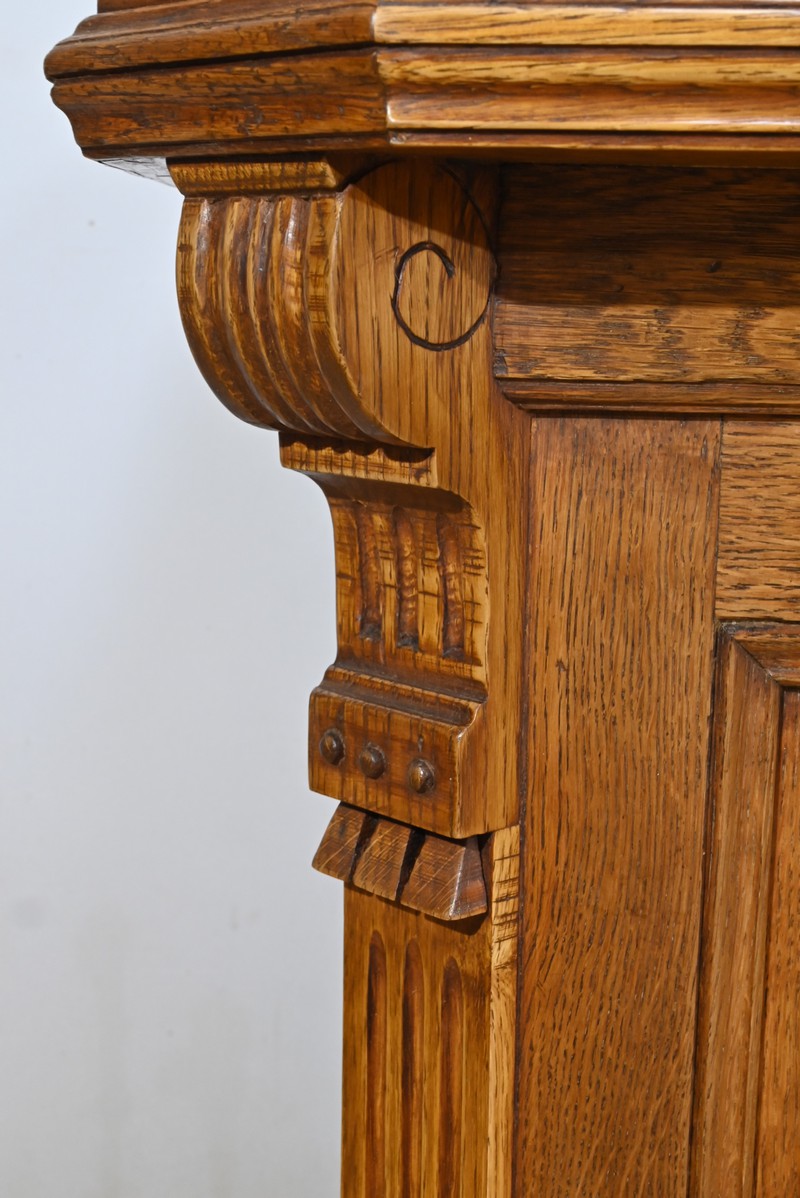 L’ensemble est sommé d’une galerie à barreaux tournés accompagnée dune petite plateforme portant le numéro 17 qui servait jadis à y dresser une statuette en régule.