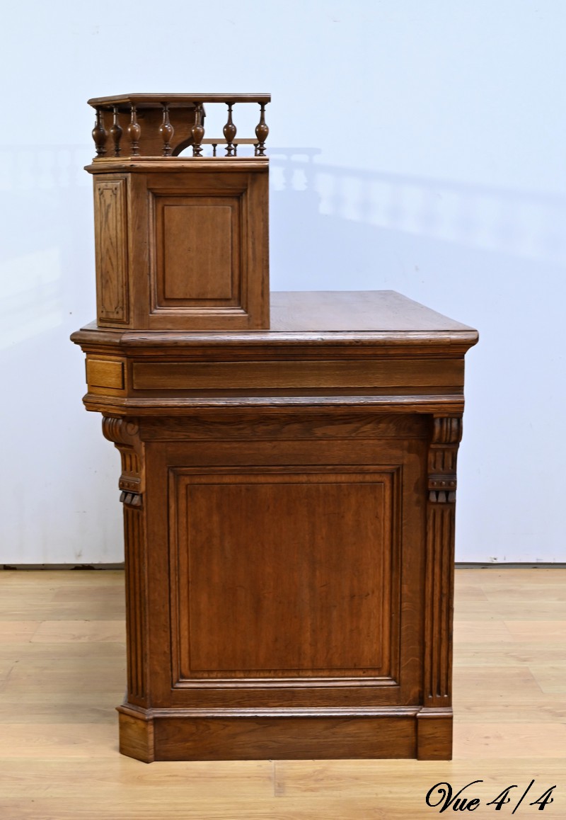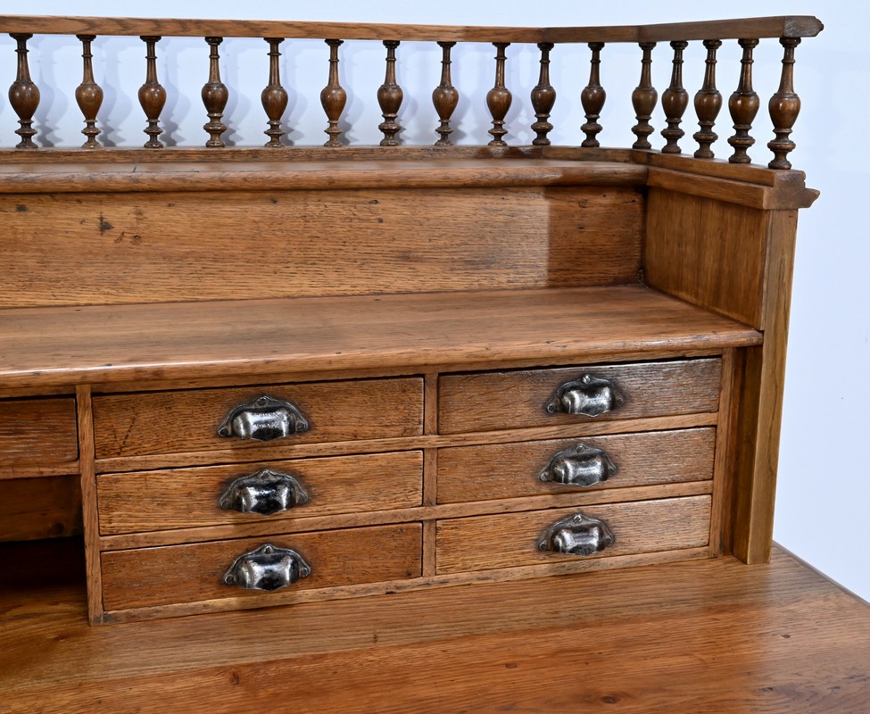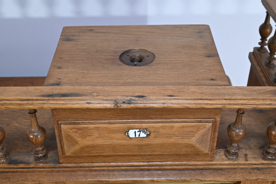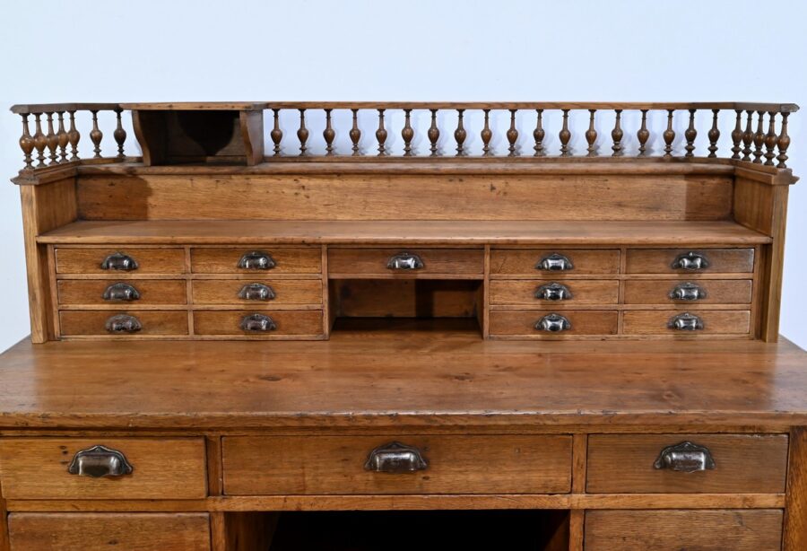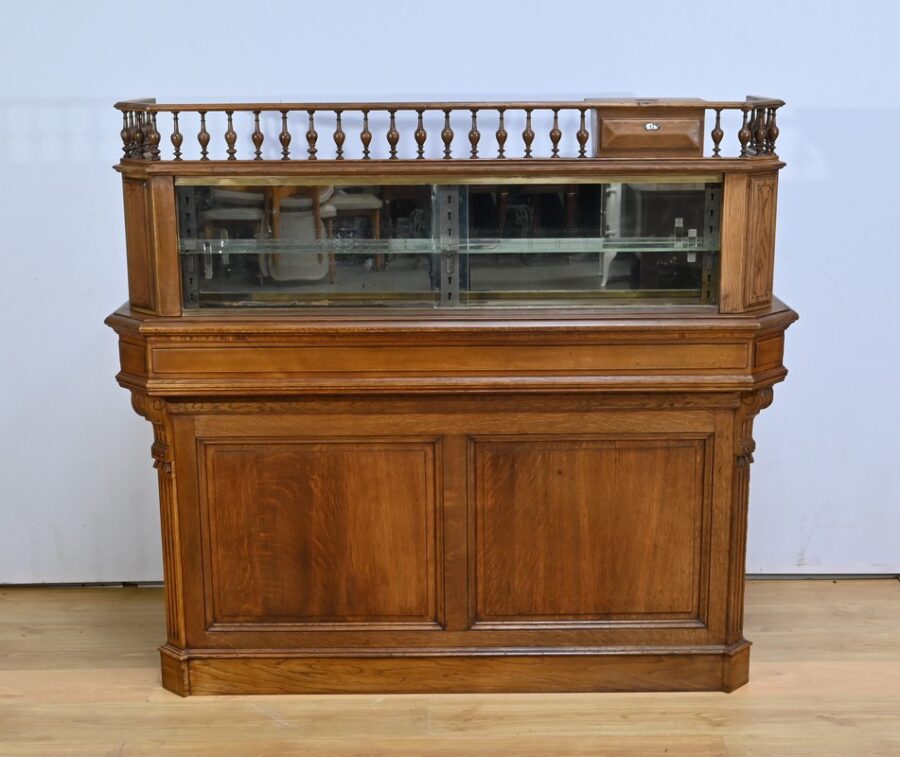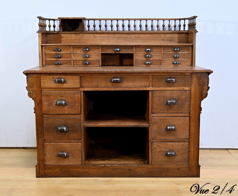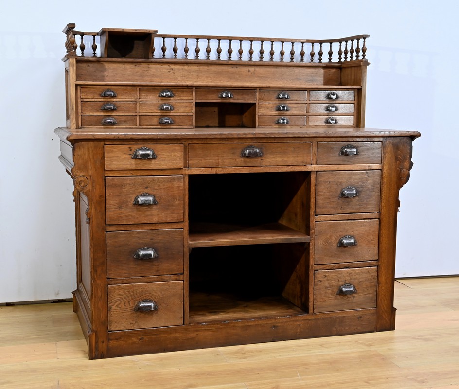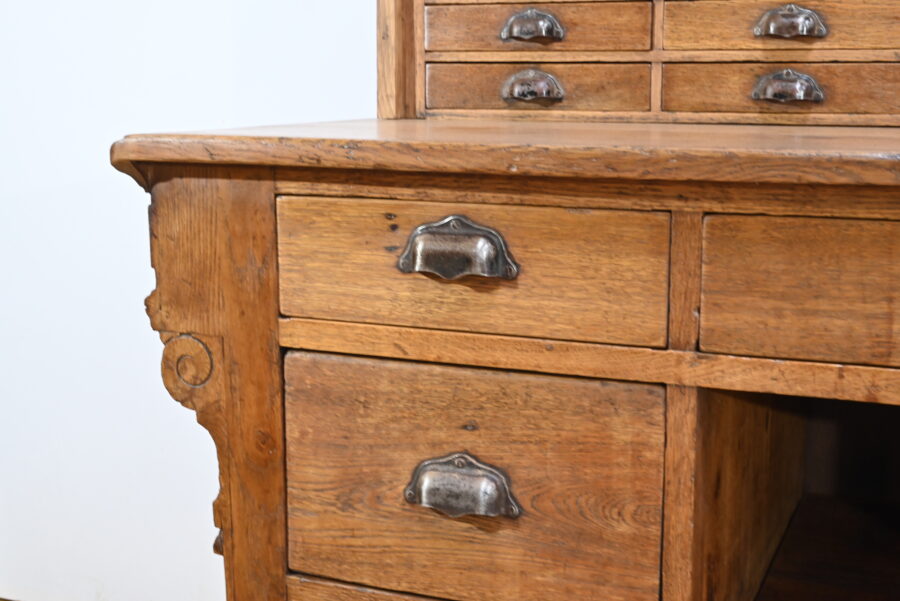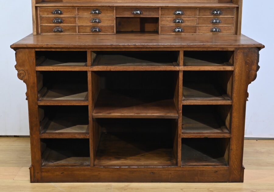 Ancien, pratique, idéal pour organiser des articles tout en offrant une surface de travail et un espace de rangement, ce comptoir d’apothicaire est le parfait exemple du savoir faire des ébénistes du début du siècle dernier.
