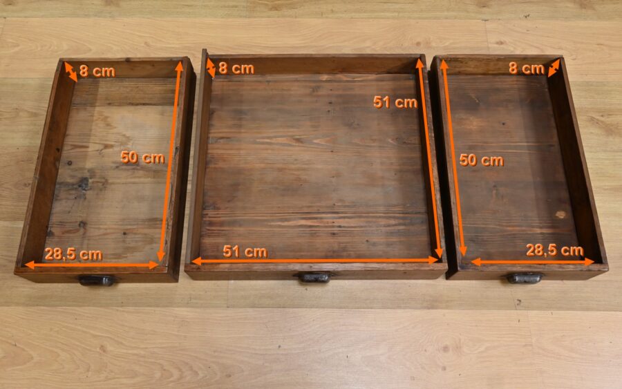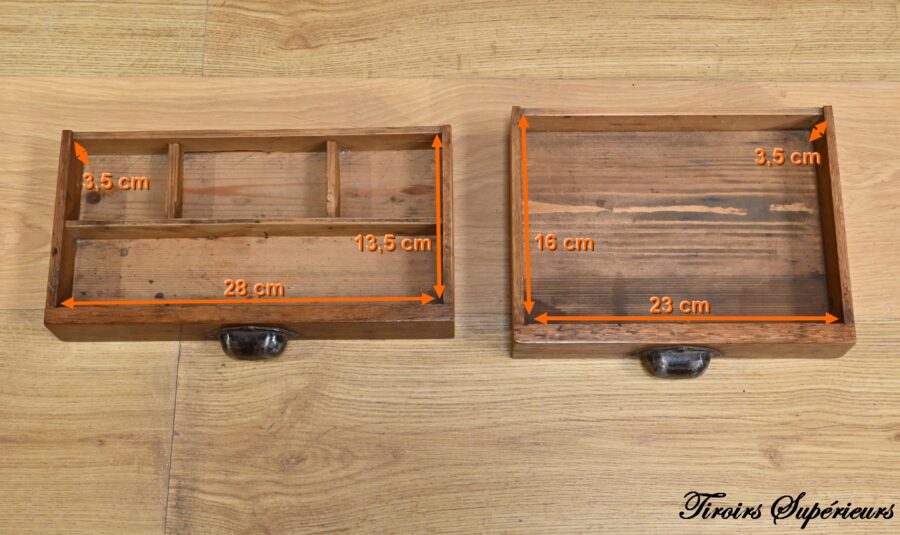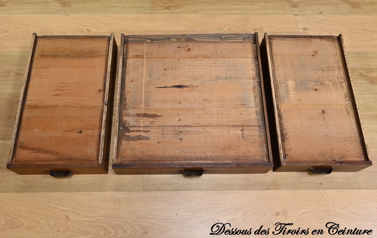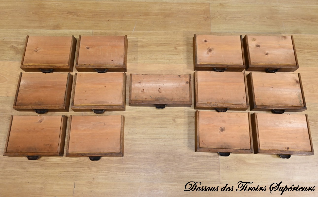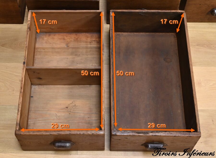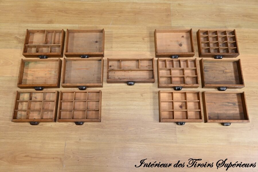 La face opposée du meuble est garni de nombreux tiroirs, compartimentés, entiers ou habillés de métal, de dimensions différentes et garnis, pour chacun d’entre eux, d’une poignée en métal.