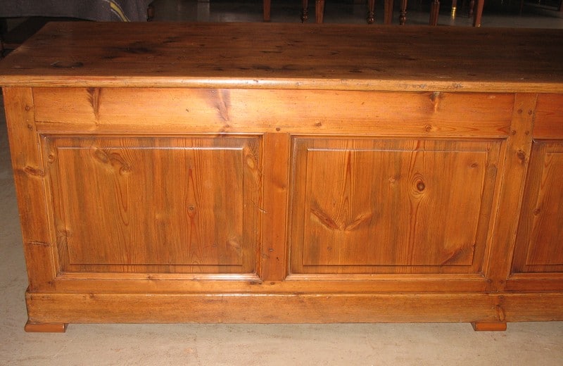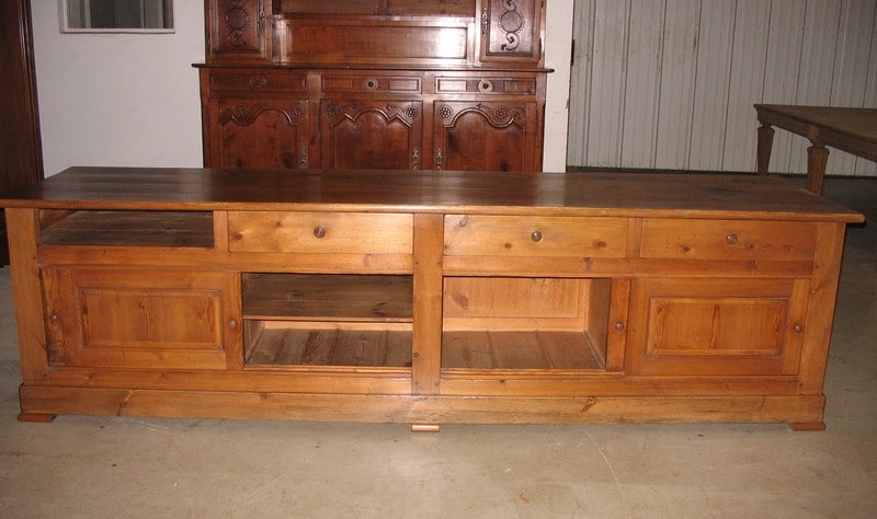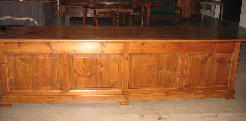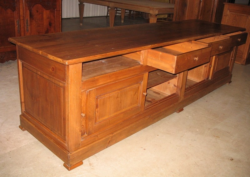 Très grand comptoir de commerce double face en pin. Façade à 4 panneaux et arrière ouvrant par 4 portes coulissantes, 1 casier et 3 tiroirs.