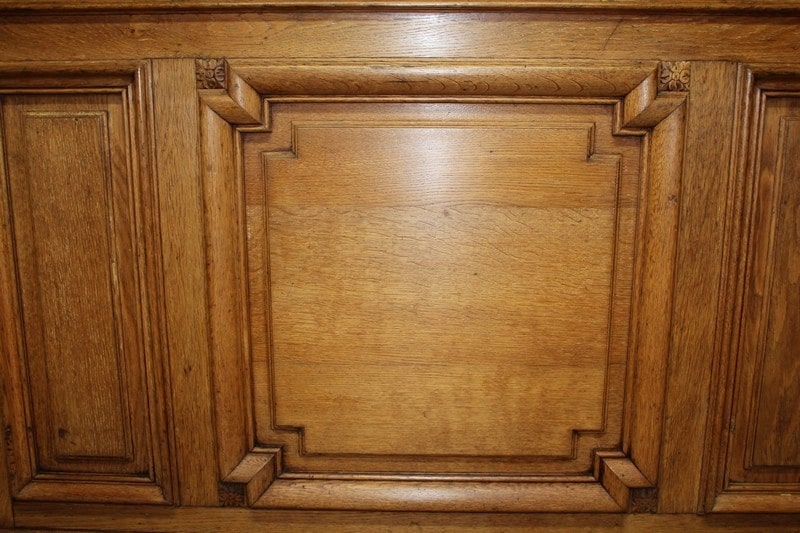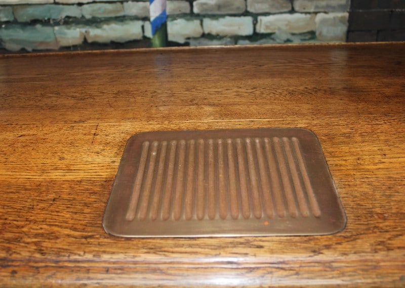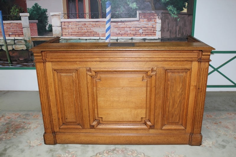 Grand comptoir de commerce formant pupitre en chêne doré. En façade 3 panneaux moulurés, celui de milieu à découpes grecques. Sur le dessus, en plan incliné aux trois-quarts, une plaque de cuivre pour la monnaie. A l’arrière, il ouvre par 3 tiroirs et 2 portes latérales.