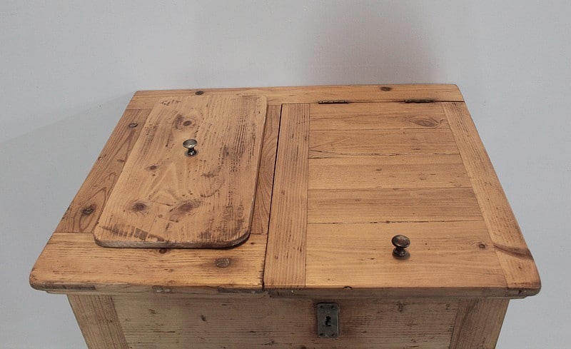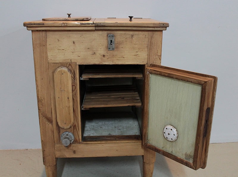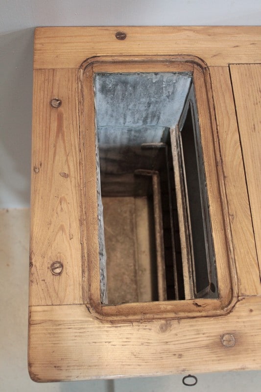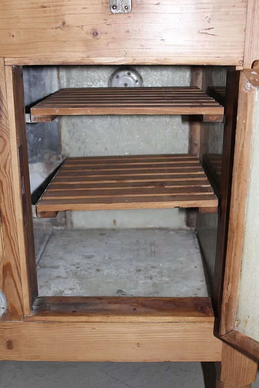 Elle ouvre par 2 couvercles sur le dessus et 1 porte en façade, découvrant un compartiment garni de 2 étagères en bois à claires-voies.