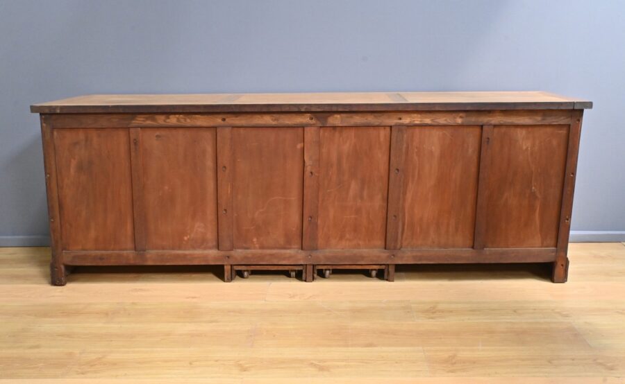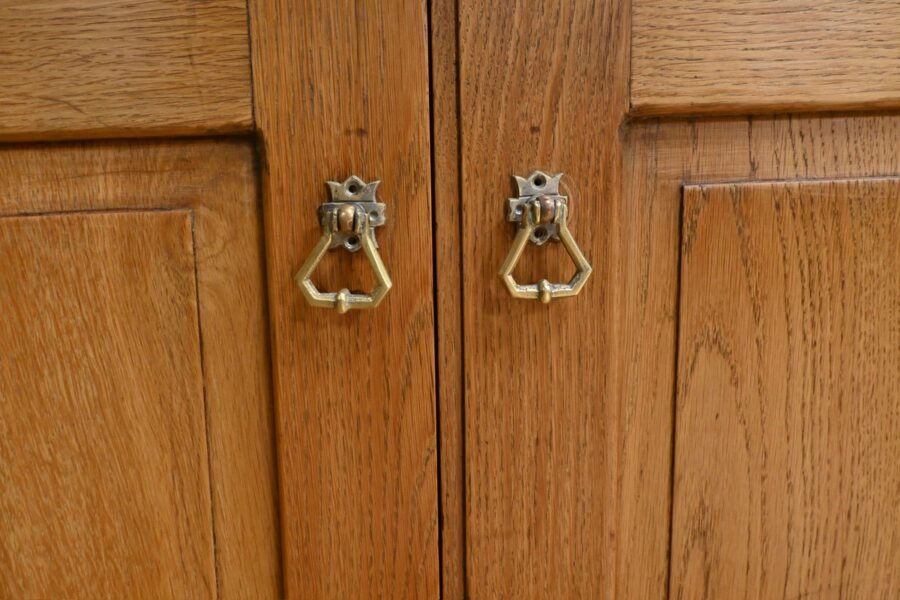 À chaque extrémité, deux doubles vantaux permettent d’accéder à des étagères montées sur crémaillères, offrant une flexibilité de rangement selon les besoins spécifiques de son utilisateur.