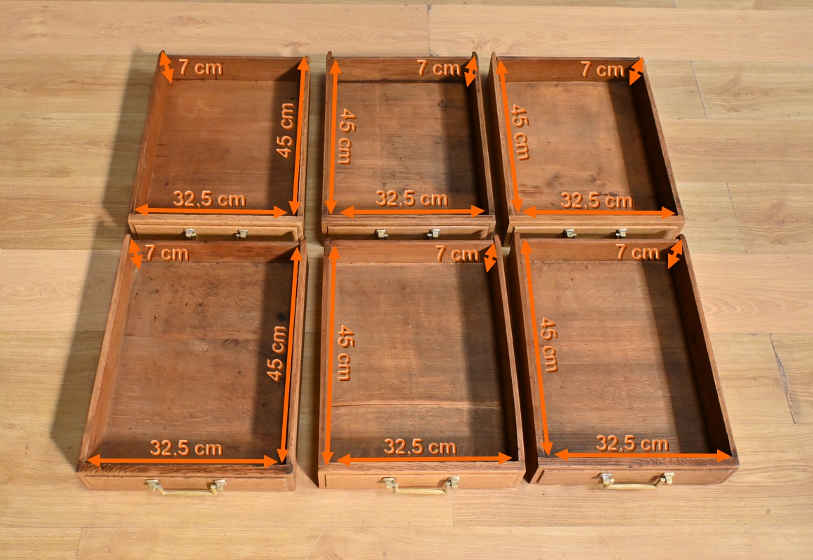 Pensé pour le commerce et l’optimisation de l’espace, ce meuble s’ouvre par six tiroirs identiques, disposés en ceinture, chacun doté de poignées en laiton au style sobre et raffiné.