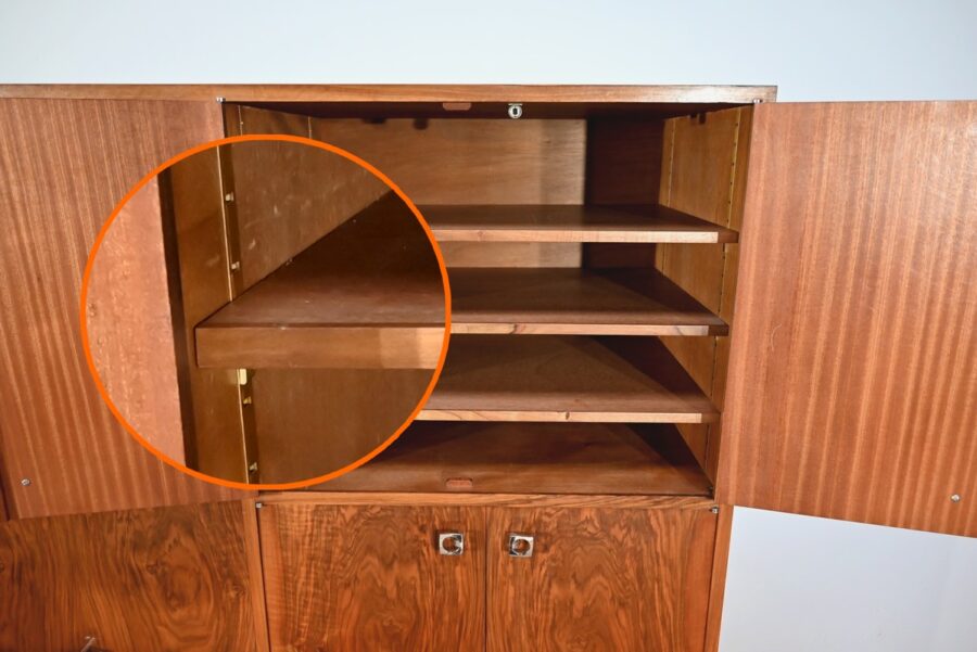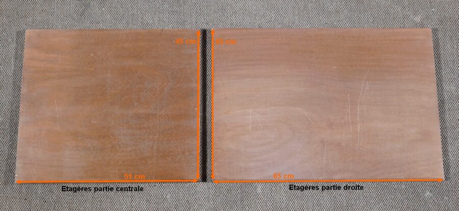 La partie droite offre huit étagères à chant noyer, montées sur crémaillères en métal encastrées.