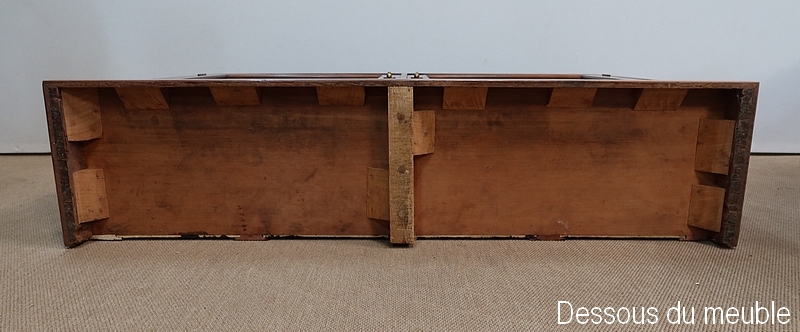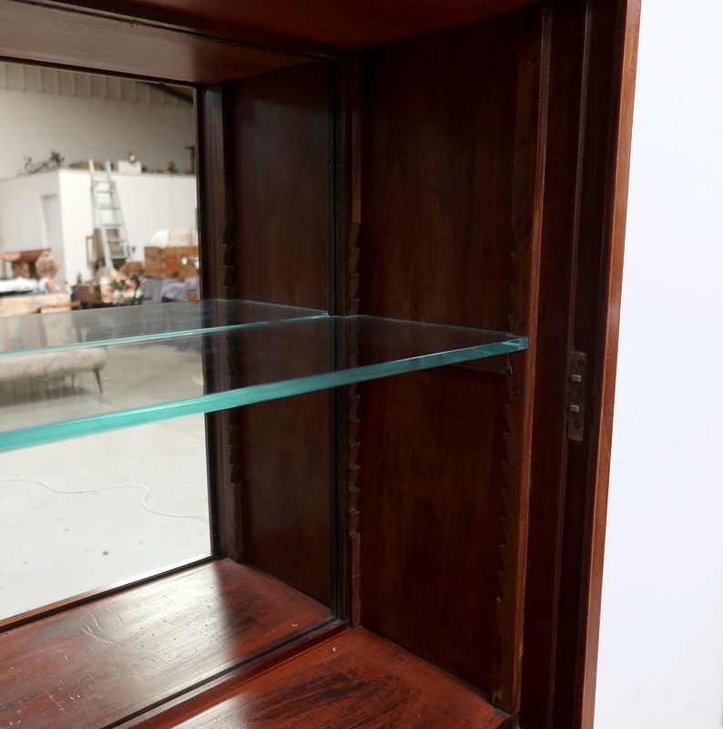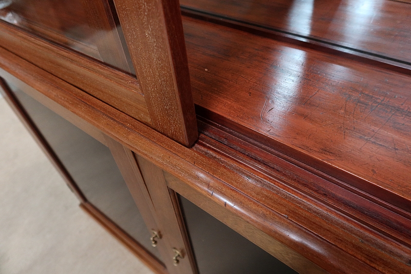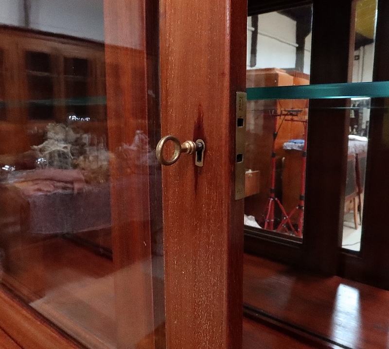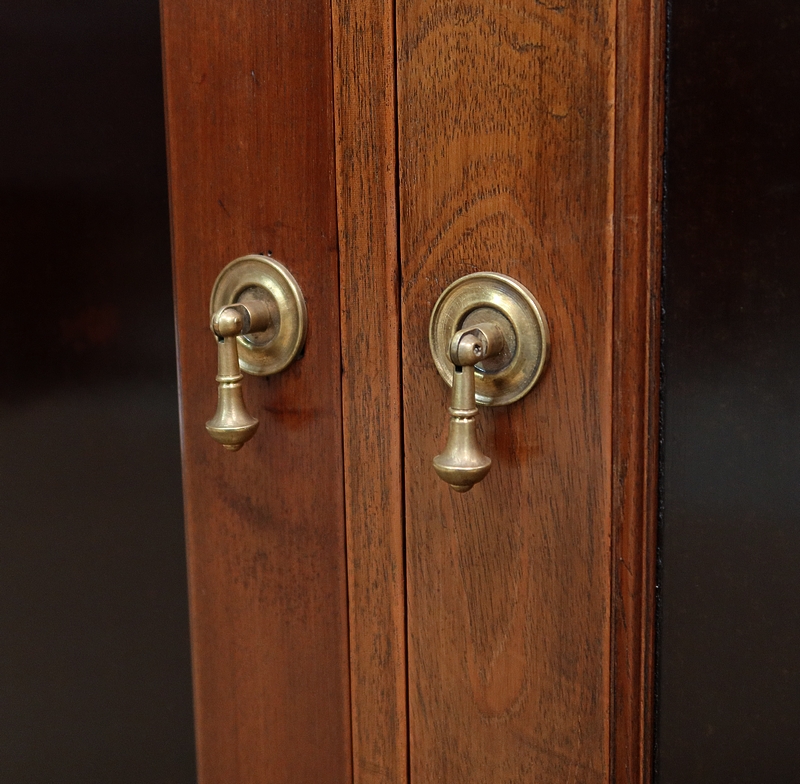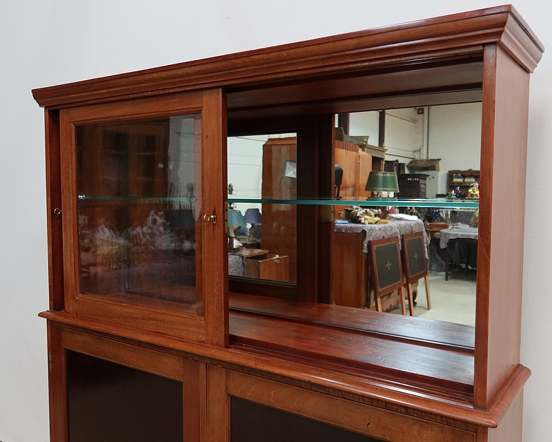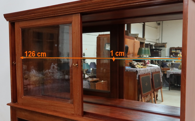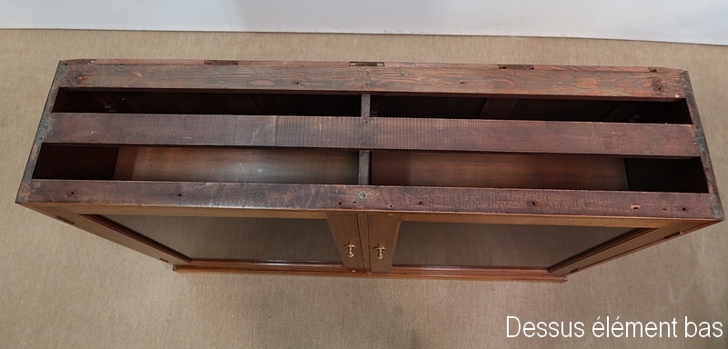 L’élément haut figurant une vitrine est doté de deux portes à encadrement mouluré par l’intérieur. Chacune est munie d’une grande vitre de section carrée. Ces portes coulissent sur leurs rails et se ferment par une serrure d’origine dite à crochet, avec clé anneau en état de fonctionnement et entrée en filet de laiton. A l’intérieur, nous découvrons un fond composé d’un grand miroir argenté et une étagère en verre d’une épaisseur d’1 cm. Cette étagère bénéficie d’encoches lui permettant d’être réglable sur crémaillères. Cet élément haut est sommé d’une corniche moulurée et d’un dessus plat.