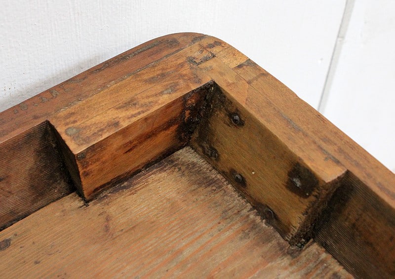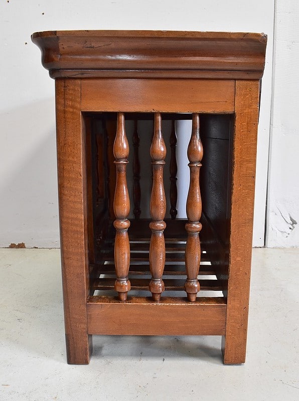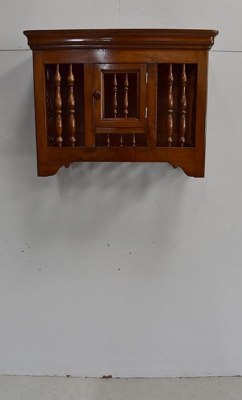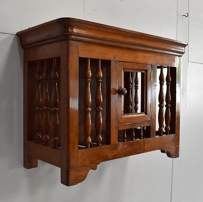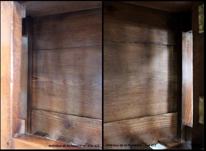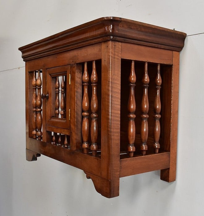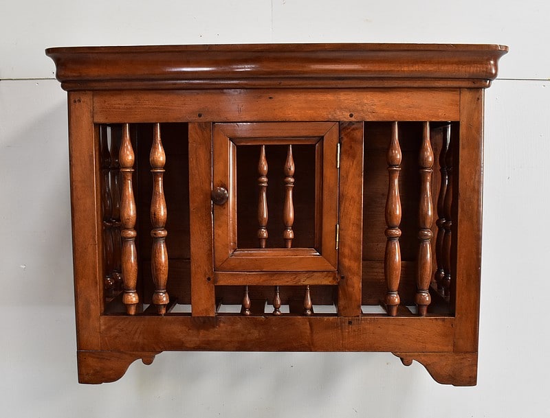 Ce meuble Régional, fréquemment présent dans les maisons Bretonnes ou Provenciales du XIXe siècle, est sommé d’une Corniche taillée à Doucine. Le fond est ajouré, constitué de tasseaux plats. Cette Panetière peut reposer sur ses quatre pieds, découpés à l’avant, droits à l’arrière. Toutefois deux crochets en Fer permettent également de l’accrocher au mur, position initialement privilégiée pour rendre son contenu hors de portée des rongeurs.