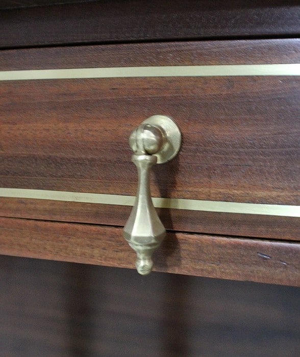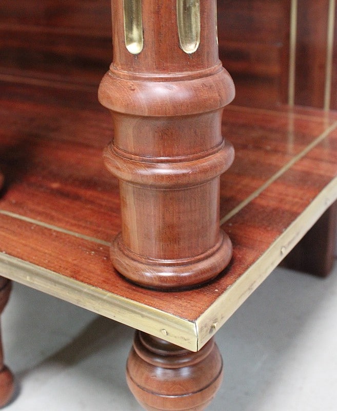 On notera que chacun des plateaux de ce meuble voit son pourtour agrémenté d’une baguette en demi rond en laiton, et chaque façade de tiroir offre un encadrement incrusté du même alliage.