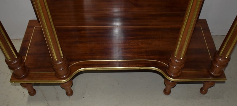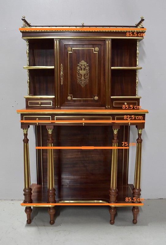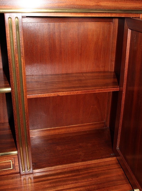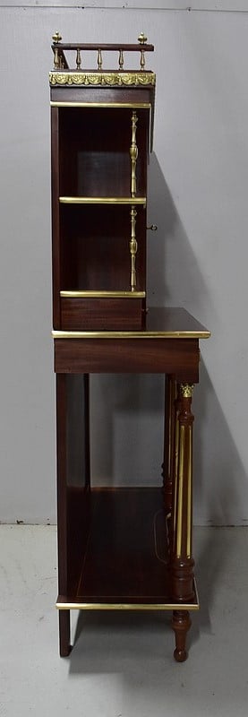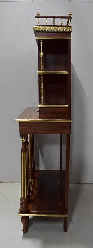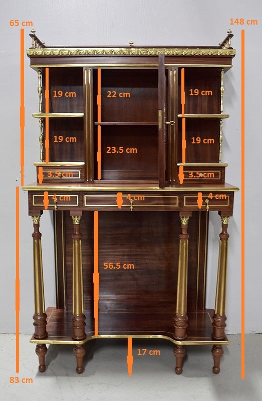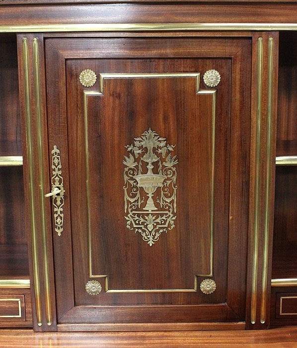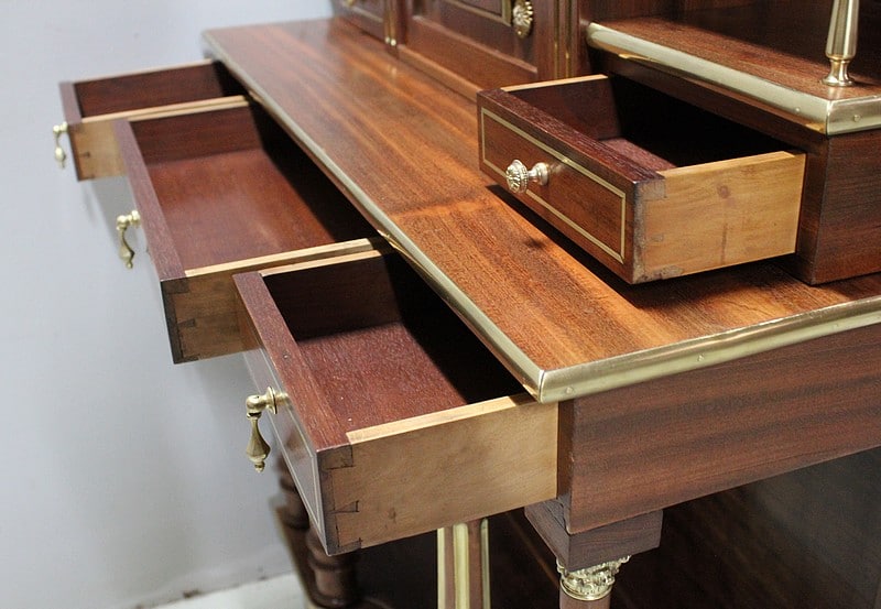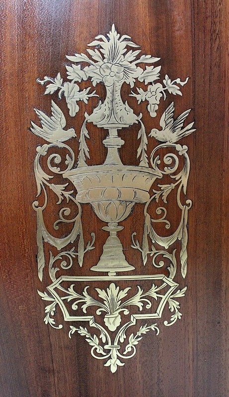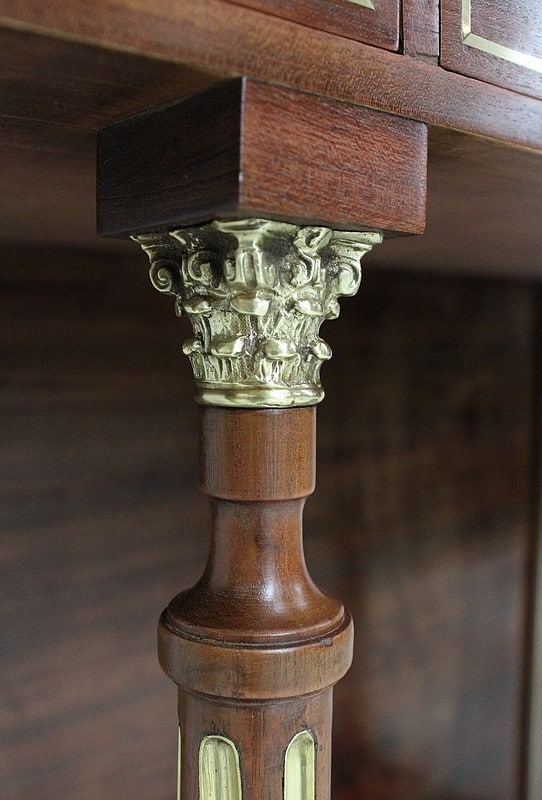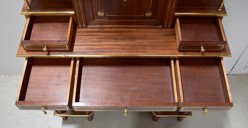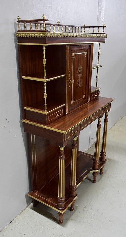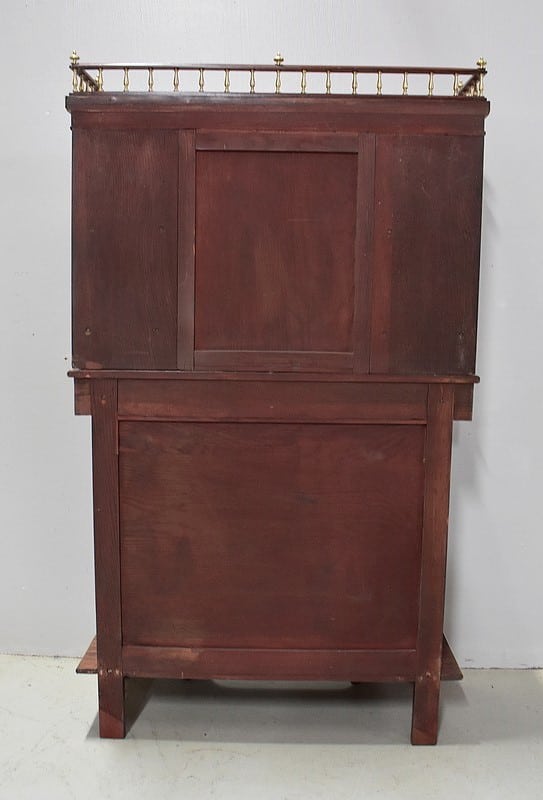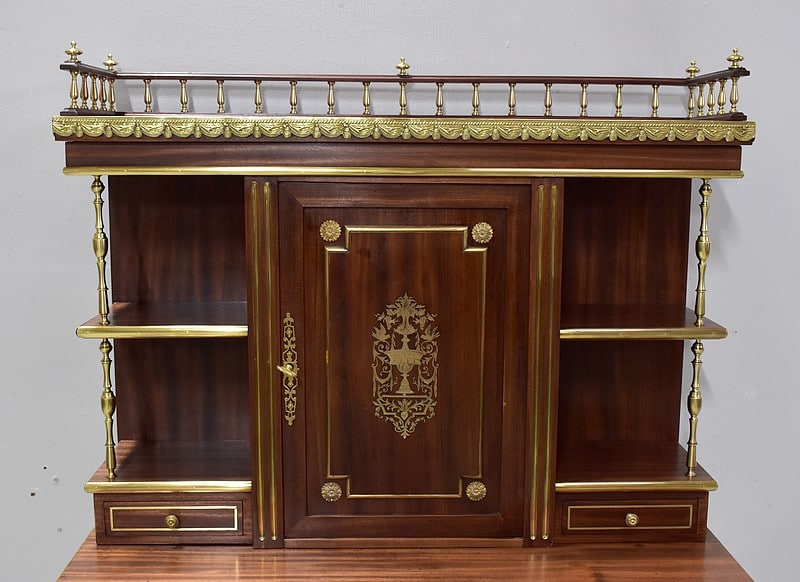 La partie supérieure, plus étroite, ouvre en son centre par une porte formant Tabernacle, dotée d’une entrée de serrure, d’un verrou en état de fonctionnement, et de sa clé. Sa façade se compose d’un panneau en saillie, souligné par une baguette en quart de rond en laiton. Il est découpé à coins Grecs, laissant place dans ses angles à quatre Rosettes. Cette porte bénéficie également d’un Décor en laiton représentant des oiseaux s’abreuvant à une fontaine. Elle découvre deux compartiments formés par la présence d’une étagère fixe. De part et d’autre, ce meuble propose deux fois deux niches avec Colonnettes en laiton, ainsi que deux petits tiroirs à boutons de tirage ciselés. Le dessus de cette première partie est sommé d’une Galerie en Balustres sur trois de ses côtés. Il est également bordé d’une frise en laiton, façonné en Rideaux maintenus remontés par des houppes.