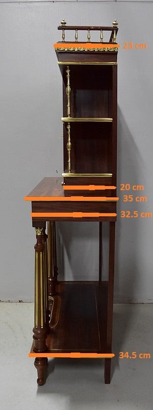 L’élément inférieur ouvre par trois tiroirs, celui du milieu étant plus large que les deux autres, et tous étant pourvus de pendentifs de tirage. Cette ceinture est soutenue à l’avant par quatre Colonnes tournées, avec Cannelures garnies de laiton, et couronnées de Chapiteaux en Bronze. La tablette basse, découpée en retrait sur le devant, repose sur quatre pieds moulurés à l’avant et deux pieds droits à l’arrière.