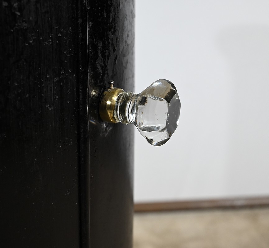 Ce meuble domestique de forme cylindrique s’ouvre par deux portes laissant voir deux étagères. Une très belle poignée en verre taillé agrémente l’une de ces portes. De chaque côté de ce réchaud, une grosse boule en laiton permet le transport. La partie basse est dotée d’une large plinthe moulurée en laiton et la partie haute est ceinte d’une galerie laiton formant cuvette.