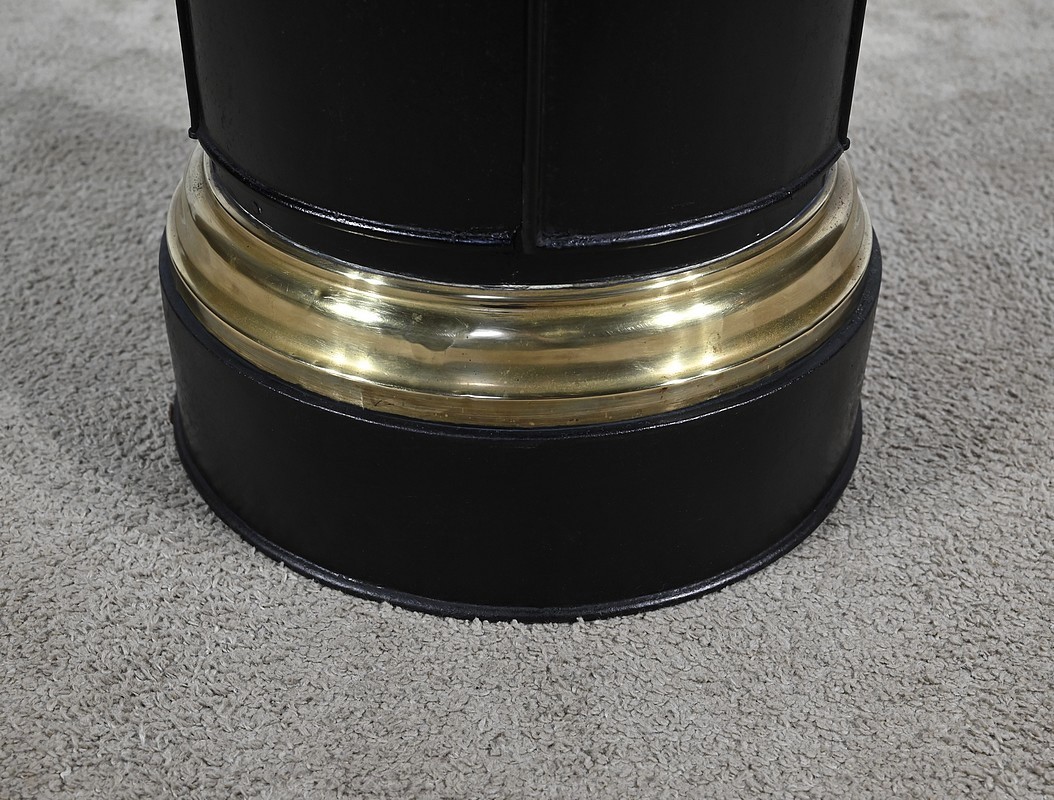 Rare réchaud portatif en tôle peinte et laiton, anciennement utilisé pour garder au chaud assiettes et plats. Des braises étaient installées en partie basse, où l’on peut observer des trous pour la ventilation.