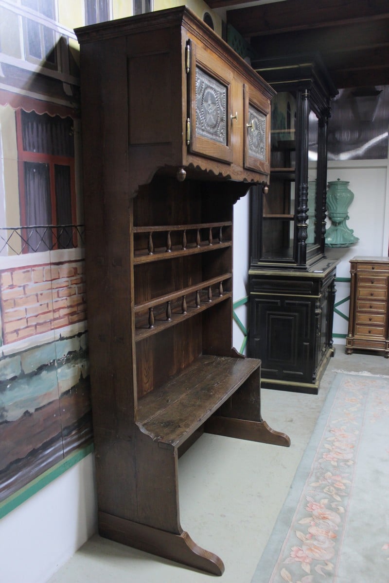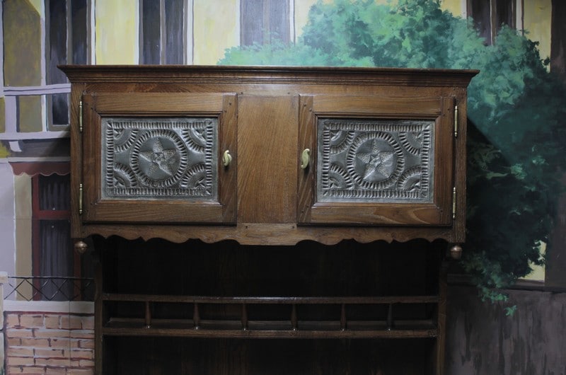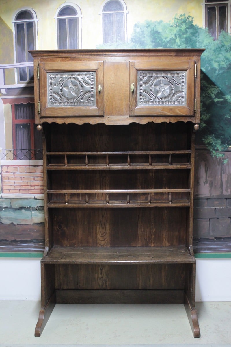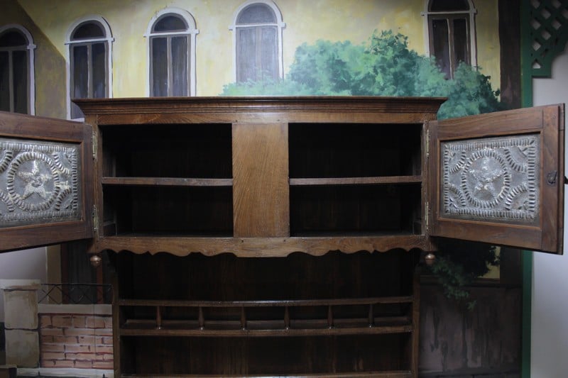 Ce vaisselier normand en chêne massif, datant de la deuxième moitié du XIXe siècle, allie la robustesse et le charme des meubles d’antan. Ce dressoir régional ouvre par deux portes agrémentées de tôle perforée figurant des étoiles entourées de formes géométriques. Ces portes pivotent sur des gonds en laiton et sont équipées de poignées mouvementées en laiton doré également. Dessous, une traverse découpée est accompagnée de toupies à chaque extrémité. La partie centrale du meuble présente deux étagères avec petites balustres et en partie inférieure nous retrouvons une large étagère de rangement.