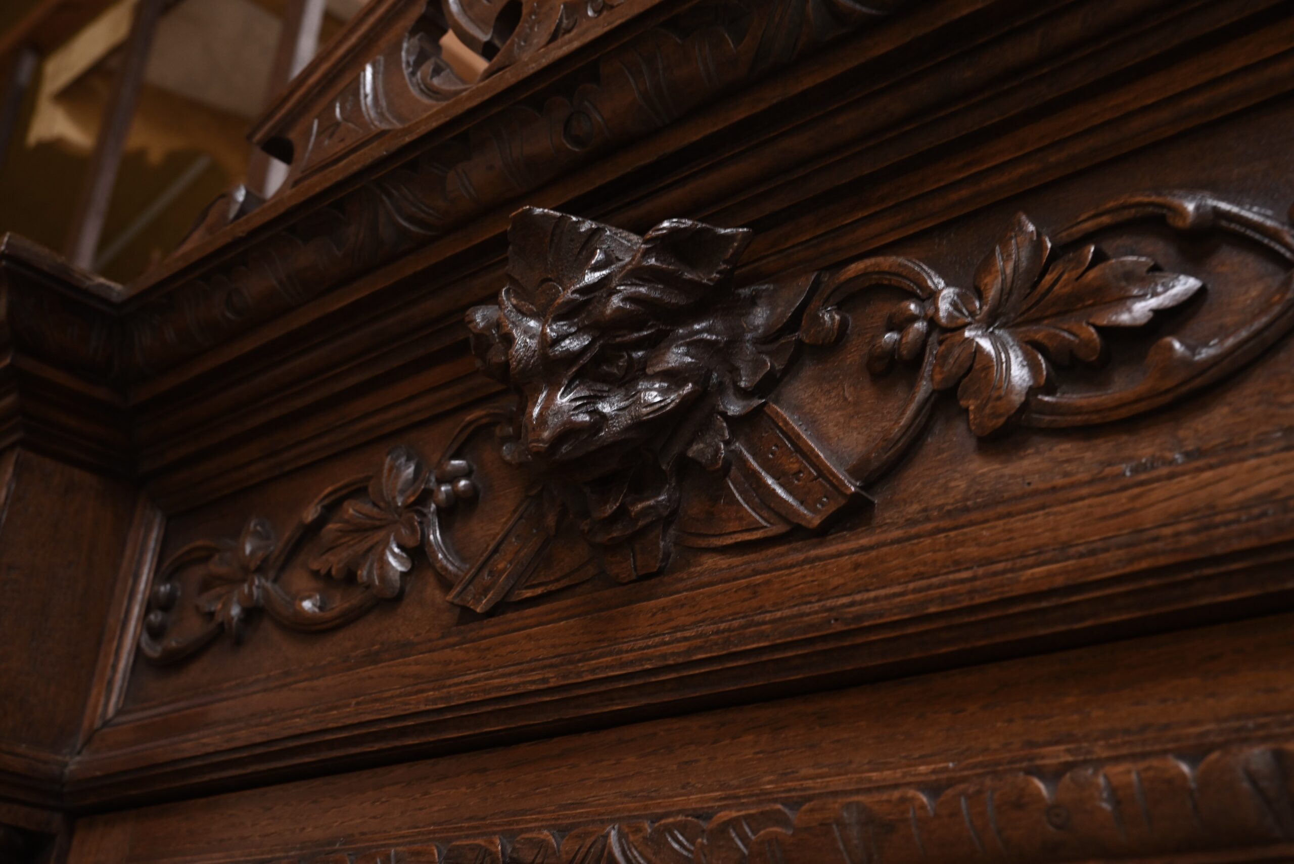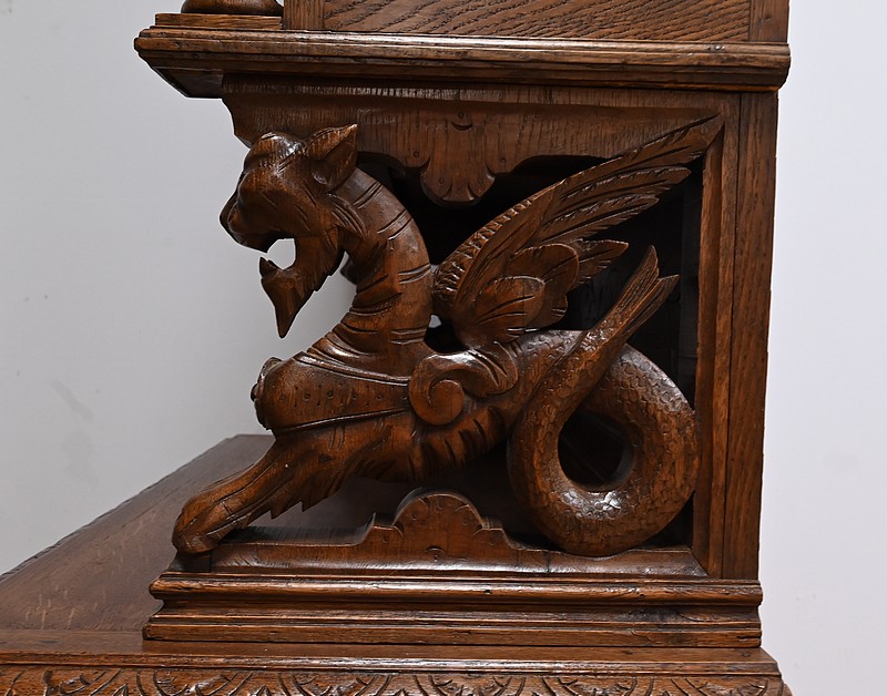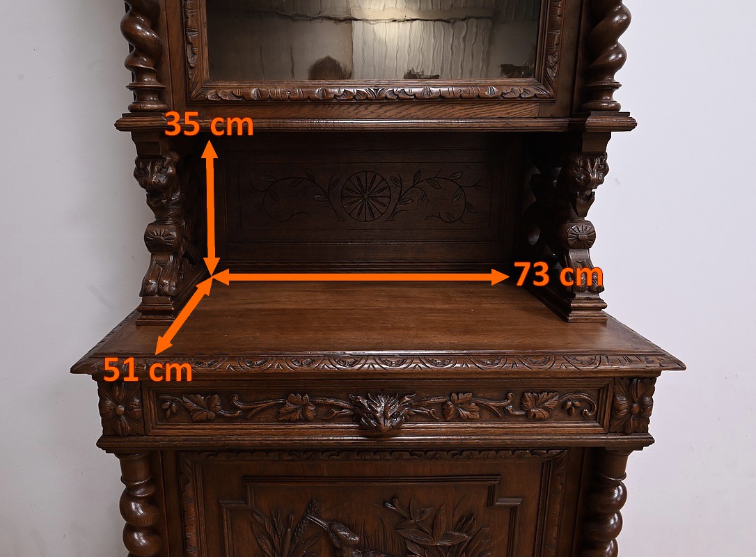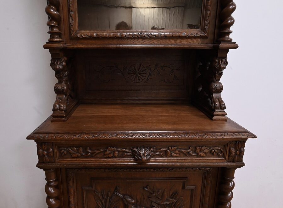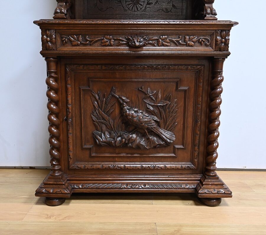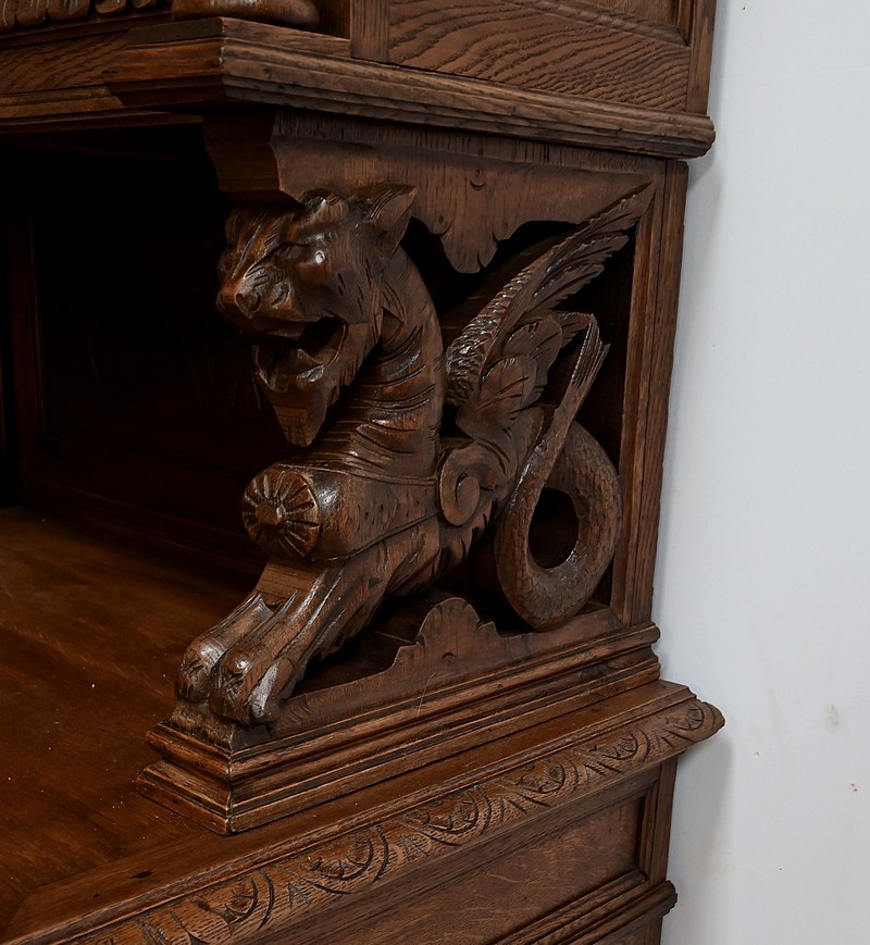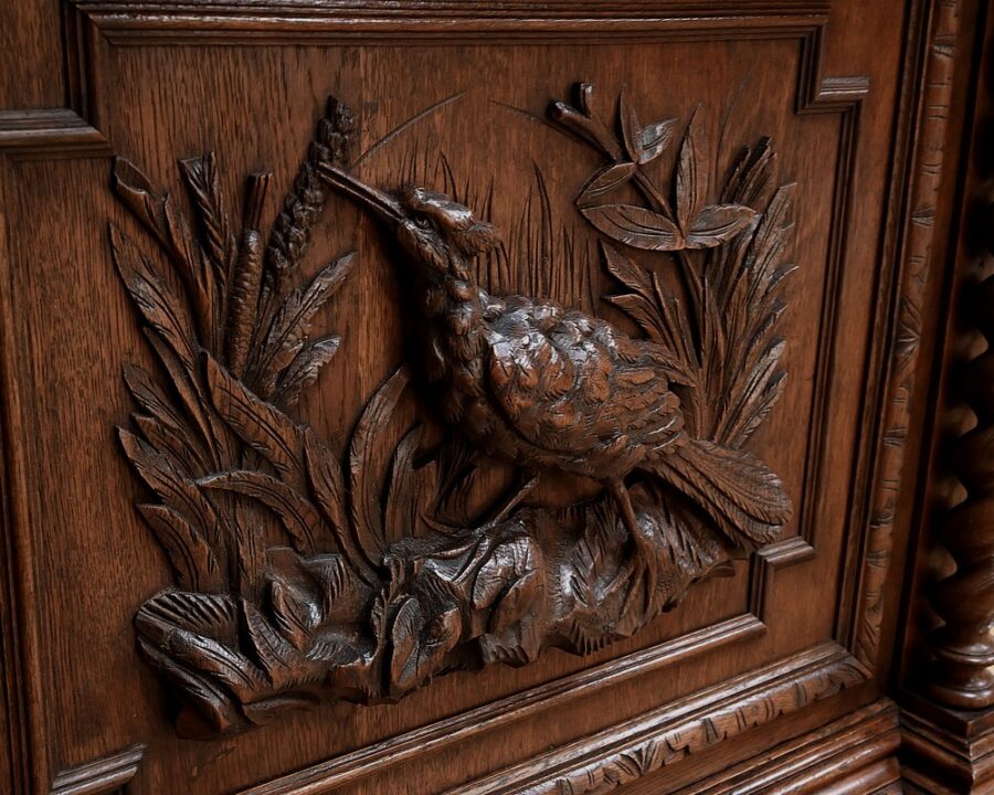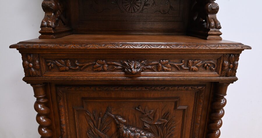 Meuble de style néo-gothique en chêne, ouvrant par un tiroir en ceinture se tirant par une tête de tigre sculptée entourée de branches et de feuilles en relief. En dessous, ce meuble est doté d’une porte avec moulure et cadre avec angles à la grecque. Au centre nous découvrons une bécasse marchant entourée de plantes. De chaque côté, ce meuble possède des colonnes torsadées. D’importantes moulurations forment la base avec ressauts posés sur des pieds galettes.