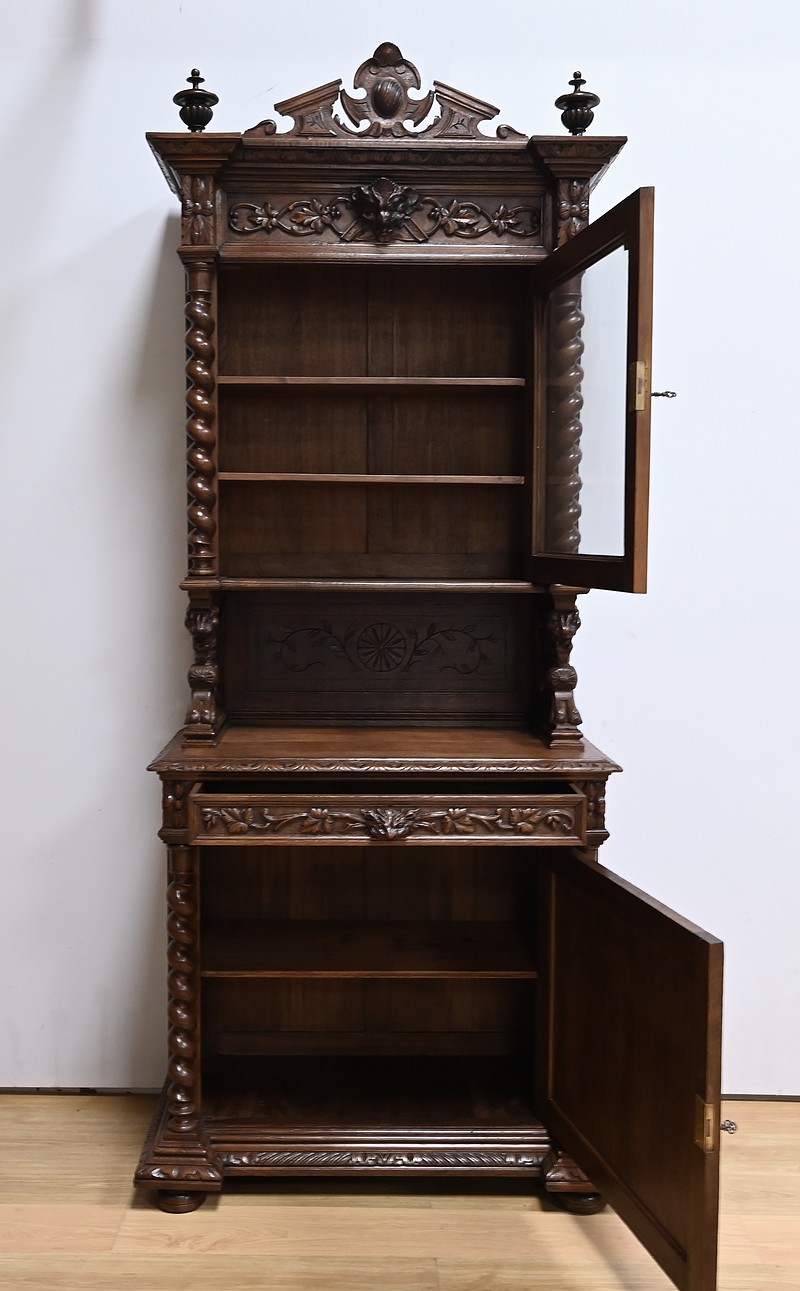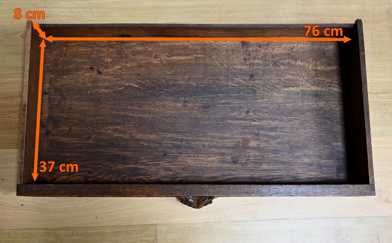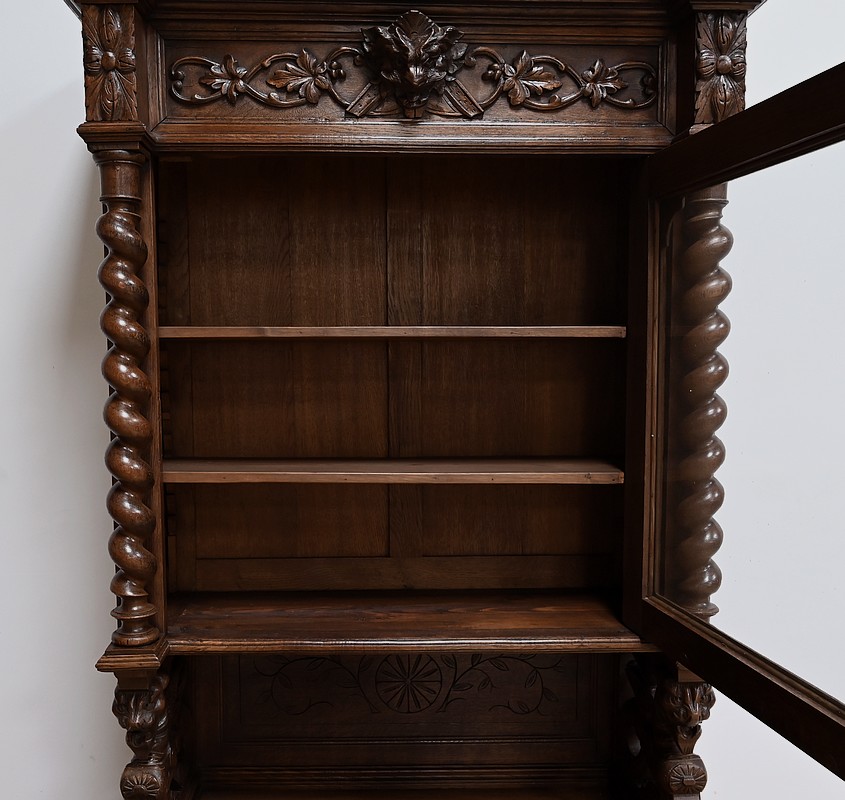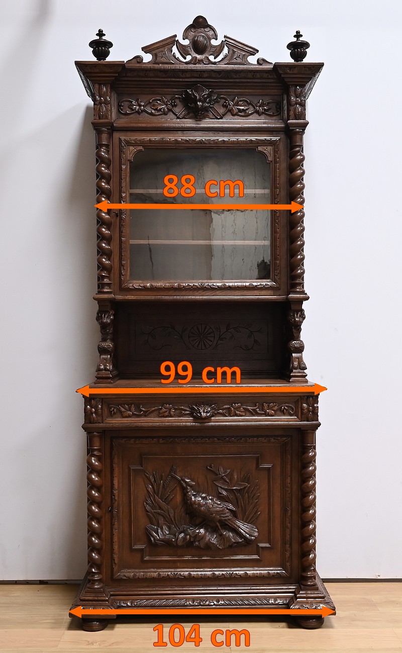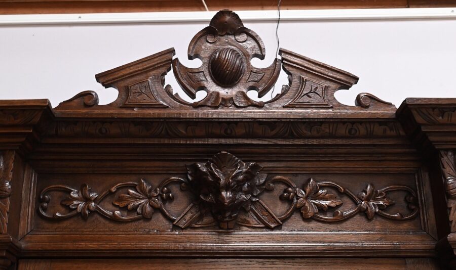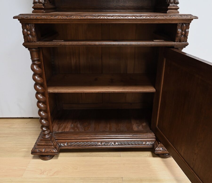 Meuble de style néo-gothique en chêne, ouvrant par un tiroir en ceinture se tirant par une tête de tigre sculptée entourée de branches et de feuilles en relief. En dessous, ce meuble est doté d’une porte avec moulure et cadre avec angles à la grecque. Au centre nous découvrons une bécasse marchant entourée de plantes. De chaque côté, ce meuble possède des colonnes torsadées. D’importantes moulurations forment la base avec ressauts posés sur des pieds galettes.