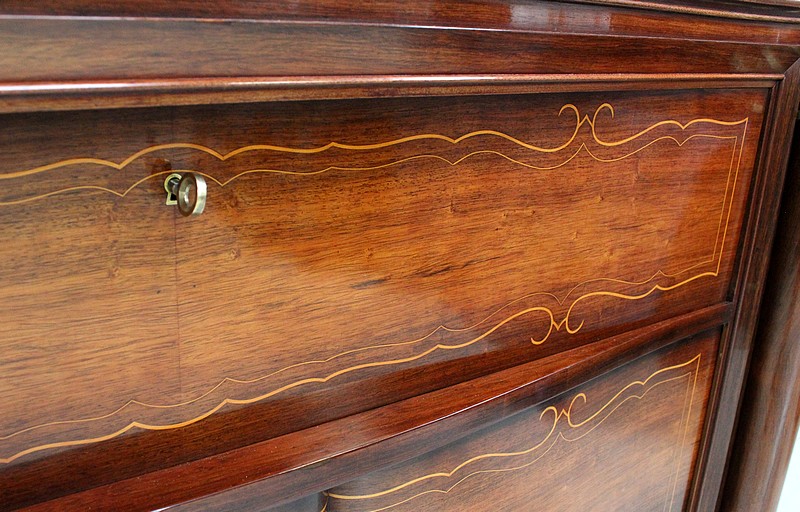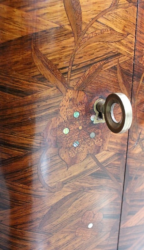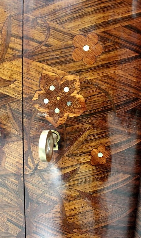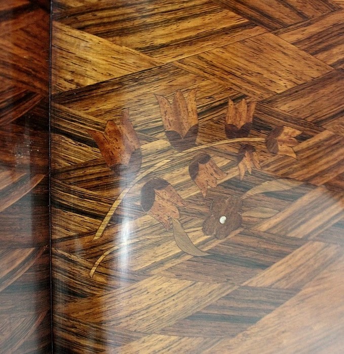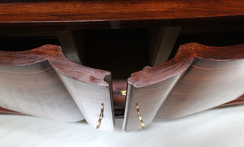 En dessous, ce Buffet est constitué de deux portes à mouvements, Marquetées de Losanges aux teintes variées sur fond de Palissandre de Rio. Des motifs floraux en Nacre et bois divers viennent également agrémenter ces portes, soulignées – tout comme l’abattant de façade – par deux filets de Citronnier aux lignes sinueuses formant encadrements. L’intérieur de cette partie basse offre une niche centrale et, de part et d’autres, des rangements compartimentés par des étagères ornées de frises sur leurs chants visibles.