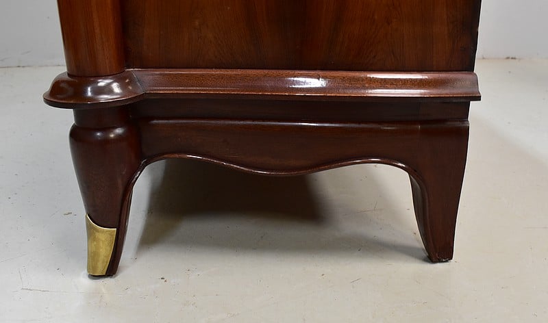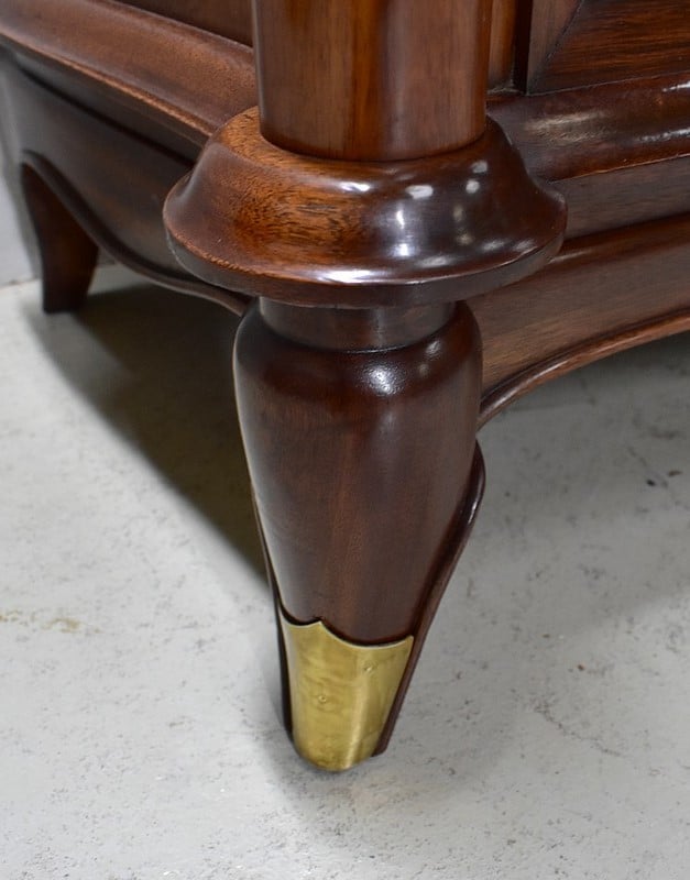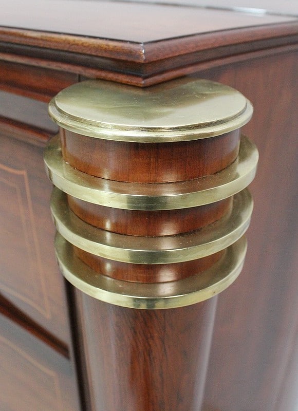 Deux fortes Colonnes étrécies vers le bas constituent les montants avants de ce meuble Insolite. Elles sont sommées de bagues en laiton et se terminent par des pieds ouvragés avec plaques du même alliage.