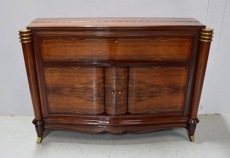 Ce somptueux Buffet est à la fois singulier et parfaitement en accord avec les tendances actuelles. Il a bénéficié d’un travail de conception prestigieux et de bois précieux inaltérables, qui étaient les matériaux de prédilection de Jules Leleu, puisque expert dans l’aménagement de Paquebots au siècle dernier.