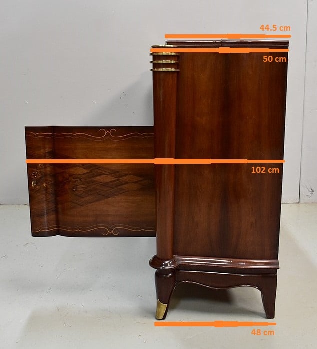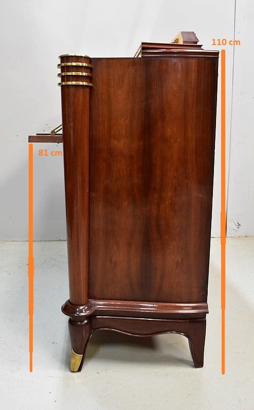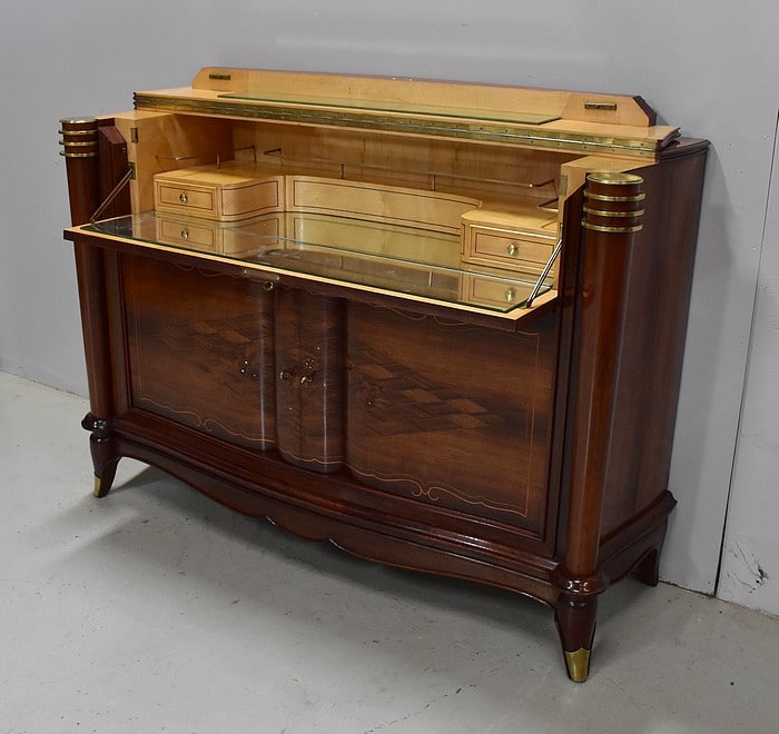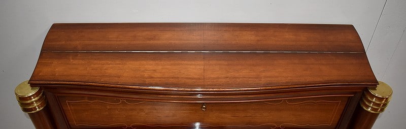 Il ouvre sur le dessus et en façade par un double abattant révélant un remarquable intérieur en Sycomore garni de Miroirs au Mercure d’origine. Cet espace se compose d’une partie concave en retrait et de deux petits tiroirs latéraux, enjolivés de filets d’Amarante. Il est également doté de Galeries en laiton, à usage initial de rangements pour verres, et qui permettent d’imaginer une fonction de Bar à ce meuble inclassable.