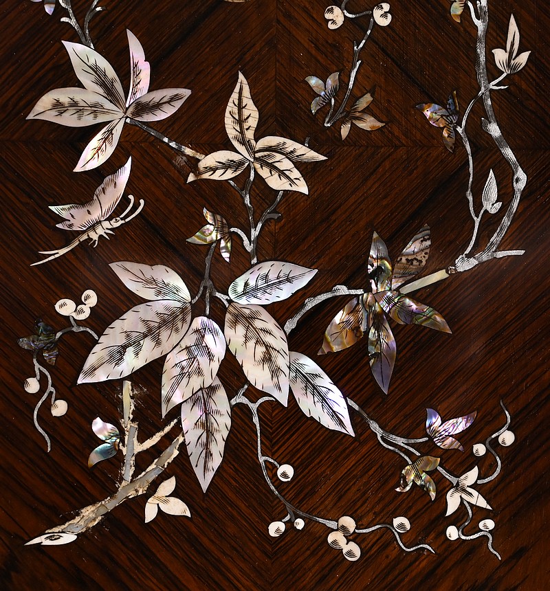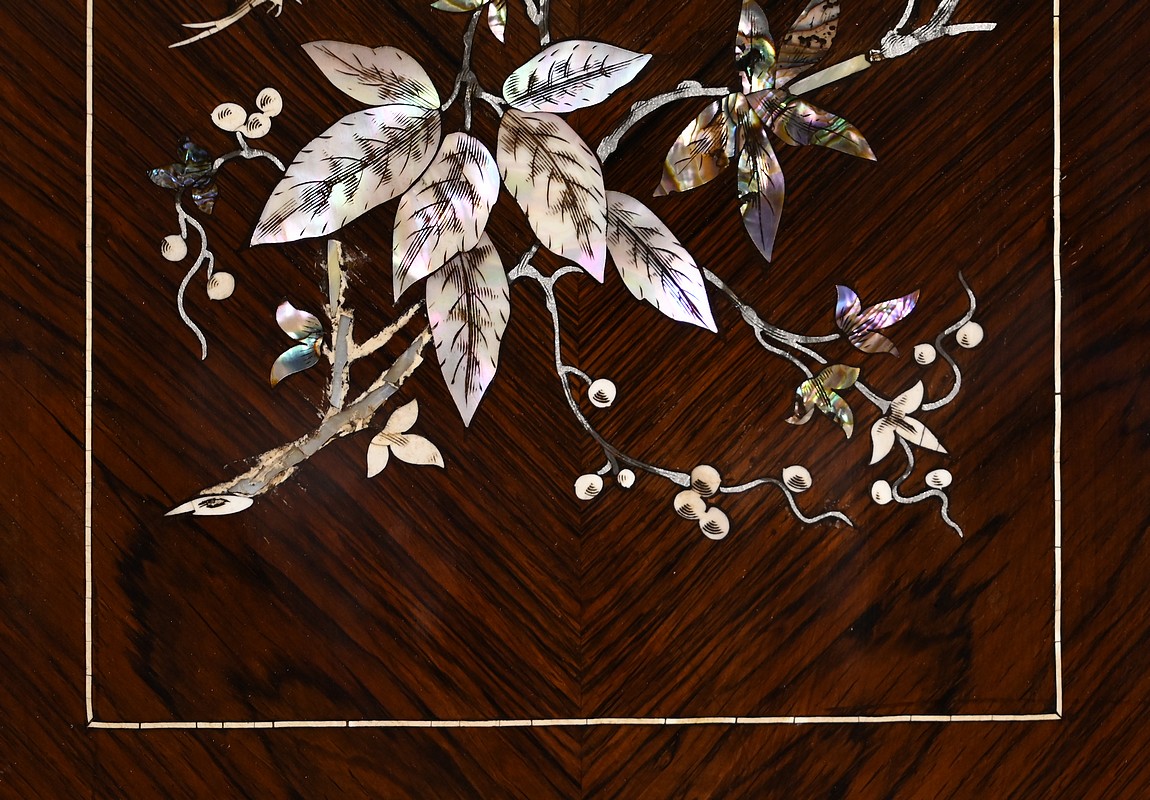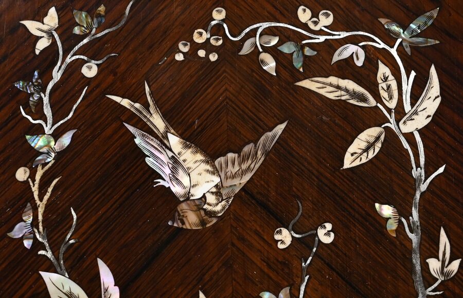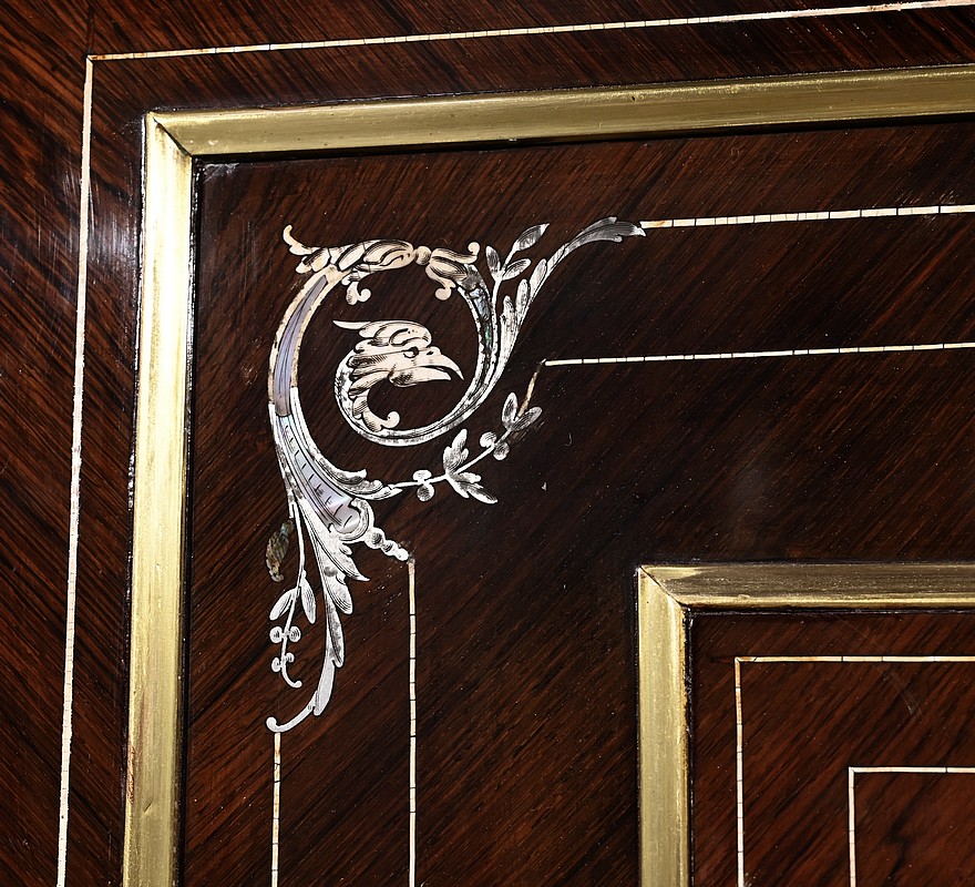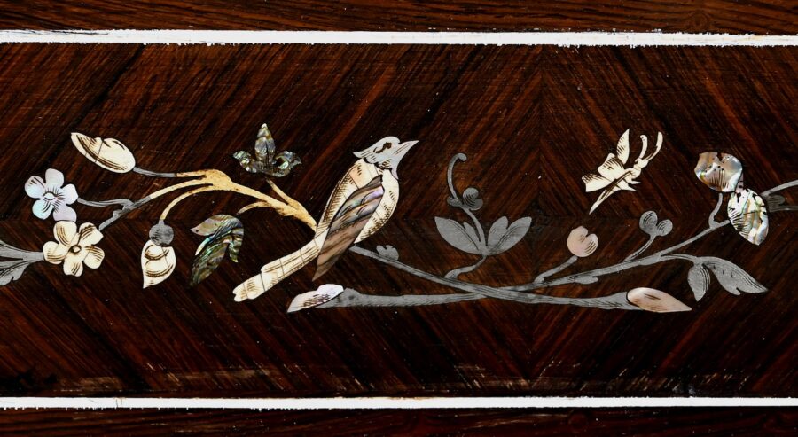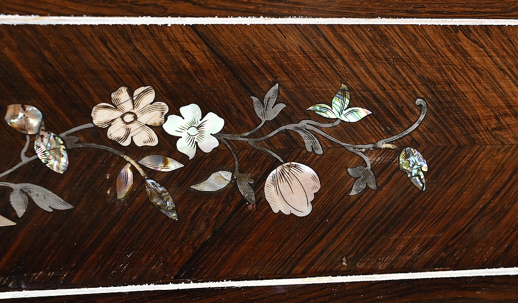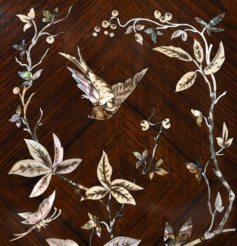 Le placage de palissandre est disposé en ailes de papillons. Aux angles, en partie haute, nous retrouvons des compositions de nacres formant des têtes de volatiles entourées de feuilles.