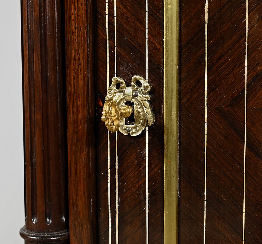 De chaque côté de cette porte, deux colonnes encastrées, tournées et à cannelures arrêtées sont ornées de bagues en laiton en partie haute et basse.
